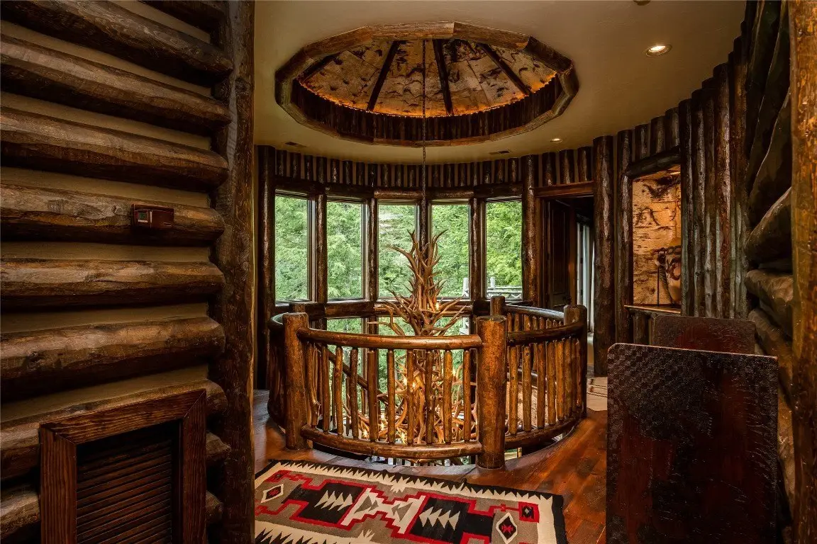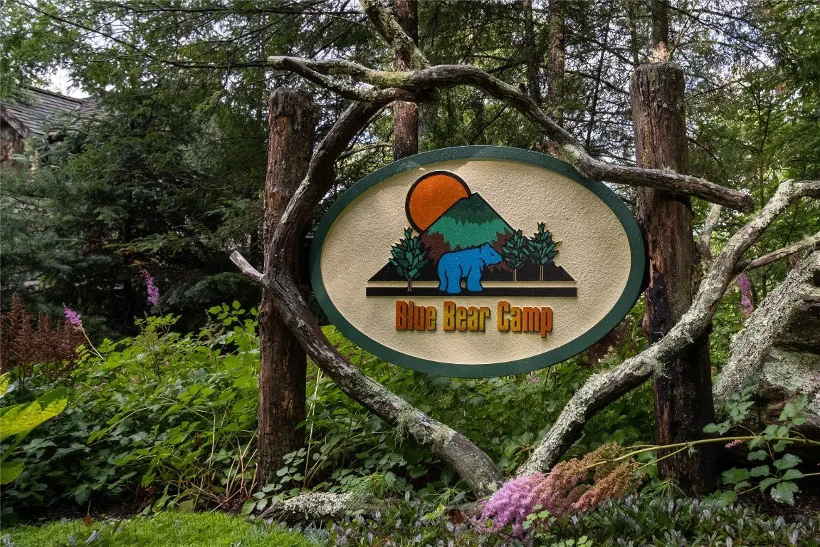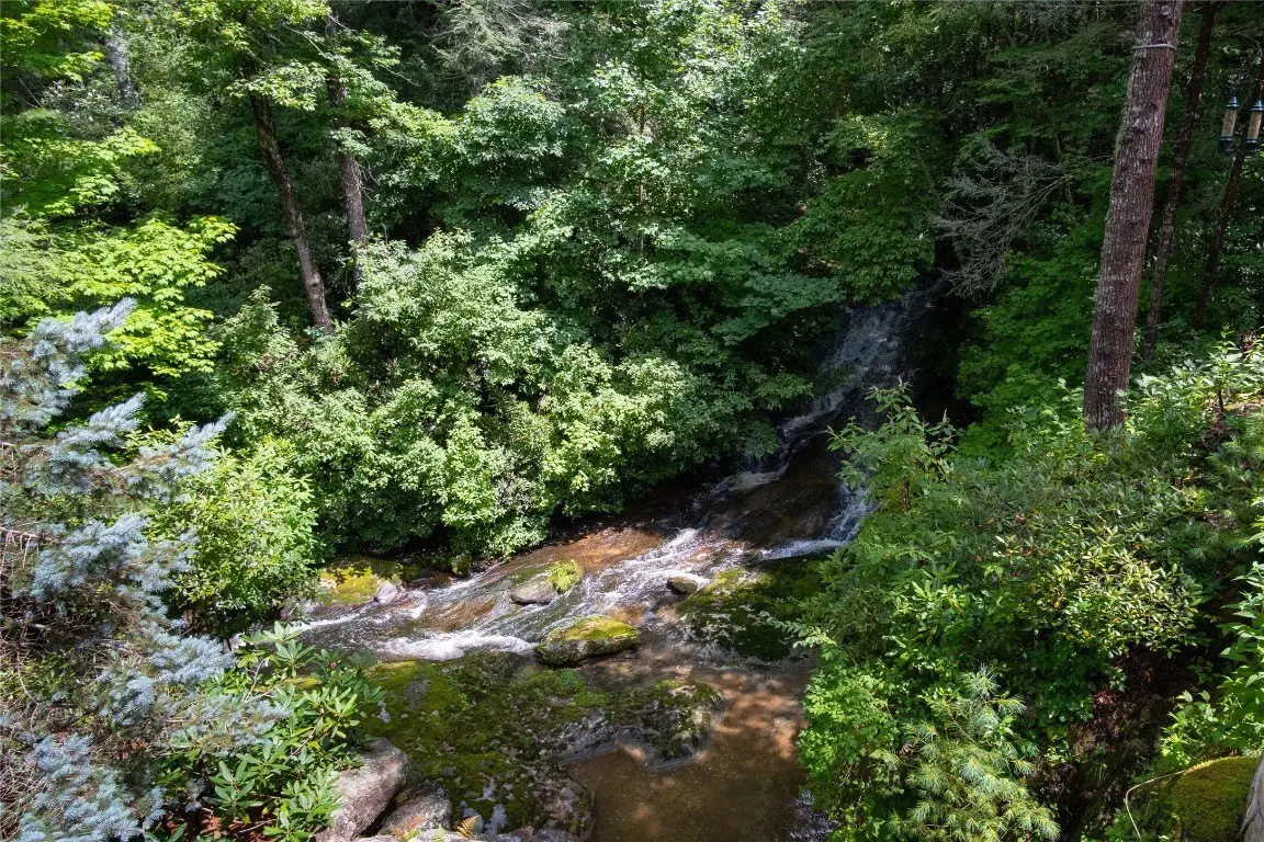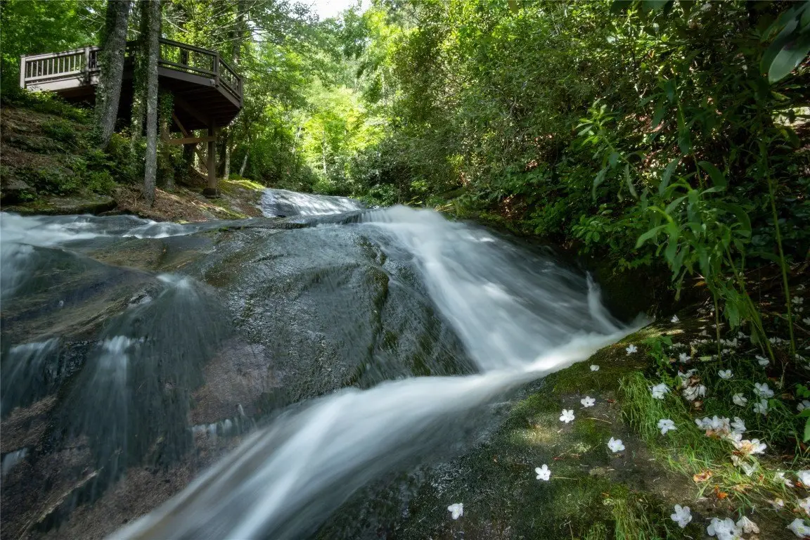 Just minutes from the shopping and fine dining of downtown Cashiers, Blue Bear Camp is the ultimate Adirondack-style mountain lodge. This prime property borders the Nantahala National Forest, ensuring privacy and abundant wildlife. Another world awaits in the dream-like setting amid the wild Chattooga River, flowering landscaping, a sparkling waterfall, and lush forest, all against the stunning backdrop of Whiteside Mountain and Devil's Courthouse. Reminiscent of the great camps in the early 1900s, the rustic decor is warm and welcoming with natural wood details such as pine logs with golden chinking, wax-rubbed reclaimed heart pine floors, and a grandiose circular log staircase surrounding a seven-foot antler chandelier. The staircase is a masterpiece of engineering, constructed from Colorado Ponderosa pine over three months. Much of the custom furniture and details were built by local craftsmen on site. Other unique finishes were created by artisans from across the country, using natural materials such as mica, aged copper, shed elk antlers from Wyoming, Canadian birch bark, wormy chestnut, and turquoise. The stunning stonework and multiple fireplaces throughout the home were built from Tennessee fieldstones, many of which reveal 300,000-year-old fossils. In addition to the private guest quarters with a kitchenette and laundry room, the sprawling three-story home with an elevator offers an abundance of space for family and guests to explore, including a sunroom, library, an artist studio, game room, wine cellar, a resplendent home theater, and a fitness room with a sauna and steam room. Nature lovers will revel in the magical surroundings and fresh mountain air on the covered porch amid sights and sounds of the rushing waterfall. There's something for everyone to enjoy in an area offering residents access to the countless natural resources and opportunities for outdoor recreation such as hiking, fly fishing, biking, skiing, and golf.