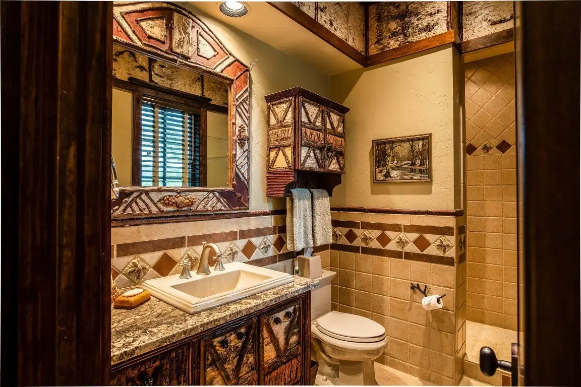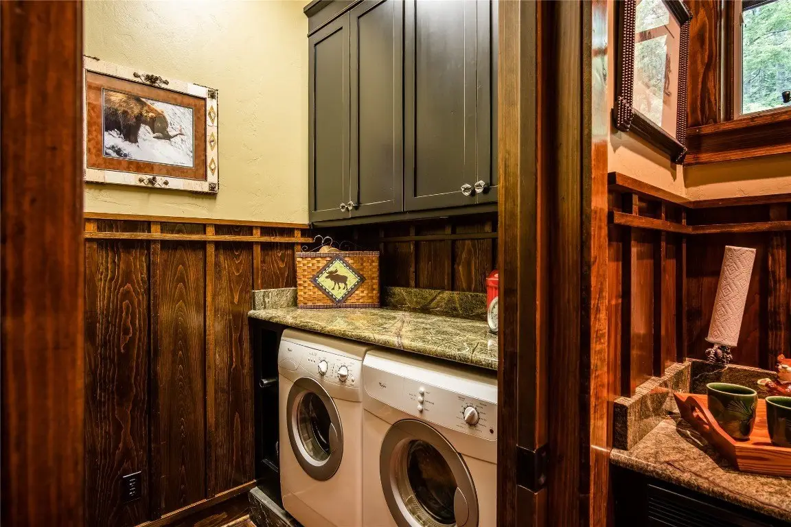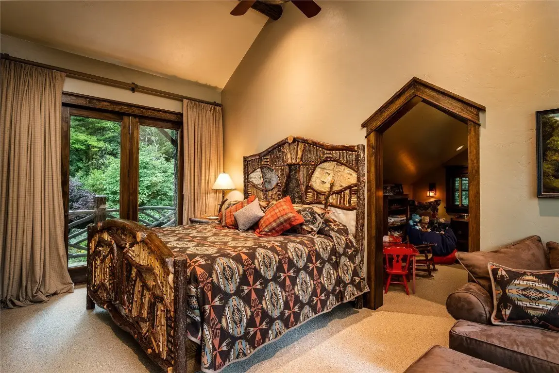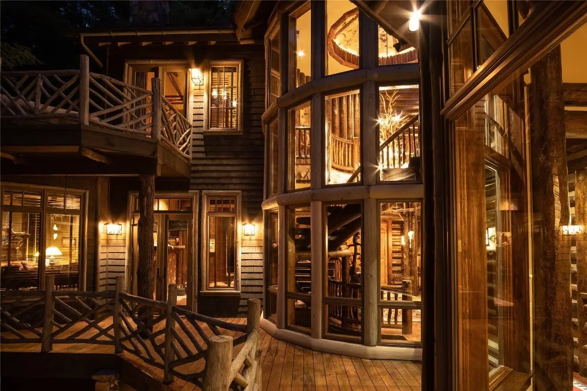 Just minutes from the shopping and fine dining of downtown Cashiers, Blue Bear Camp is the ultimate Adirondack-style mountain lodge. This prime property borders the Nantahala National Forest, ensuring privacy and abundant wildlife. Another world awaits in the dream-like setting amid the wild Chattooga River, flowering landscaping, a sparkling waterfall, and lush forest, all against the stunning backdrop of Whiteside Mountain and Devil's Courthouse. Reminiscent of the great camps in the early 1900s, the rustic decor is warm and welcoming with natural wood details such as pine logs with golden chinking, wax-rubbed reclaimed heart pine floors, and a grandiose circular log staircase surrounding a seven-foot antler chandelier. The staircase is a masterpiece of engineering, constructed from Colorado Ponderosa pine over three months. Much of the custom furniture and details were built by local craftsmen on site. Other unique finishes were created by artisans from across the country, using natural materials such as mica, aged copper, shed elk antlers from Wyoming, Canadian birch bark, wormy chestnut, and turquoise. The stunning stonework and multiple fireplaces throughout the home were built from Tennessee fieldstones, many of which reveal 300,000-year-old fossils. In addition to the private guest quarters with a kitchenette and laundry room, the sprawling three-story home with an elevator offers an abundance of space for family and guests to explore, including a sunroom, library, an artist studio, game room, wine cellar, a resplendent home theater, and a fitness room with a sauna and steam room. Nature lovers will revel in the magical surroundings and fresh mountain air on the covered porch amid sights and sounds of the rushing waterfall. There's something for everyone to enjoy in an area offering residents access to the countless natural resources and opportunities for outdoor recreation such as hiking, fly fishing, biking, skiing, and golf.