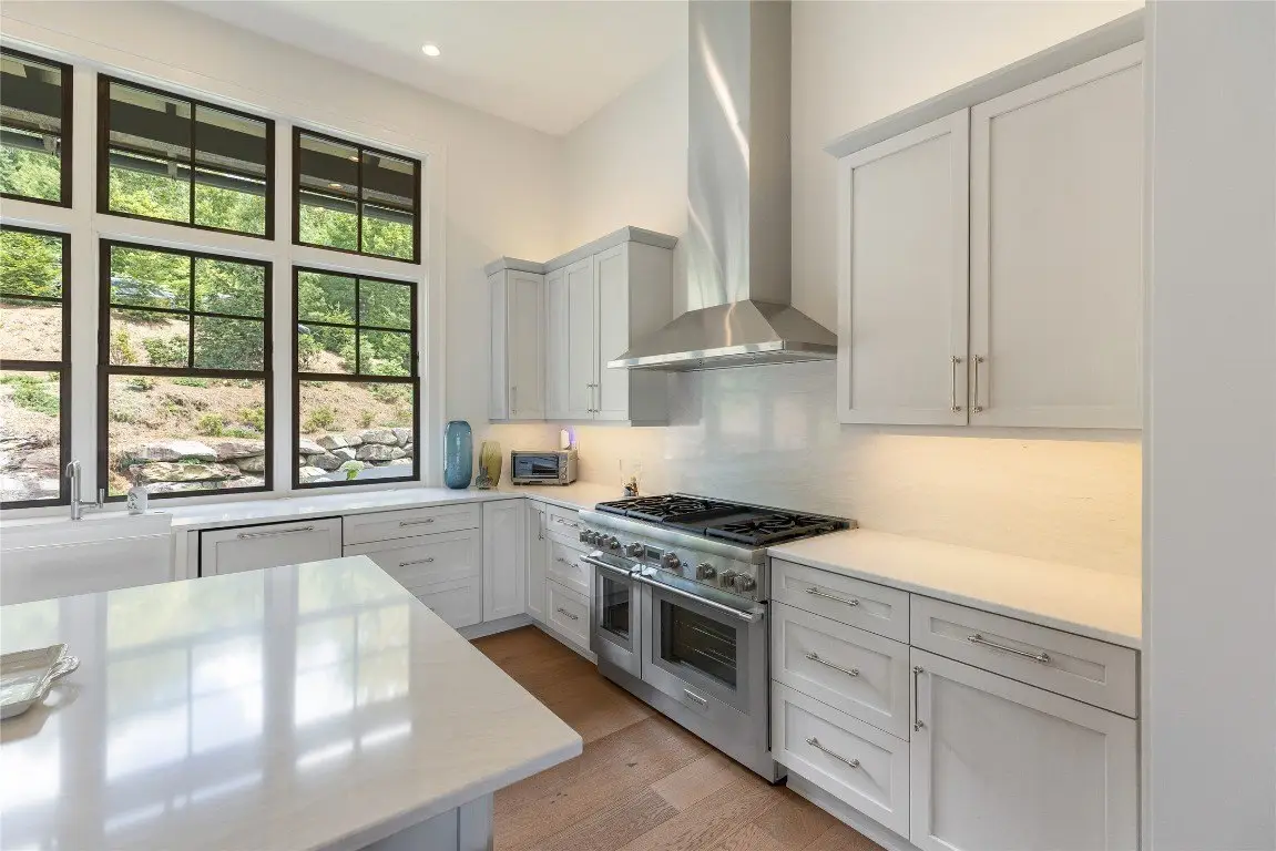 Perched at an elevation of 3,700 feet, this masterfully appointed four-bedroom, four-and-a-half-bathroom residence offers refreshing summer breezes and sweeping, unobstructed vistas of Whiteside Mountain and Devil’s Courthouse — an extraordinary backdrop for a life of refined mountain elegance blended with understated luxury. Encompassing 4.4 acres of verdant native flora and directly adjoining thousands of protected acres within the Nantahala National Forest, this home promises unparalleled privacy and natural splendor. From the generous, covered deck with a wood-burning stone fireplace — perfect for cool evenings under the stars — to the dramatic great room where soaring timber-beam ceilings, a grand stone fireplace, and full accordion glass doors invite the outdoors in, every detail of this property has been considered for both luxury and livability. The open-concept kitchen and dining space — equipped with high-end Thermador appliances, a generous island seating bar, and a butler’s pantry — blend functionality with timeless sophistication, while the adjacent wet bar ensures seamless hosting. The main level of the property features a gracious primary suite with dual walk-in closets, a spa-inspired ensuite bathroom, and access to the deck, plus two additional guest suites, a half bathroom, a dedicated laundry room, and a welcoming foyer that sets a tone of quiet grandeur. The upper level includes a second primary suite — ideal for guests or multigenerational living. Located within the gated enclave of Chattooga Cliffs — just 2.5 miles from the heart of vibrant Cashiers — this property offers the tranquility of a secluded mountain retreat with immediate access to premier boutiques, restaurants, and cultural and recreation amenities in nearby Highlands as well as throughout Western North Carolina’s Jackson and Macon counties. Offered fully furnished with tastefully curated pieces, this impeccably maintained turnkey residence presents a rare opportunity to step into a refined mountain lifestyle.