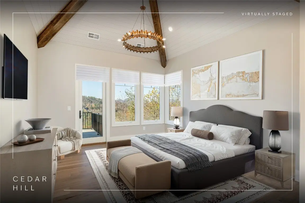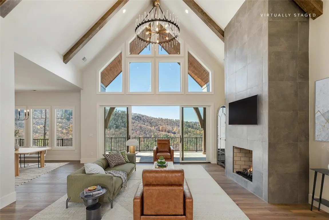Discover a newly completed, custom-designed residence in Cedar Hill - one of the Highlands-Cashiers Plateau's most sought-after gated communities - that offers refined mountain living at its finest. Perfectly positioned just minutes from both Cashiers and Sapphire, this move-in-ready home combines sophisticated design, exceptional craftsmanship, and a seamless floor plan tailored for modern comfort and entertaining. Clean architectural lines, curated landscaping, and a welcoming mountain aesthetic set the stage for what awaits inside. Expansive windows and glass doors fill the interiors with natural light, framing breathtaking long-range views across the valley, with Big Sheepcliff Mountain rising as a dramatic backdrop. The main level features an open-concept living area with soaring vaulted ceilings, a striking fireplace, and a chef's kitchen with premium finishes and appliances. Two distinct outdoor living spaces extend this level - a covered porch with a wood-burning fireplace for year-round enjoyment, and a covered veranda perfect for relaxing in the cool mountain air. The primary suite on the main level offers a serene retreat, thoughtfully designed for privacy and comfort. The lower level includes a spacious family room with a wet bar, three guest bedrooms, and a bonus room. Multiple covered decks, all featuring stone floors, including one with an additional wood-burning fireplace, create a true indoor-outdoor lifestyle. A two-car garage enhances both the home's architectural appeal and everyday functionality. Blending timeless mountain design with modern luxury, this Cedar Hill retreat embodies mountain living at its finest. Virtually staged photos are included to showcase the potential of the property.