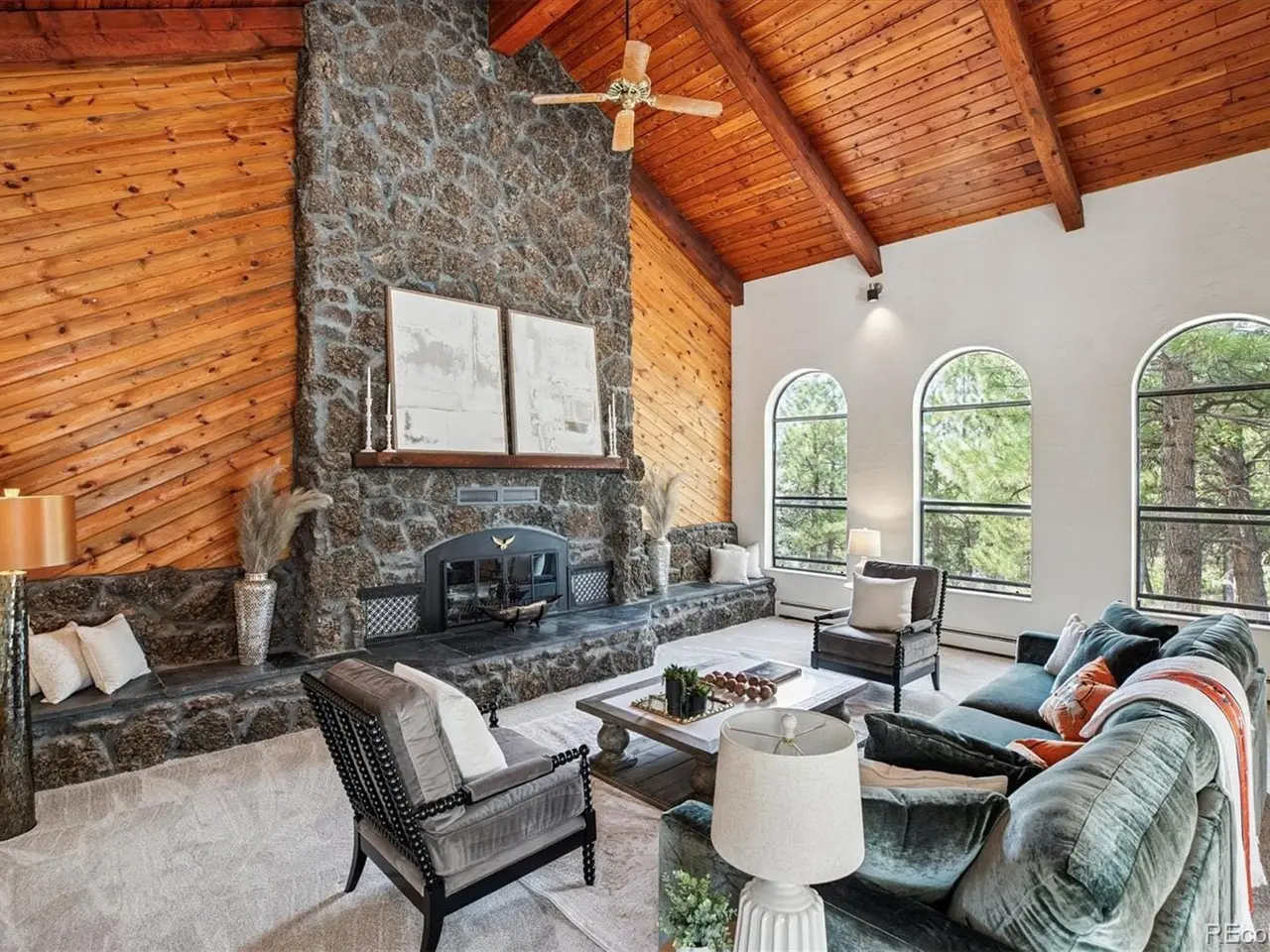 Mediterranean Masterpiece on 5 Acres of Forested Beauty in Castle Rock's Premier Oak Hills Neighborhood. Spanish Revival architecture; stucco walls, Spanish tiles, wood beams, wrought iron, arches & bell tower. Private lot, stable, sports court, sun deck, BBQ pavilion & center courtyard. Gated entry, dramatic circular drive, attached & detached garage or workshop. Grand 2 story foyer; arched windows frame the inner garden, tiled floor, floating staircase & old world chandelier. Thoughtful updates w/ over $250,000 in enhancements are blended w/ classic design features. New Spanish Modern inspired kitchen; arched hall entry, island w/ eating space for 6, luxury LG appliance package, farm sink, quartz counters, brushed gold hardware, walk-in pantry, eating space & deck. Spectacular formal dining room; soaring two-story ceiling & hand-painted Tiffany-style windows. New carpet or new floors throughout. Above; 2 Private upstairs bedrooms each w/ new luxurious en-suite baths w/ marble floors. Access to balcony overlooking the property, surrounding hills & open skies. Great Room; 2 story stacked stone fireplace, stone hearth, wood clad ceiling, arched windows, tiki bar & projection tv wall. Ground floor primary suite; fireplace, coffee bar, sliding doors w/ private patios. Spa like 6 piece en-suite bath; steam shower, soaking tub, heat lamps, large walk-in closet. Finished walkout basement w/ tiled bar, brick clad fireplace. Walkout to the central courtyard or backyard outdoor living room. Al fresco dining overlooking your private resort; covered pavilion w/ wood grill-fireplace for. Set in northern Castle Rock next to Lone Tree. Privacy; 50 mature Ponderosa Pines & native Oak. Step out of the city and into a world of timeless elegance through this enchanting Mediterranean estate. Located only 5 minuets from the Ridgegate Light Rail Station, easy access to I-25, nearby Park Meadows, DTC, Centennial Airport, Skyridge Hospital, Open Space, entertainment and restaurants.