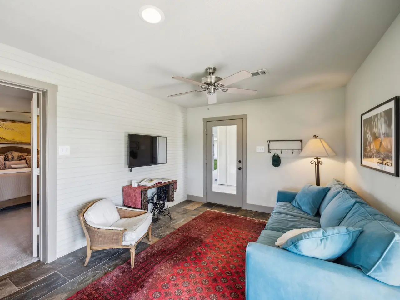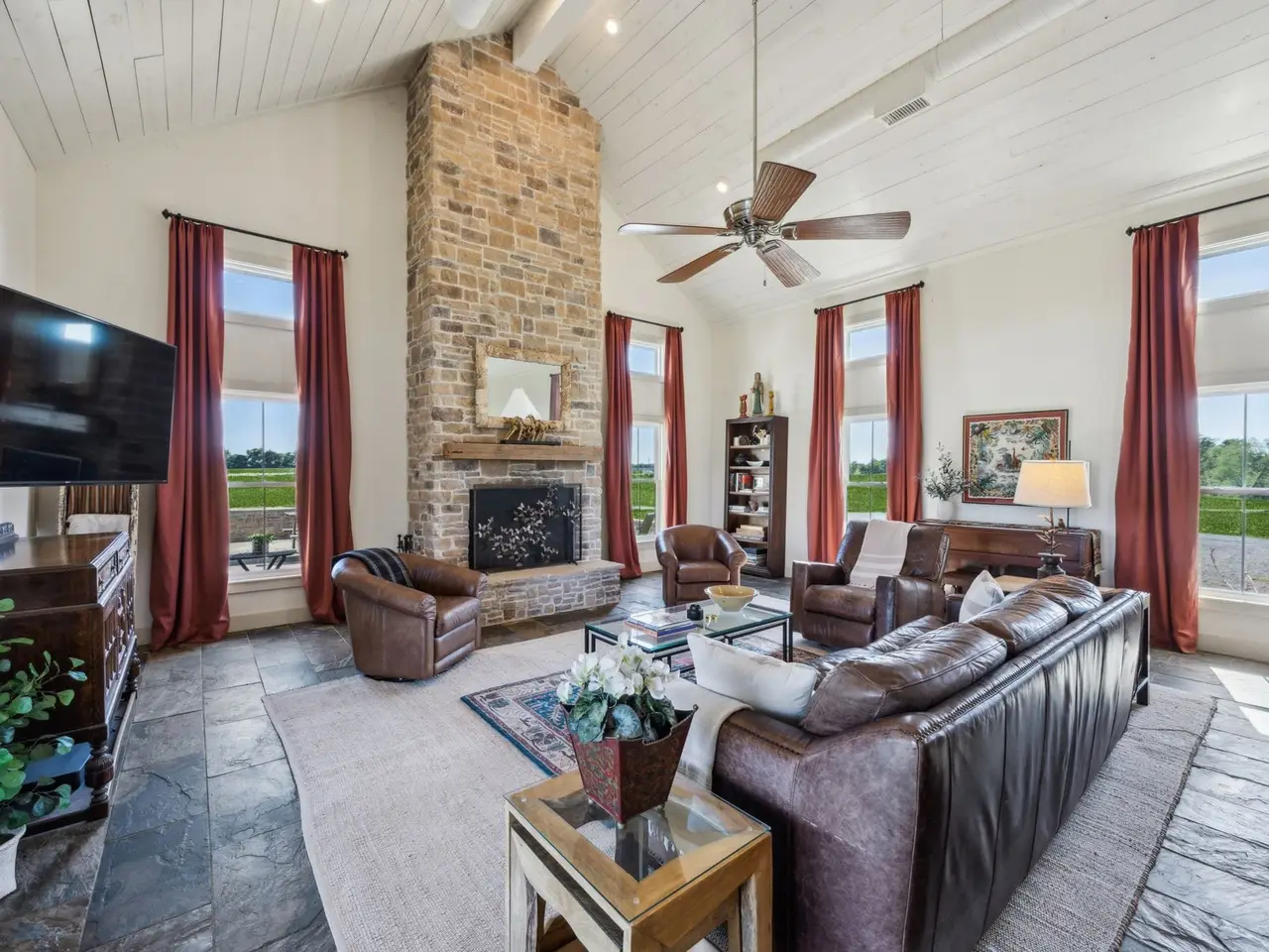 Welcome to Circle B Retreat, a rare 46-acre ag-exempt ranch just 50 miles from Dallas, perfectly planned to escape the city. Creatively designed with a nod to the Hill Country, this carefully planned ensemble of buildings is connected by an extensive wrap-around porch and courtyard encouraging easy indoor - outdoor flow. Inside, slate floors extend through the main living area with vaulted ceilings and a stone fireplace. The kitchen is built to host large gatherings with an expansive island and extra-large pantry for storage. A separate office with mini-split offers flexibility, while multiple dwellings make it a perfect multi-generational living setup. A working art studio offers lots of space for creative activities or could easily be converted to sleeping spaces. Enjoy expansive sky views, sunsets, stars, and reflections in the pond from the outdoor fireplace and open patio area. The private drive wraps around the home and barn providing unlimited parking. The sturdy, pole-built, 5-stall barn with tack and storage rooms, shelters horses and other animals, and - or a place to store ATVs or dirt bikes. Wooded spaces invite exploration, and the homes set-back location ensures privacy and safety for kids and animals. Evenings bring chirping frogs and the coyote chorus under the Texas stars. Welcome home!