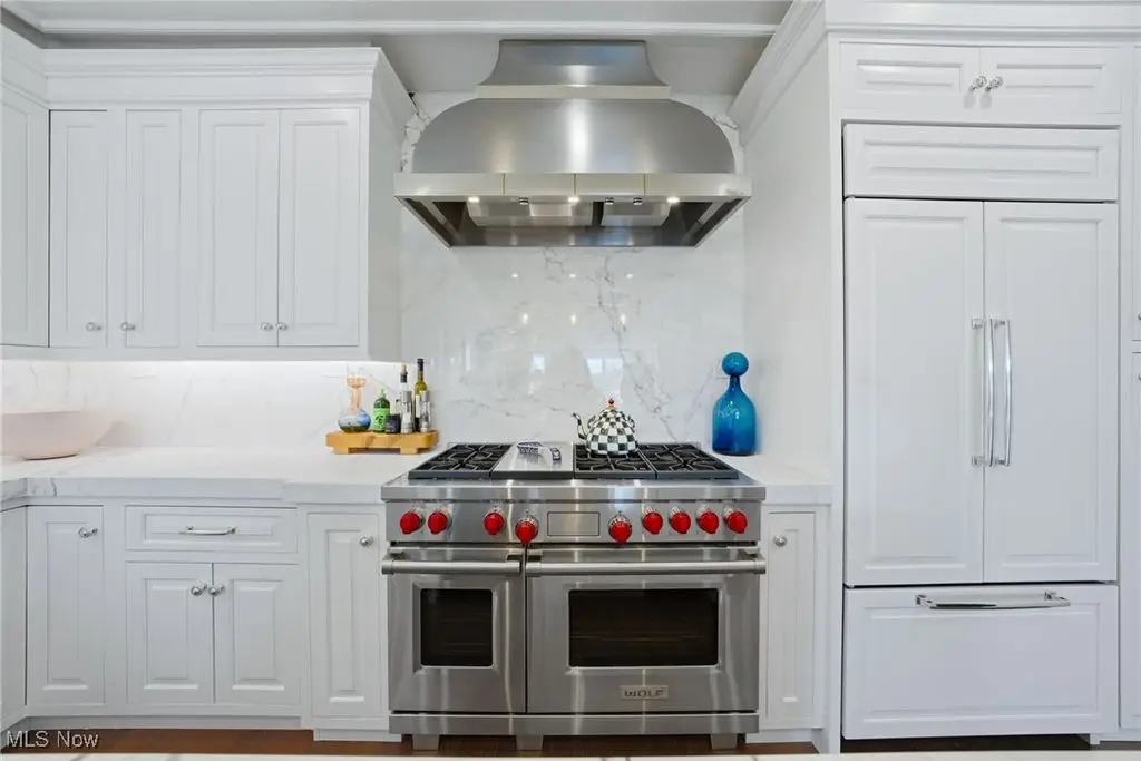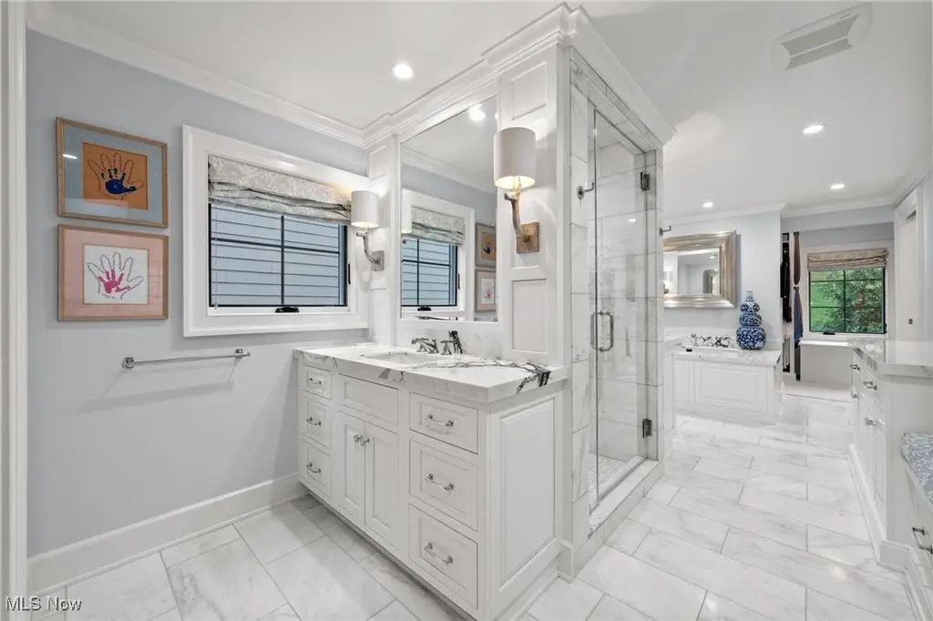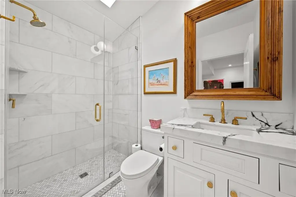 Located in the heart of Chagrin Falls, this extraordinary 4 level residence has been renovated and decorated to utter perfection by the current owner. No expense was spared and no detail was overlooked throughout. A charming and beautifully landscaped courtyard welcomes one into the foyer through a custom front door. One will immediately notice the exquisite decor, highest end finishes, and the meticulous attention to detail. On this entry level there is an elevator with access to all 4 floors, a home gym with rubber floor, and a grand staircase with a custom runner. The main level of this home is an entertainer's dream and features the most extraordinarily designed dream kitchen. Here you will find the highest level of finishes including custom inset cabinets, a huge center-island, Calcutta Gold marble countertops, professional stainless-steel appliances, a wine cooler, ice maker, and spectacular decorative hood. Off of the kitchen is a beautiful bar area which is perfect for entertaining. The main living area includes a fabulous dining room with custom banquette which opens into the main great room. Here you will find a magnificent raised hearth which is flanked by custom built-ins and floor to ceiling windows which overlook the village. The owner's suite in this unit occupies an entire floor and is the definition of "Luxury!" The bedroom is a quiet retreat, the marble bathroom is second to none (steam shower, dual vanities, heated floor, heated towel rack, Porto Romano sconces, and jetted tub), two walk-in dressing rooms, and even a private laundry room. The top level is a retreat for guests with a bedroom area, media room, spectacular bathroom, and access to the outdoor veranda. This beautiful, covered terrace has a stone fireplace and built-in bar area with sink. This one-of-a-kind residence is truly a showplace.