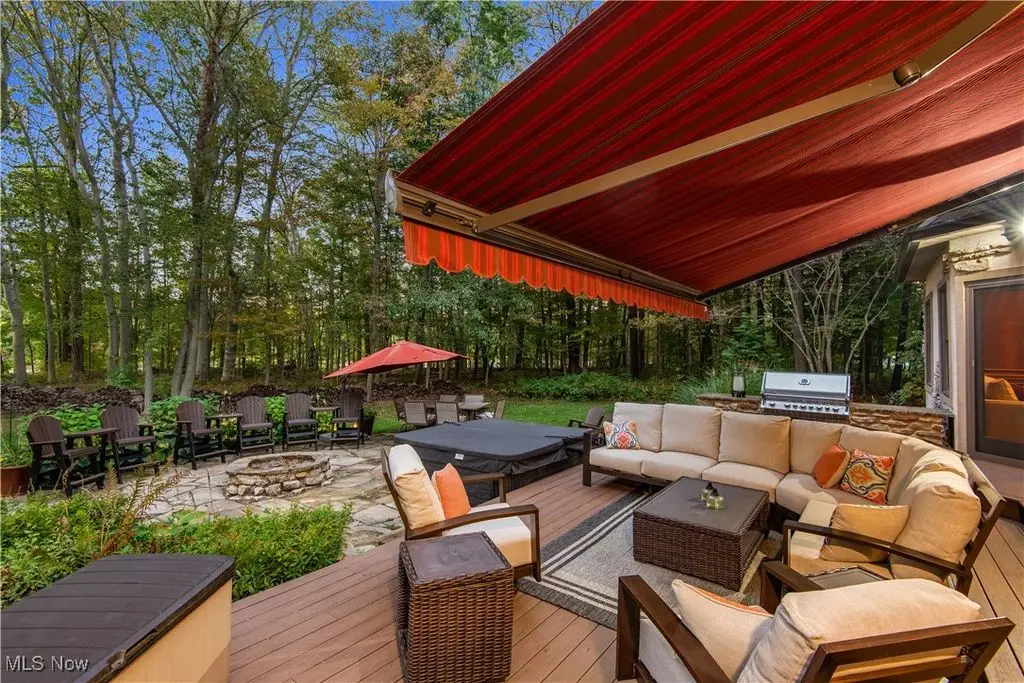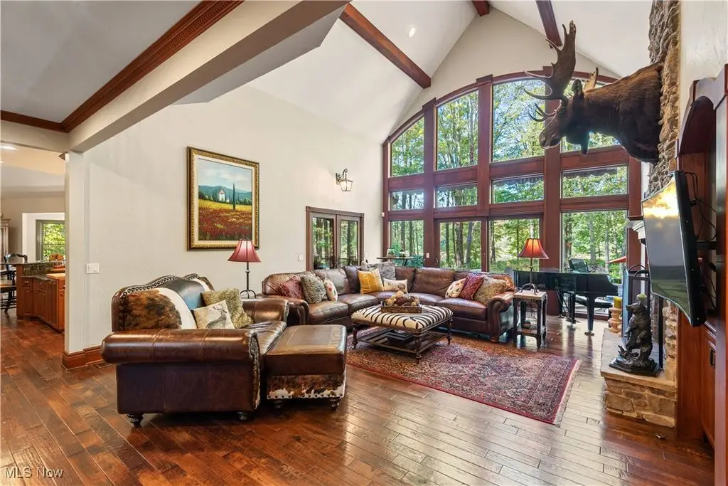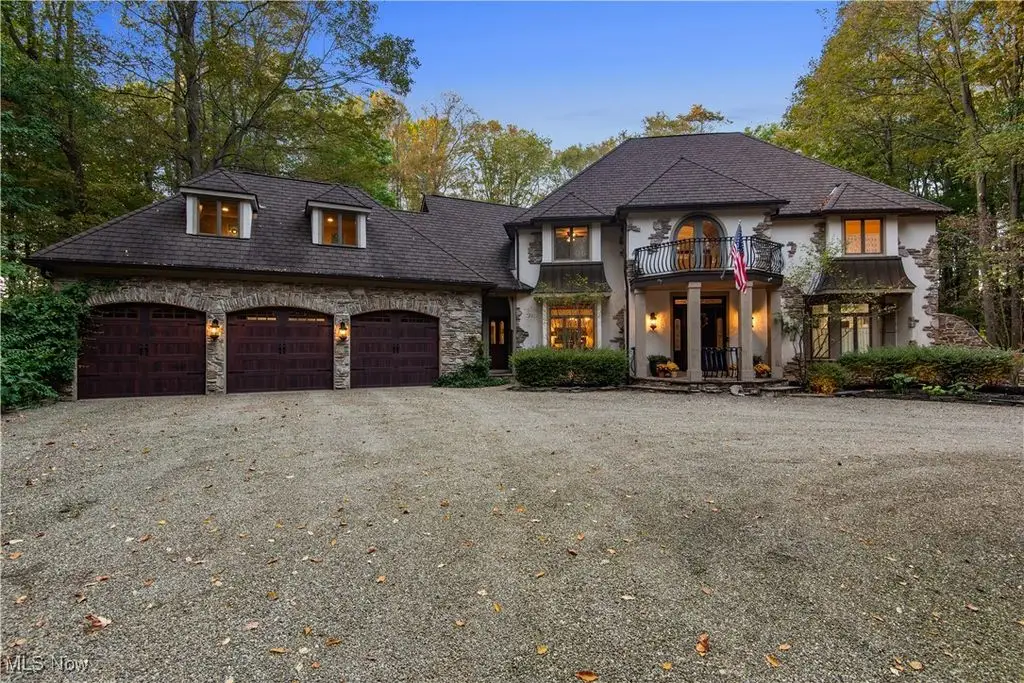 Private location on a 2-acre cul-de-sac overlooking the scenic 23-mile perimeter of the LaDue Reservoir. Stone pillars are the starting point to a long driveway leading to a grand rounded portico entrance w/beautifully crafted wrought iron railing. Open foyer with soaring ceilings, adjacent to a formal dining room featuring a bow window + built-in window seat. Great room w/floor-to-ceiling windows, beamed ceilings, gas fireplace w/mantle and hearth! Great design w/4 bedrooms including 2 owner's suites + 5 baths. The chef's kitchen showcasing premium cabinetry, high-end appliances, and a professional chef's sink flows seamlessly into the breakfast area and hearth room w/stone fireplace. Additional living spaces include a cigar porch w/peaked ceilings + tile flooring, detailed office, and a fabulous, functional laundry room with a separate front entrance, barn doors, additional closet space, and a walk-in pantry. The 2nd-floor primary suite offers custom stonework and 3rd-floor dressing suite (22'x15')! This private retreat is accessed by a spiral staircase featuring custom built-ins, a walk-in closet, and 2 wardrobe closets. An additional upstairs bedroom includes 2 walk-in closets +full bath. 2nd-floor great room, w/skylights + a separate staircase to the kitchen, offers flexible space! The newly finished lower level is styled like a luxury sports bar, w/full wet bar, large rec area, and a full bath. Perfect for friends/family or game-day fun. Amazing outdoor living w/continuous water views + private walkway to the reservoir. Backyard features include a Trex composite deck w/an electronic retractable awning, an expansive patio, a built-in outdoor kitchen, a tranquil pond with a waterfall, an outdoor shower, and a storage shed. The entire property is enhanced by LED landscape lighting, including along the driveway for a dramatic approach to your front door. This one-of-a-kind home combines timeless craftsmanship, luxurious amenities, an opportunity not to be missed.