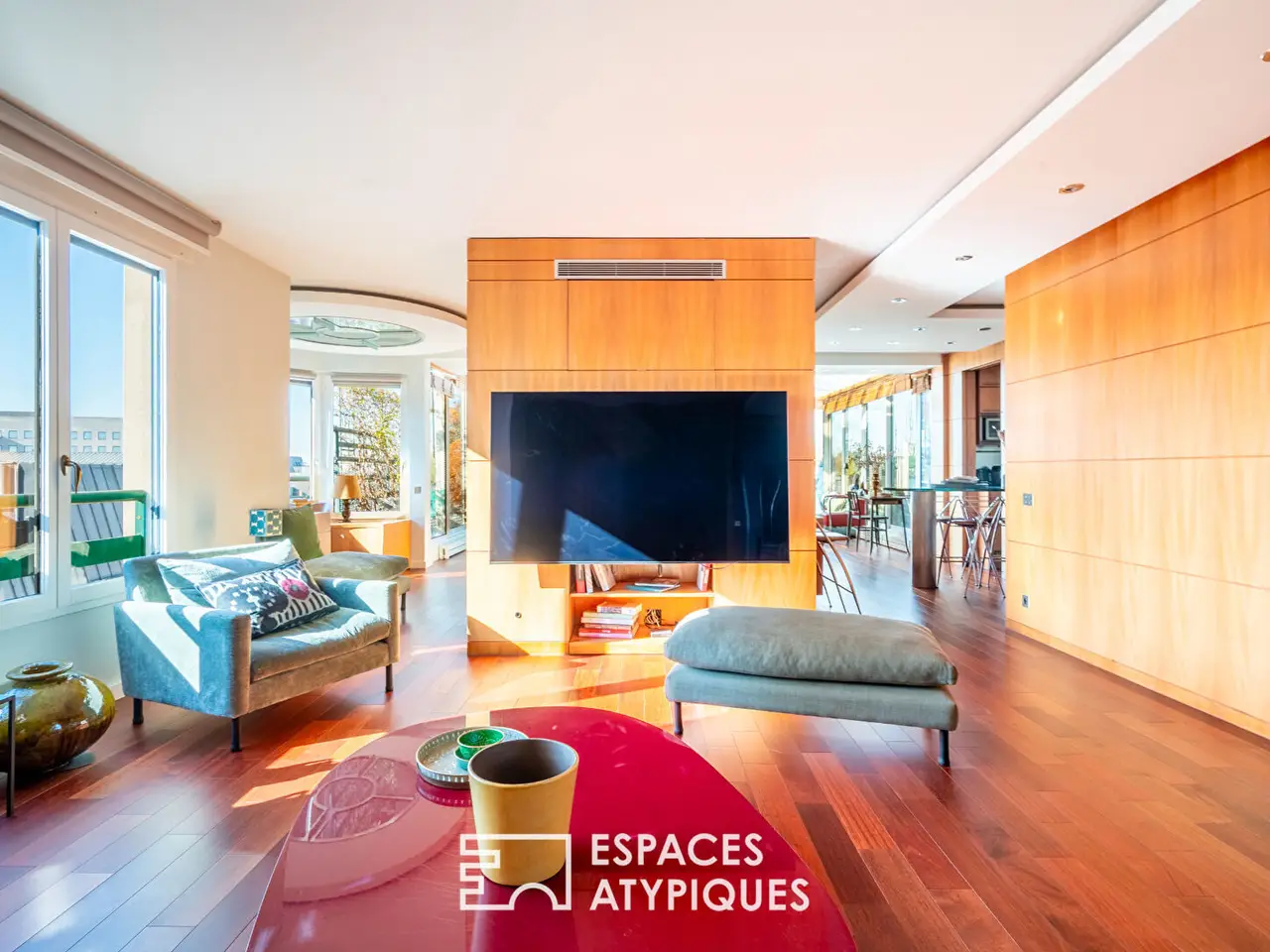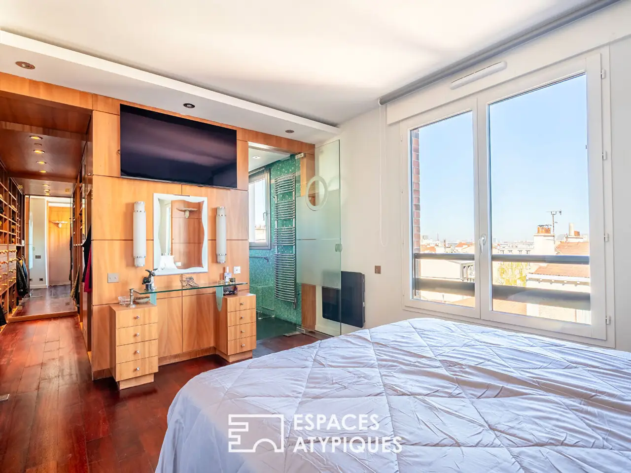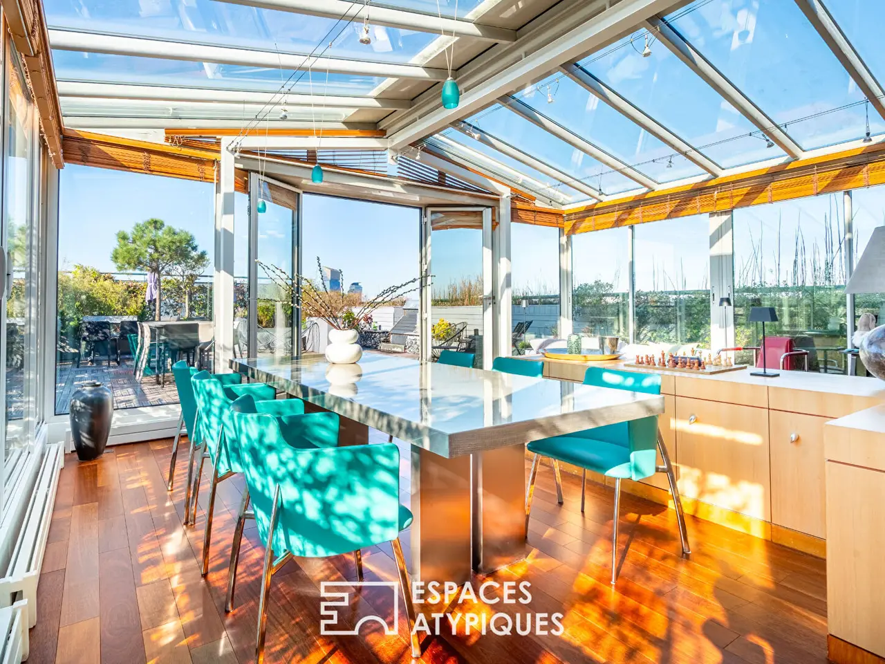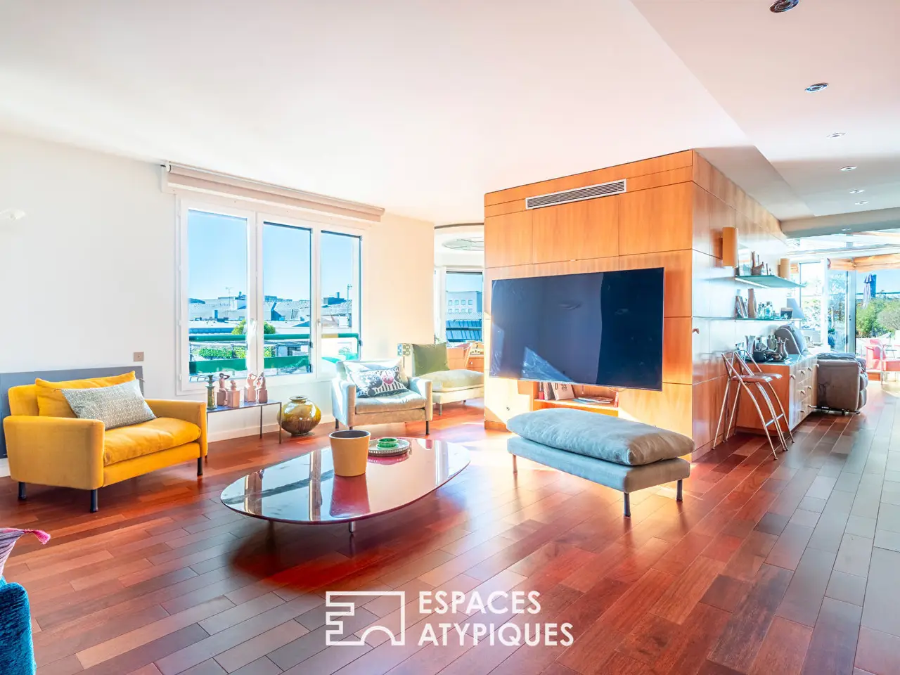 Located in Charenton-le-Pont, in a contemporary building, this 171 m2 high-rise inverted duplex boasts bold architecture and remarkable outdoor spaces, including a 101 m2 open-air terrace and two balconies. Spread over two levels, it comprises five rooms, including three bedrooms on the upper floor and a separate master suite on the lower level. Upon entering the 6th floor, a first intimate space opens up, consisting of a vast, custom-designed hall and a light-filled master suite with a dressing room and private bathroom, generous storage space, and unobstructed views of the rooftops. This level, designed like a cocoon, offers a perfect separation between the sleeping and living areas. The sculptural staircase made of solid wood and glass walls then leads to the upper floor, the true heart of the apartment. On the 7th and top floor, the spaces open onto a vast, dual-aspect living room, enhanced by a glass roof that extends the light at every hour of the day. The dining room and the fully equipped kitchen interact in a warm atmosphere, enhanced by custom woodwork and meticulous finishes. Three additional bedrooms are located here, two of which have balconies, as well as a separate laundry room, a rare and practical solution for everyday use. The terrace, facing the sky and completely unoverlooked, stretches out like a hanging garden, perfect for relaxing or entertaining. The panoramic view reinforces the exceptional character of this property. The property is located in a quiet setting, just steps from shops, schools, and metro line 8. A double underground parking space and a large 8m2 cellar complete this property, which is subject to co-ownership status. Metro 8: Liberte: 1 min walk Shops: 1 min walk Schools - Colleges: 1 to 10 min walk REF. 10349 Additional information * 6 rooms * 4 bedrooms * 2 bathrooms * Floor : 6 * 7 floors in the building * Parking : 2 parking spaces * 91 co-ownership lots * Annual co-ownership fees : 8 200 € * Property tax : 3 485 € * Proceeding : Non Energy Performance Certificate Primary energy consumption d : 204 kWh/m2.an High performance housing