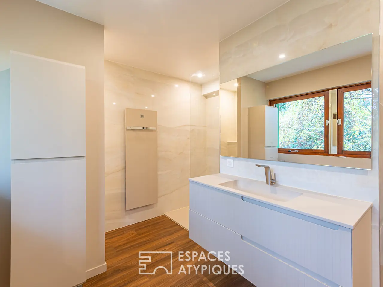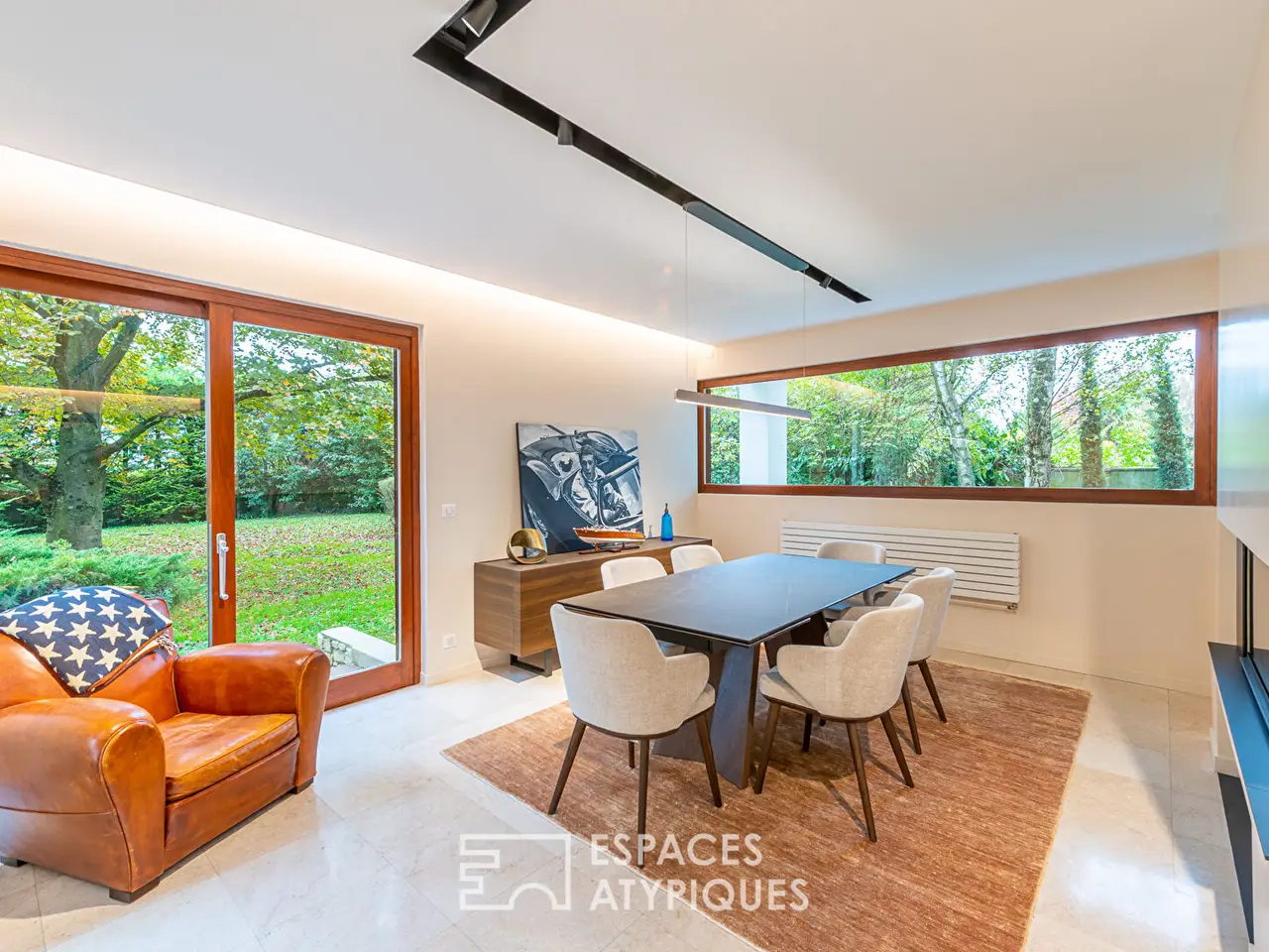 Maison d'architecte seventies renovee avec parc Exclusive In the heart of Chelles, this magnificent architect-designed house was built in 1965 and benefited from a high-end renovation in 2021. It offers an area of 225m2 on two levels nestled out of sight and quiet on a plot of 1700m2. Organized on two levels, the ground floor distributes the living rooms. From the entrance the tone is set, a magnificent wall covering in oiled solid oak allows you to appreciate the high ceilings. On one side the entrance leads to the living room, benefiting from a double exposure as well as a breathtaking view of nature. The living room revolves around a custom-designed fireplace with its double face allowing you to enjoy it on the living room and dining room side. In the extension, a magnificent top-of-the-range fully fitted and equipped kitchen faces the dining room and has access to a first large terrace at the back of the house. A boiler room, a cloakroom, a laundry room and a bathroom complete the ground floor. A beautiful natural stone staircase gives access to the first floor and gives rise to a beautiful landing with its custom-made library. The entire floor is parqueted with solid exotic wood and has a magnetic door. On one side are the master suite with its bedroom enjoying access to a beautiful terrace, its tailor-made dressing room and a magnificent marble bathroom. On the other side, there are three beautiful bedrooms with storage and tailor-made dressing room sharing a bathroom. An office that can be used as an extra bedroom completes the floor. A motorized double garage completes the whole property. Its high-end materials, its location and its park make it a rare and atypical property in the sector. Close to shops, schools and transport. Greater Paris in the immediate vicinity. ECD in progress REF. SM1002 Additional information * 9 rooms * 4 bedrooms * 2 shower rooms * 1 floor in the building * Outdoor space : 1700 SQM * Parking : 2 parking spaces * Property tax : 3 600 €