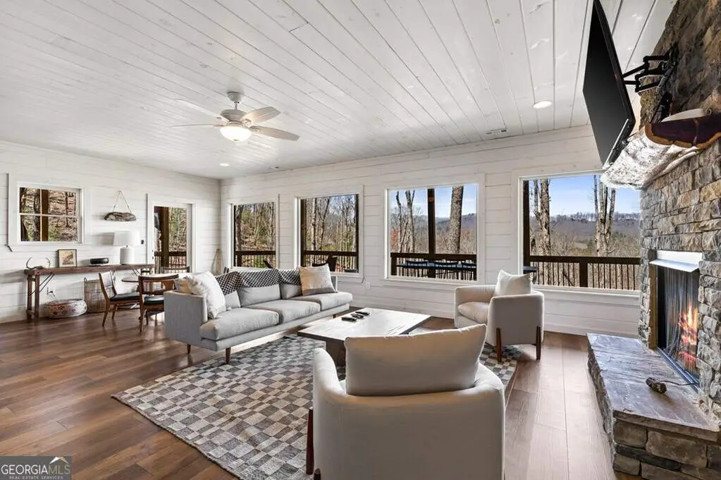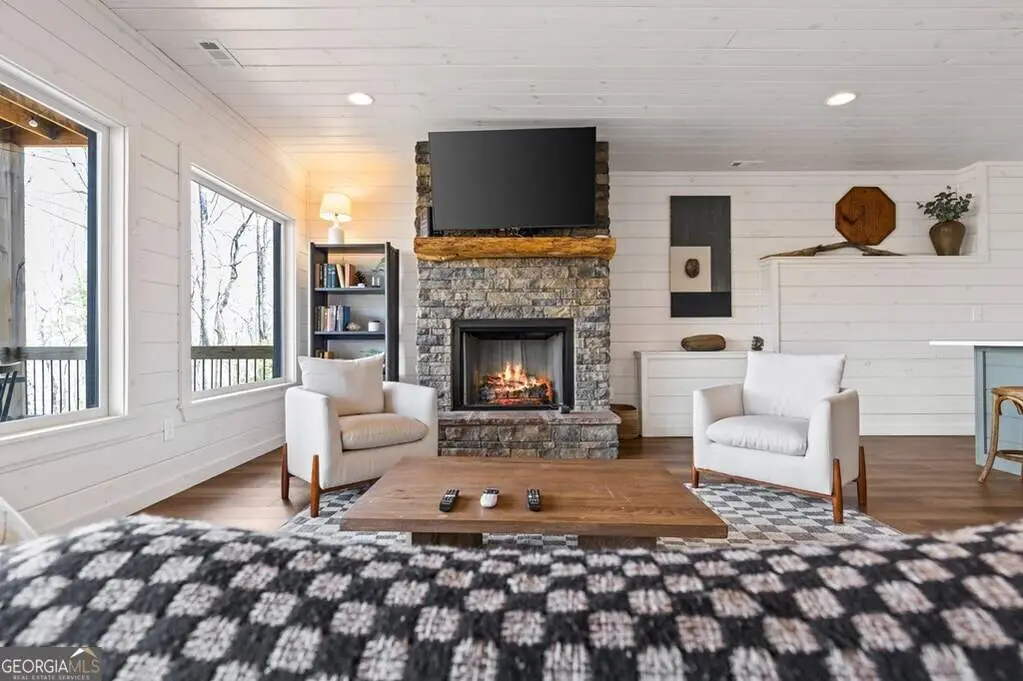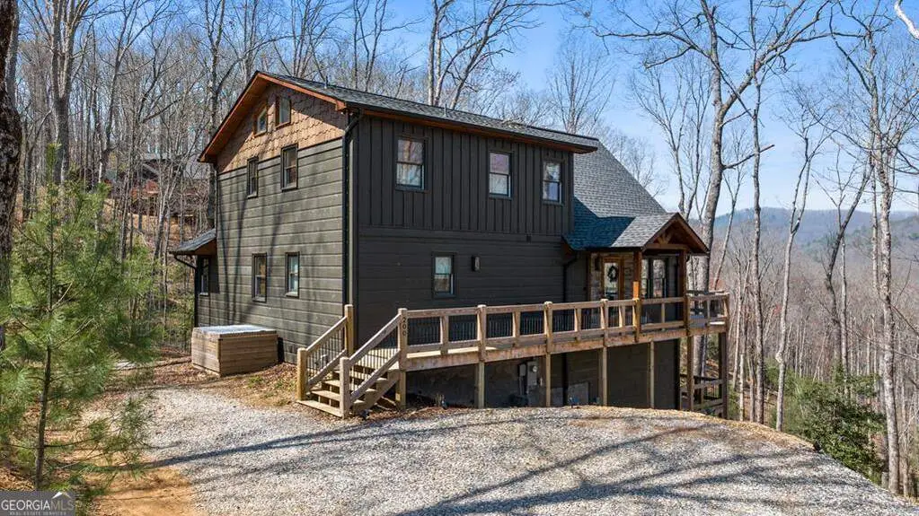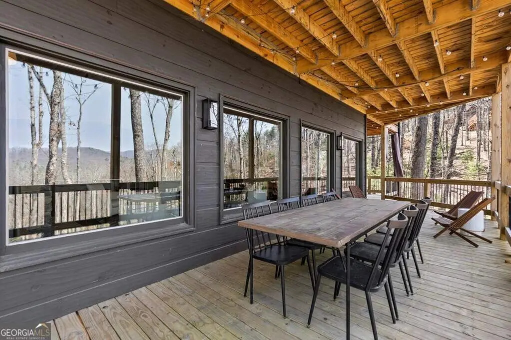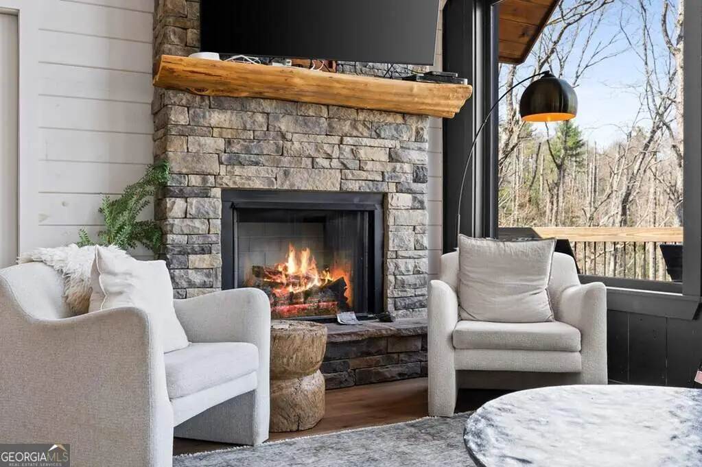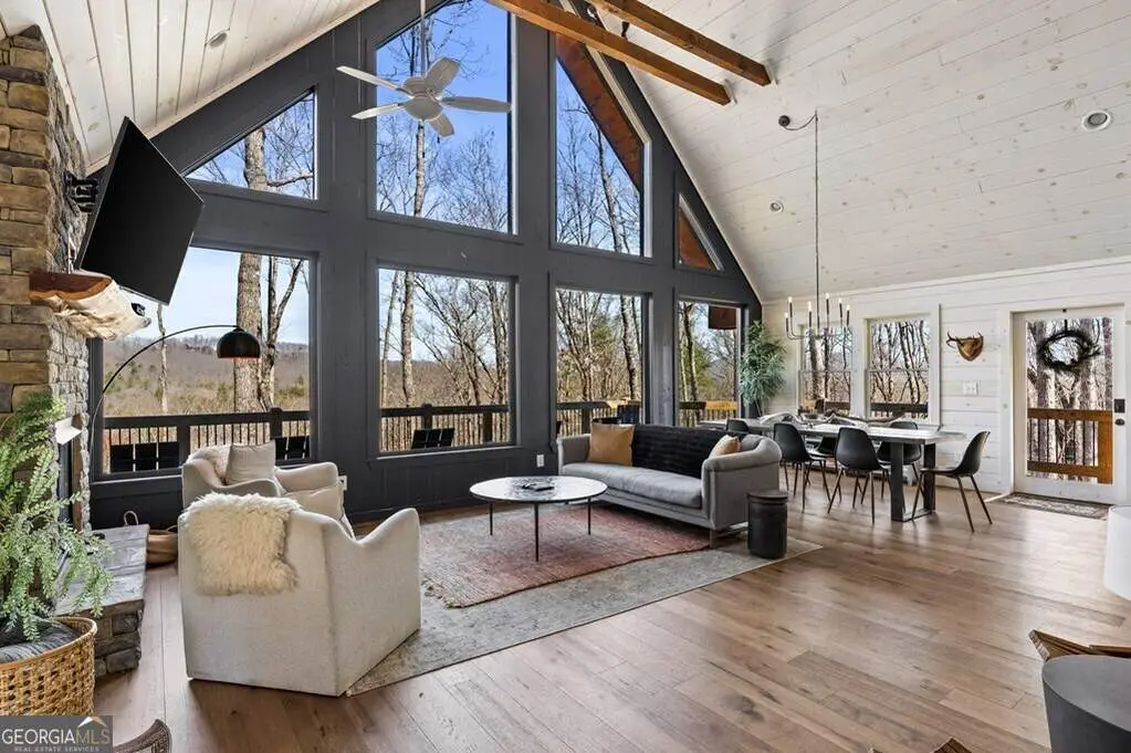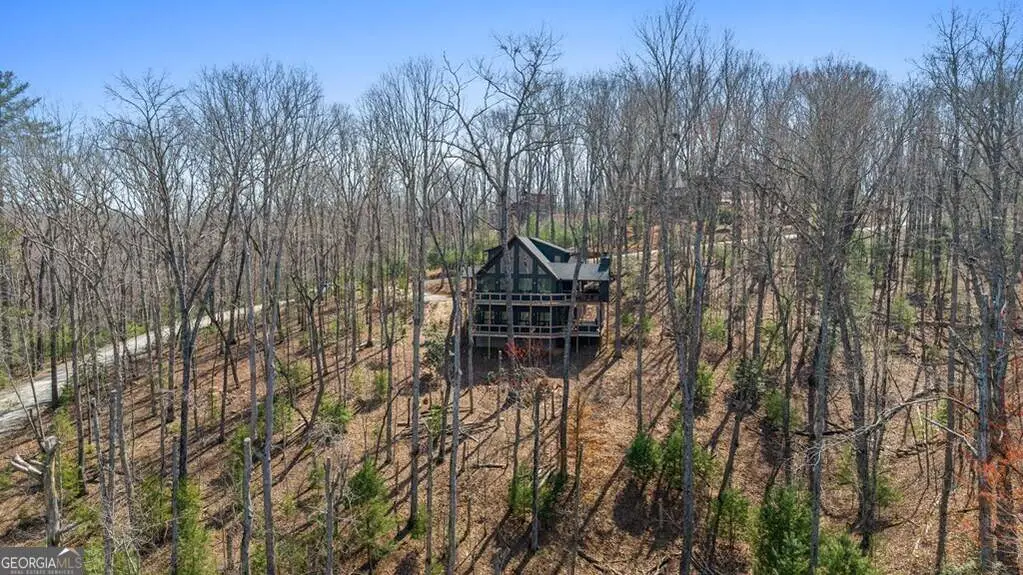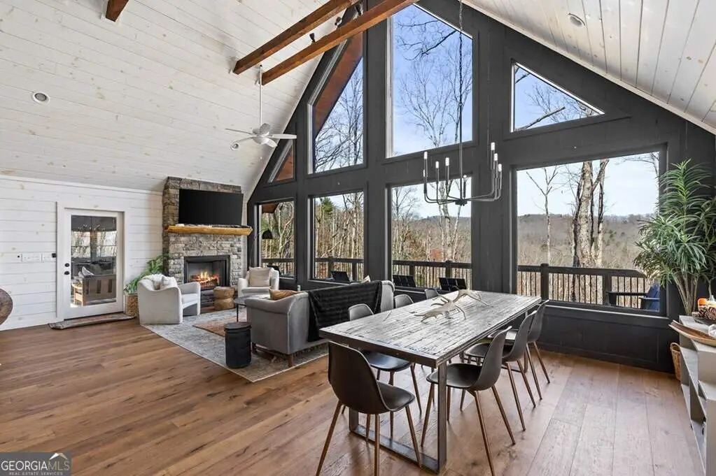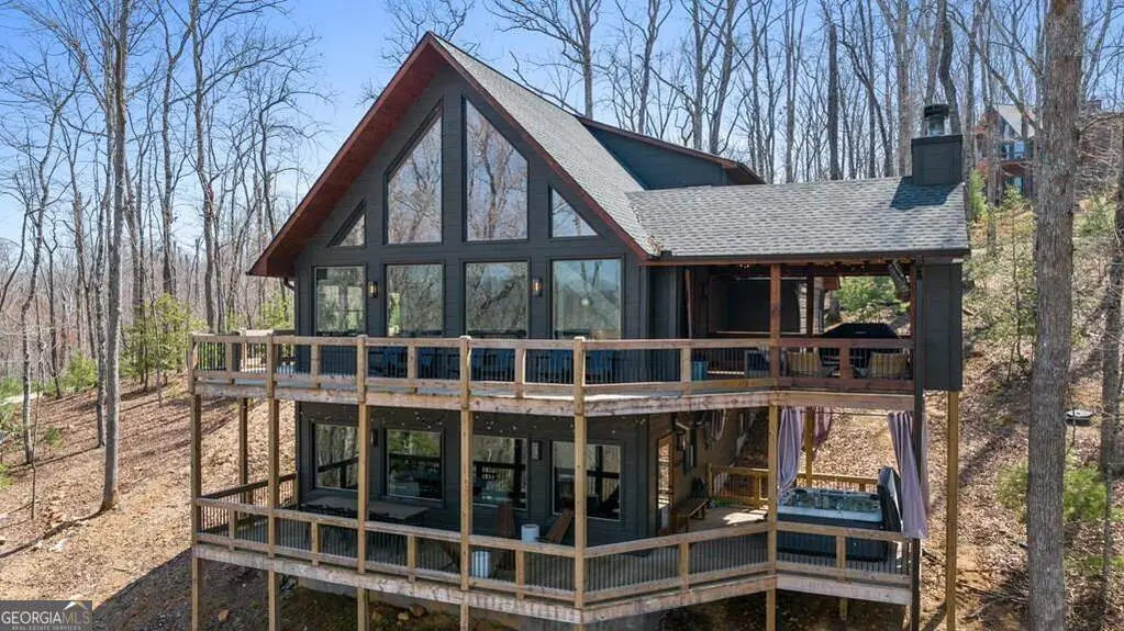 This extraordinary modern cabin is crafted by Prairie School and featured in numerous publications, offers the ultimate mountain escape on 2.44 acres in the Aska Adventure Area. With 4 bedrooms and 3.5 baths, it's a retreat that combines luxury with nature's beauty, featuring year-round mountain views from an expansive terrace complete with a wet bar and stacked stone fireplace. Inside, the open kitchen boasts custom tile flooring, granite countertops, and a spacious farmhouse sink, flowing into a great room with floor-to-ceiling windows and a stone fireplace. Three living spaces across different levels provide unique spots to relax, each with mountain views and cozy fireplaces. The main-level, loft, and lower-level lounges are perfect for both quiet evenings and lively gatherings. Outdoors, a hot tub, wood-burning fireplace, and multiple decks invite you to unwind while enjoying the sweeping scenery. The cabin's location near the Toccoa River, Blue Ridge dining, and hiking and biking trails makes it ideal for nature lovers and adventure seekers. This property is also a successful short-term rental. Just minutes from tubing and trails and a short drive to downtown Blue Ridge, this cabin offers an unparalleled blend of comfort, style, and accessibility, whether as a personal retreat or a high-performing investment.