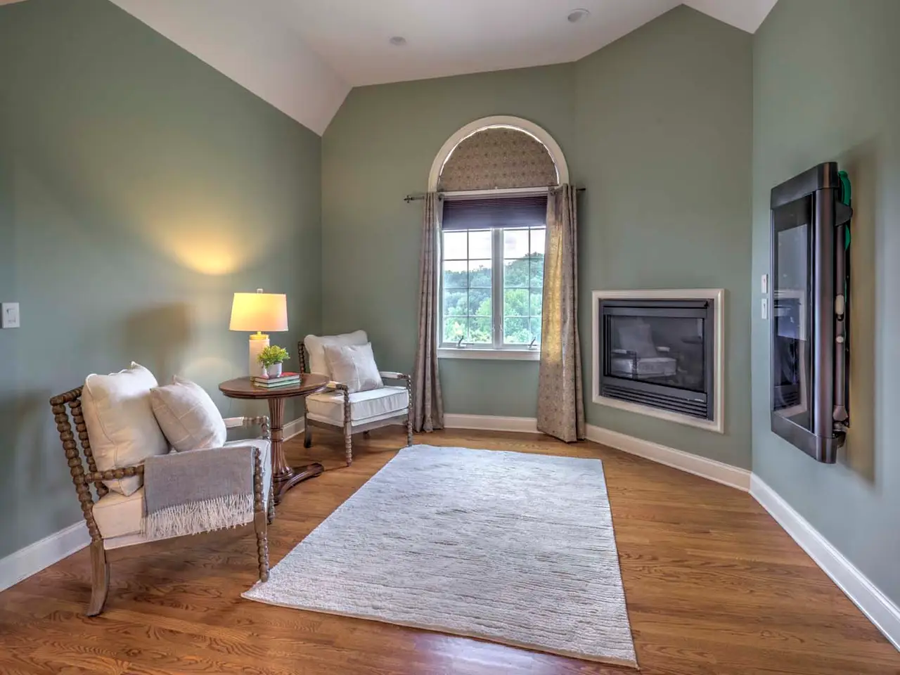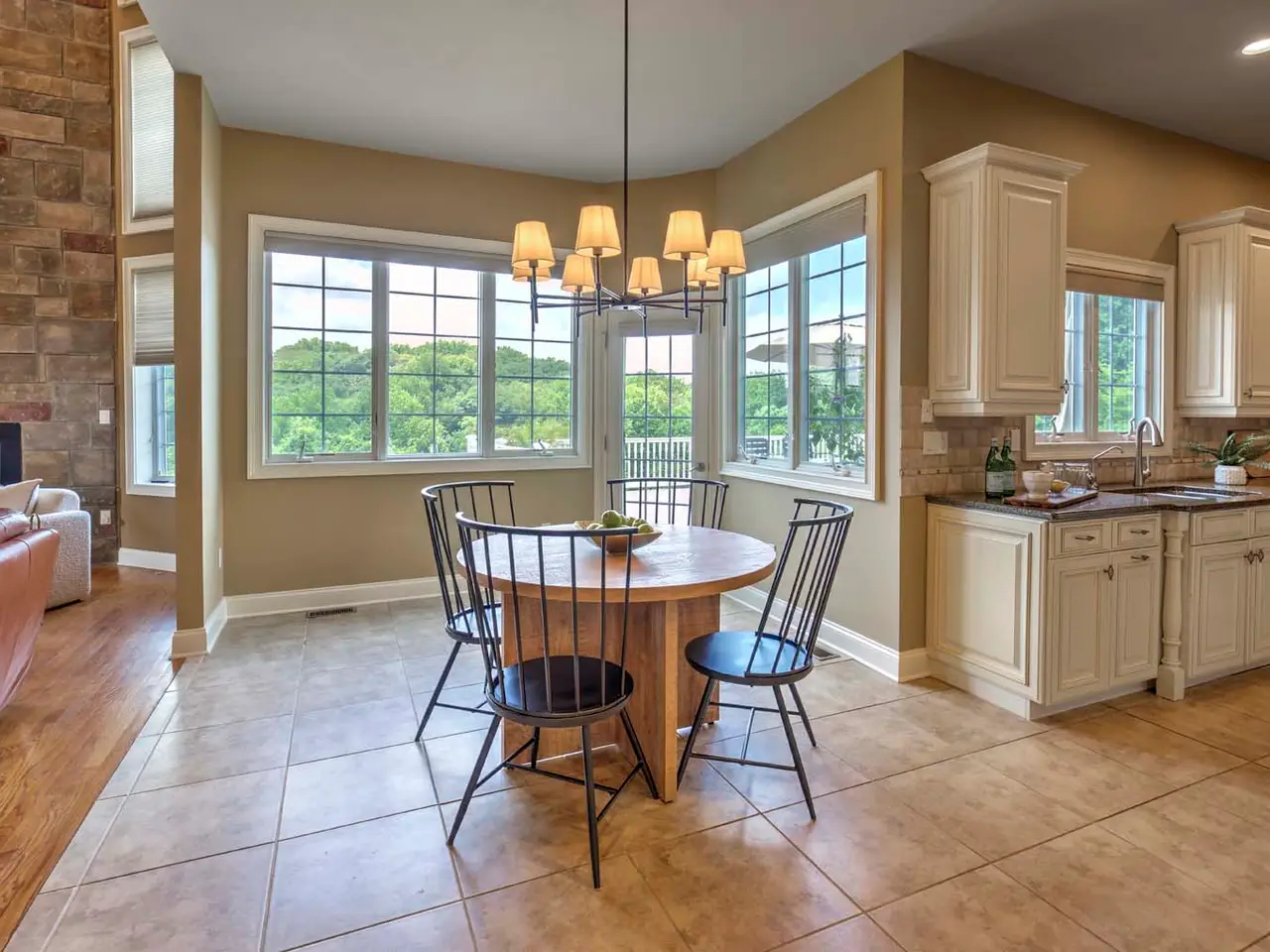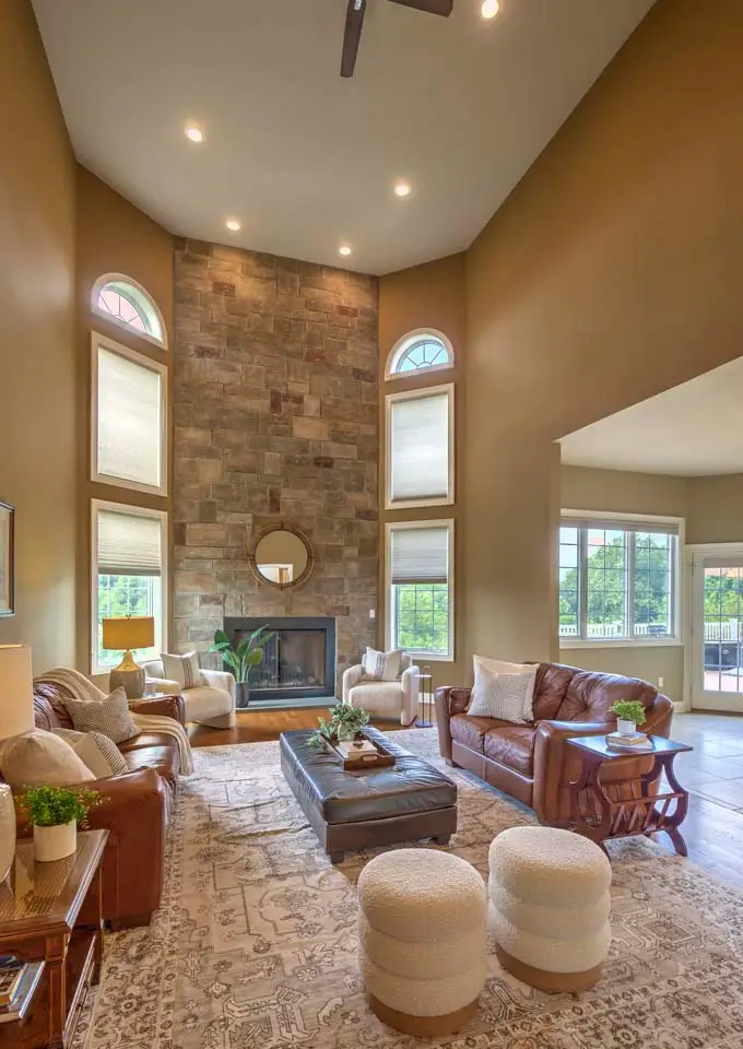 Two-story family room with floor-to-ceiling stone fireplace