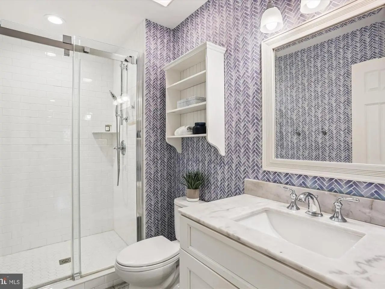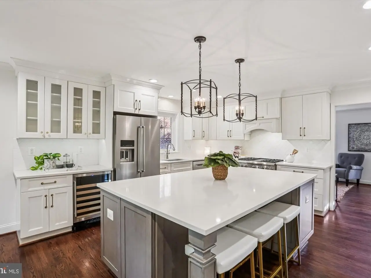 OPEN SUNDAY 1-3pm. Tucked along a picturesque, tree-lined street in one of Chevy Chase's most desirable and walkable neighborhoods, this charming Colonial perfectly blends timeless character with modern comfort. Thoughtfully renovated and expanded in 2019, the home offers five bedrooms and four full baths, including a main-level bedroom suite and a beautifully landscaped, fully fenced rear yard. A welcoming foyer and living room set the tone with abundant natural light from three walls of windows and a classic wood-burning fireplace. The heart of the home is the chef's kitchen, showcasing quartz countertops, custom cabinetry, and premium appliances-KitchenAid French-door refrigerator, gas range with griddle, Bosch Emerald Pro dishwasher, and Azure wine fridge. A large island with ample seating, connects seamlessly to the family room addition which has a custom built-in banquette, while sliding doors open to a deck ideal for outdoor dining and relaxation. Entry from the attached one-car garage leads to a mudroom with cubbies, providing everyday convenience and organization. Privately tucked away, the main-level bedroom suite with beautifully renovated bath is perfect for guests, an office, or multigenerational living. Upstairs, the generously sized primary suite offers a spa-inspired bath, walk-in closet with custom shelving, and views of the backyard. Three additional bedrooms include one with an en-suite bath and two sharing a hall bath. The lower level features a cozy recreation room with fireplace and built-ins, laundry, and generous storage space. Outdoor upgrades include a deck (2019), brick patio and front steps by Capitol Hardscapes (2020), and a new garage door (2024). Moments from Chevy Chase Lake, the Purple Line, Rock Creek Park, and the North Chevy Chase Swim Club, this exceptional home delivers modern updates, classic design, and a beloved neighborhood setting.