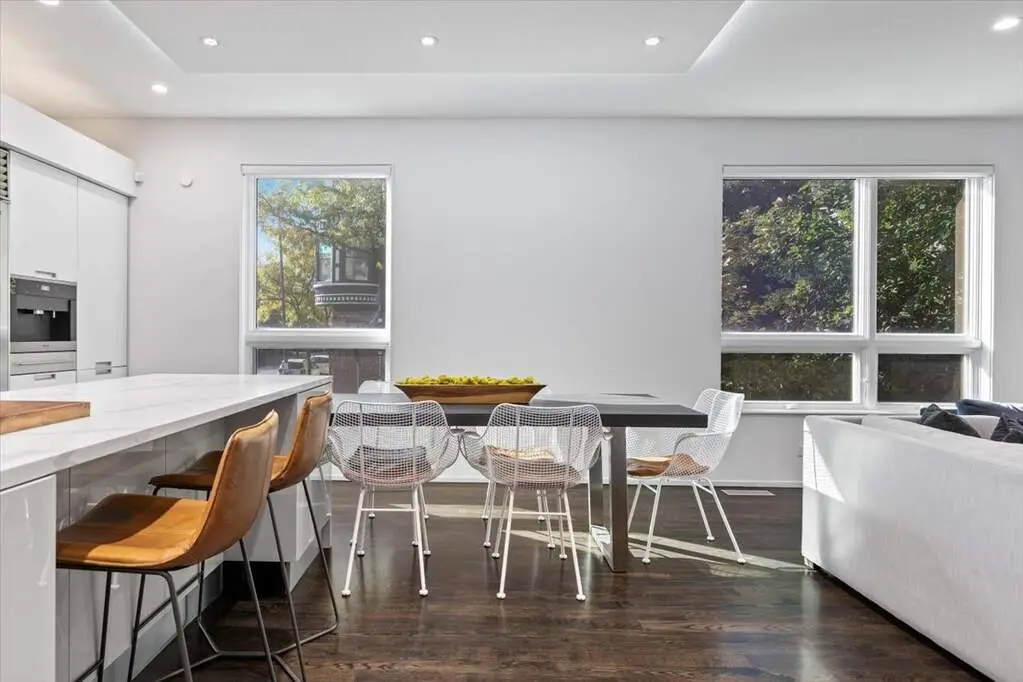 Beautifully modern and architecturally unique single family home in a prime West Town location. This unique floorplan lives extremely gracefully, with large room sizes due to the sculptural steel staircase in the center of the home. The loft-like main level is bright and airy with east and south facing windows. The kitchen is massive with a huge island and built-in dining table. Enjoy high end appliances with abundant counter and storage space. The kitchen overlooks the large family room with a striking tile fireplace wall and dry bar. The primary suite features custom built-in closets, and a large attached bathroom. The bathroom was recently updated with a double vanity and body sprays + rain head shower. The secondary bedrooms share a beautiful Jack and Jill bathroom. All upstairs bedrooms open directly to outdoor spaces. The rooftop deck is stunning with porcelain paver tiles, multiple seating areas, and a full outdoor kitchen with skyline views! The lower level features a media room with a built in projector screen and another bedroom and full bathroom. The cork floors add a modern flair. The attached 2 car garage with a curb cut offers extra parking and opens directly inside to the entryway. Walkable to dining and bars along Chicago Ave and with easy access to downtown and the highway and more, this location is incredibly convenient!