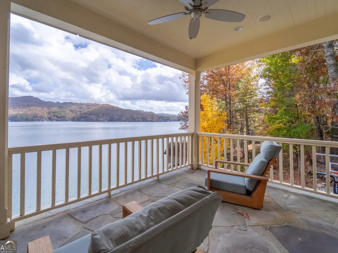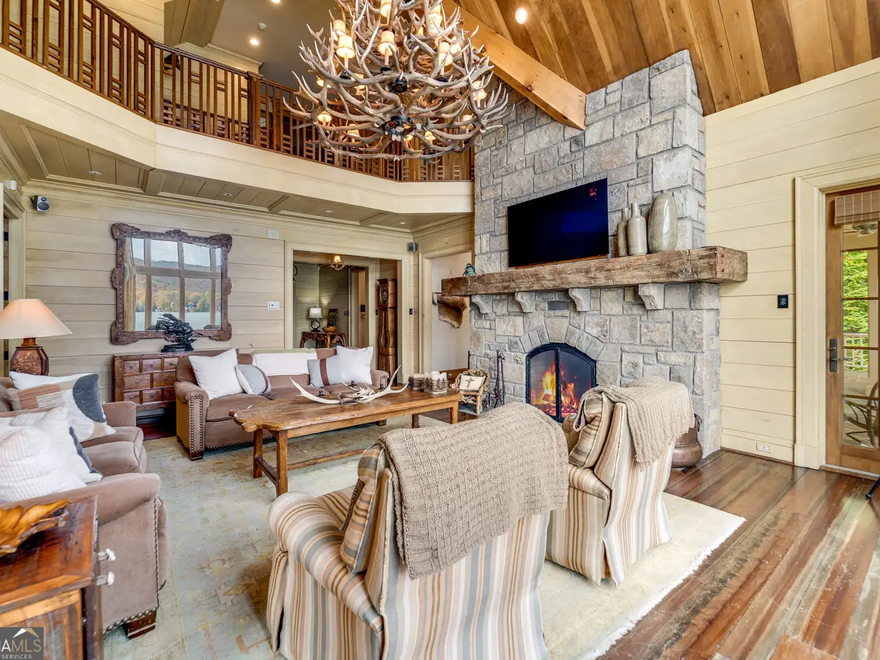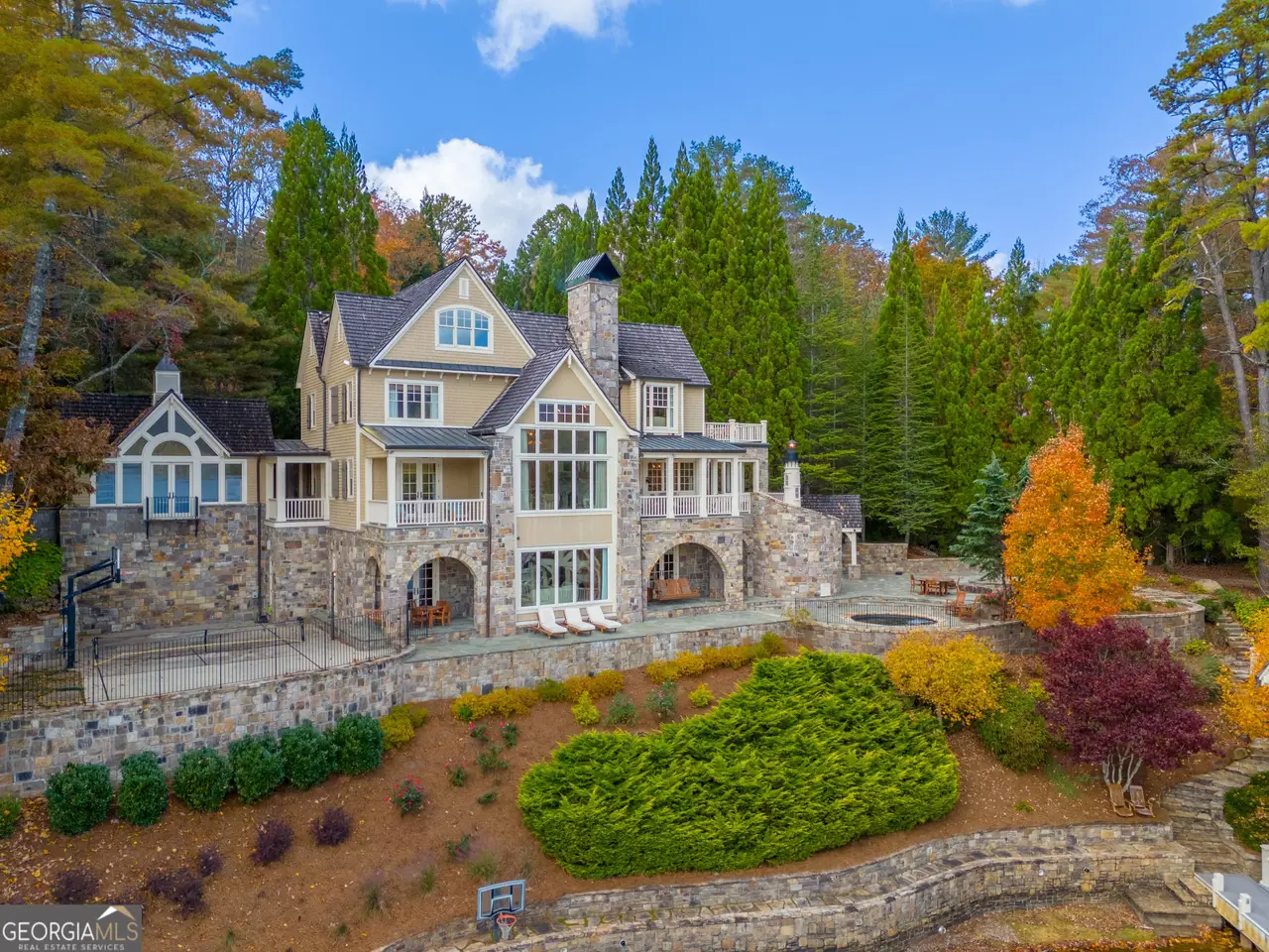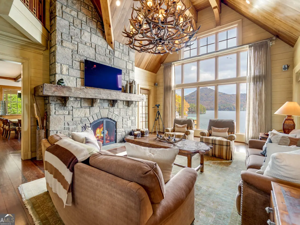 A true designer's showplace, this 5 BD, 5.5 ba Control4 Smart Home is the ultimate entertainer's retreat. Situated in a protected cove with sweeping lake and mountain views, the family room offers a vaulted ceiling, 2-story stone fireplace and wall of windows framing wide-open lake views. Make dining a blast in this gourmet kitchen with professional appliances, a authentic juke box, a stone fireplace, dining for 10+ and access to 2 covered lakeside porches. The terrace level is equipped with a family room with fireplace, billiards, wet bar and access to a sprawling lakeside patio with built-in 10' round Jacuzzi pool, oversized fire-pit, grilling pavilion and sport court. With 3 master suites and 2 bunk-rooms, this home comfortably sleeps 23 in beds. Amenities include a gym, office, art studio, 4 indoor fireplaces and 2 outdoor fireplaces, a carport, gated entry, paved access, pre-stubbed for elevator.