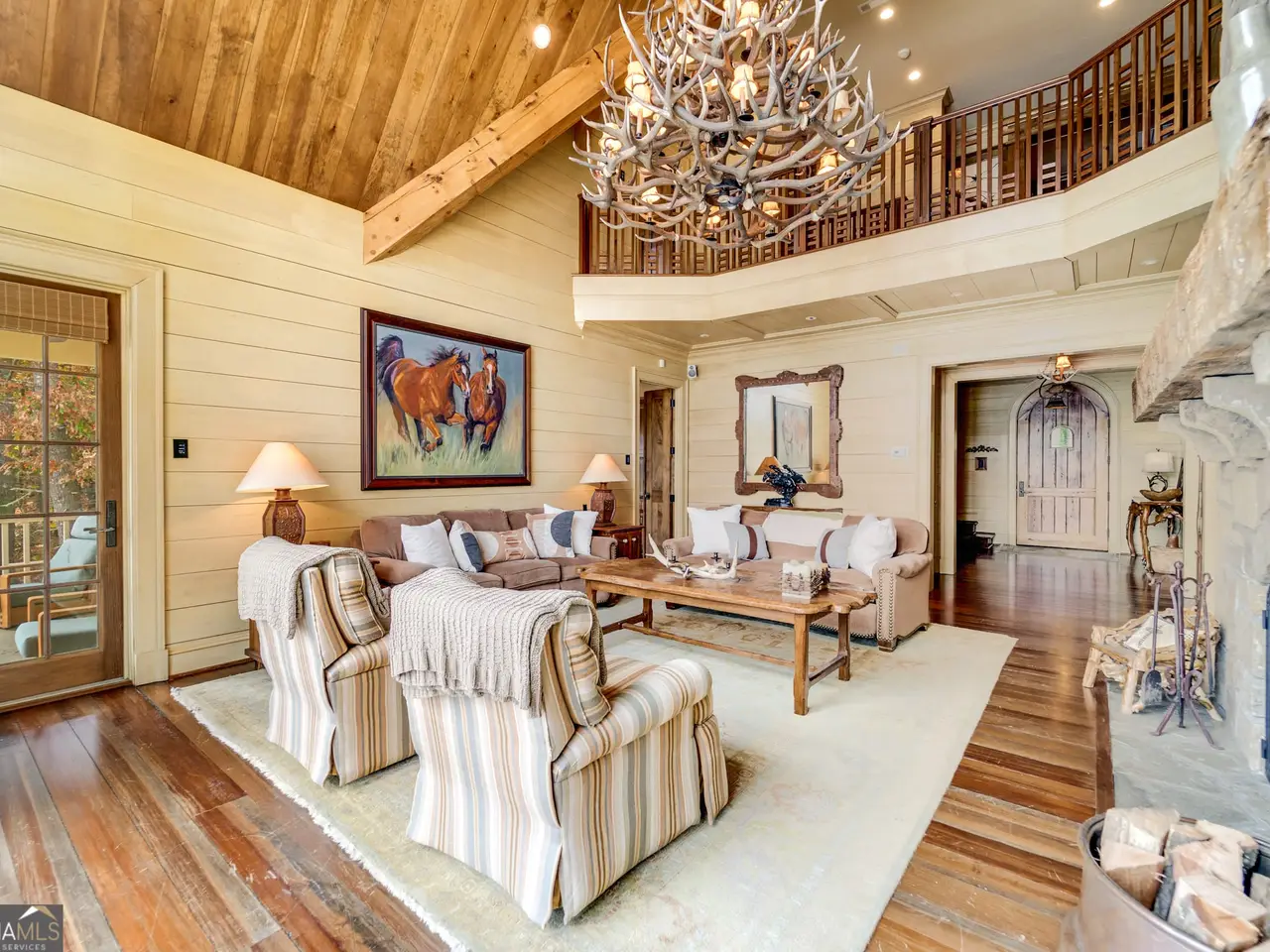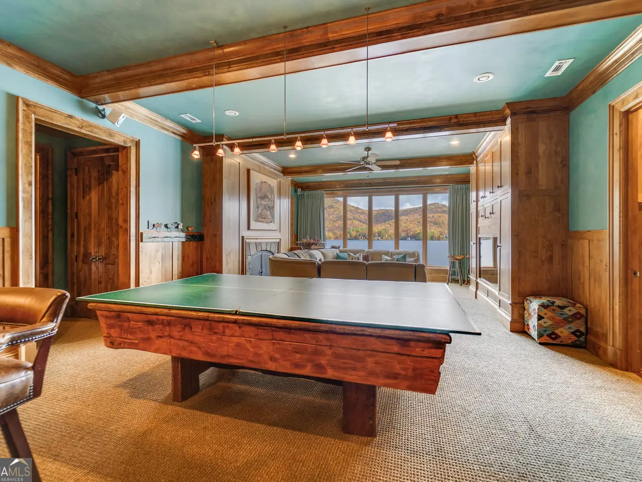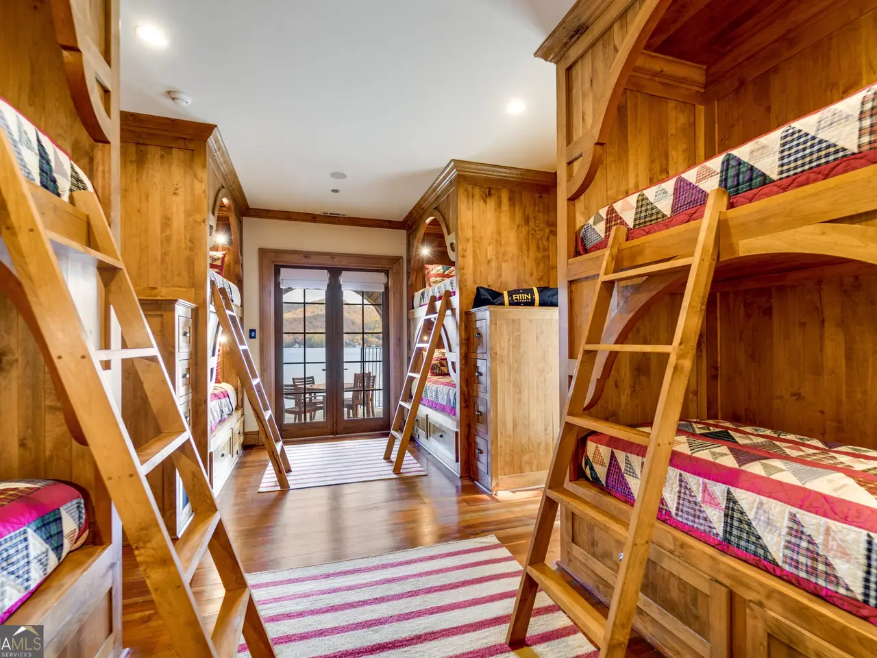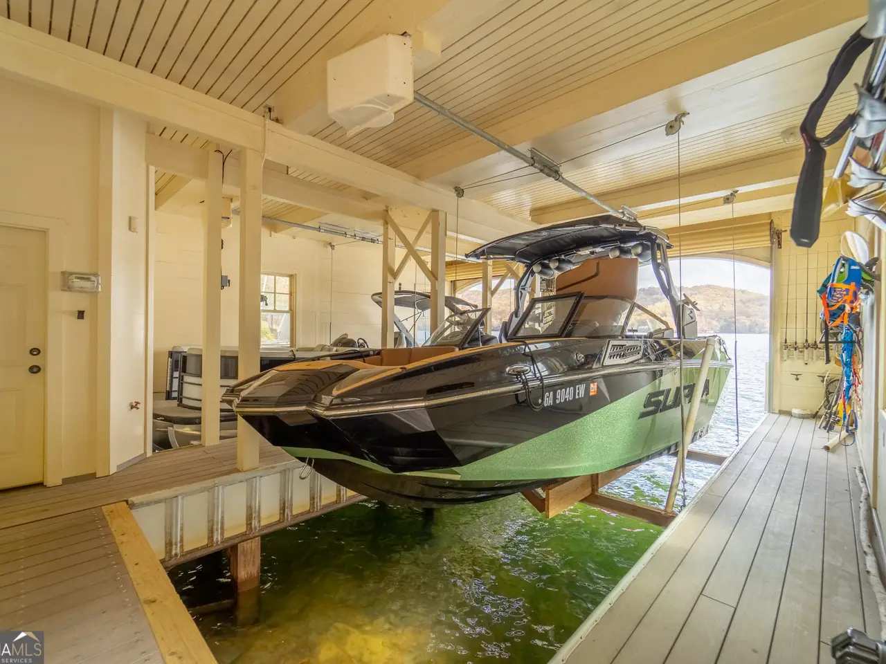 A true designer's showplace, this 5 BD, 5.5 ba Control4 Smart Home is the ultimate entertainer's retreat. Situated in a protected cove with sweeping lake and mountain views, the family room offers a vaulted ceiling, 2-story stone fireplace and wall of windows framing wide-open lake views. Make dining a blast in this gourmet kitchen with professional appliances, a authentic juke box, a stone fireplace, dining for 10+ and access to 2 covered lakeside porches. The terrace level is equipped with a family room with fireplace, billiards, wet bar and access to a sprawling lakeside patio with built-in 10' round Jacuzzi pool, oversized fire-pit, grilling pavilion and sport court. With 3 master suites and 2 bunk-rooms, this home comfortably sleeps 23 in beds. Amenities include a gym, office, art studio, 4 indoor fireplaces and 2 outdoor fireplaces, a carport, gated entry, paved access, pre-stubbed for elevator.
