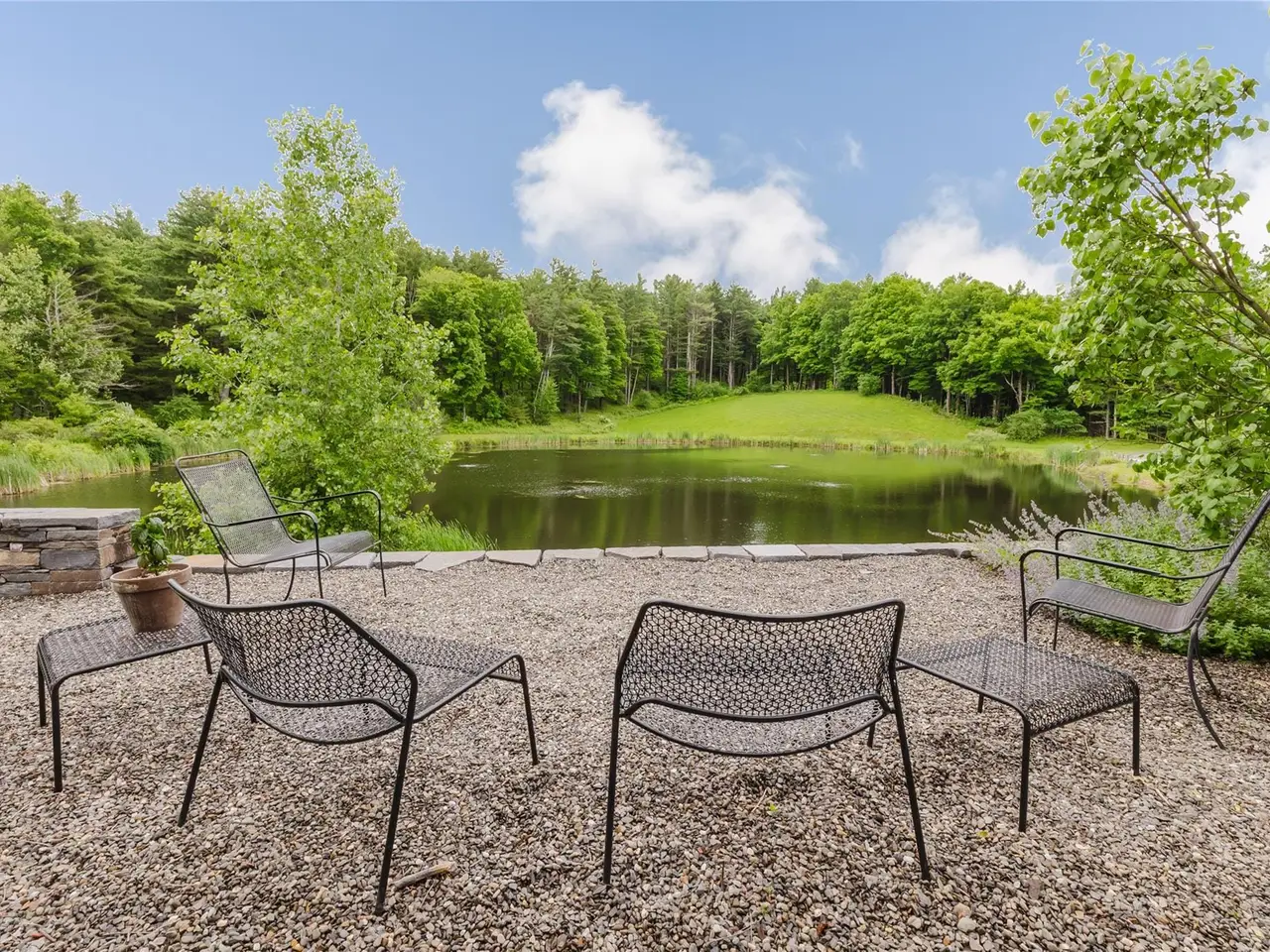 Welcome to Mac Brown Waterhouse, a storied 119-acre estate set within a hidden valley offering complete seclusion and timeless beauty. The original 1830s farmhouse is tucked away at the end of a private lane in Claverack, NY, where the road terminates in a round gravel driveway anchored by the property's original stone well. Two large ponds grace the land, one directly in front of the house that is aerated and swimmable. Sited among meadows and mature woodlands, the main house, upgraded barn, and charming studio shed are framed by terraced stonework, a network of trails, and thoughtfully designed gardens. The setting is peaceful, restorative, and deeply connected to the land, yet only a short drive to both Hudson and Great Barrington. The antique farmhouse offers four bedrooms and two bathrooms across 2,825 square feet, where original details like moldings, wood floors, and Dutch doors preserve its old-world charm. A generous double living room and an office nook outfitted with Vitsoe modular shelving, lead to a bright dining area, kitchen, and direct access to the patios and gardens. The layout encourages an easy indoor-outdoor rhythm, with covered porches, and multiple terraces for lounging, cooking, or gathering. Two staircases rise to the upper-level bedrooms, where the southern exposure fills each room with light, and the attic has been insulated to improve year-round comfort. Throughout the home an intentional color palette lends softness and cohesion. The overall design brings together European sensibility and Hudson Valley character, balancing utility with ease, warmth, and quiet sophistication. Across the garden sits a fully insulated, historic barn that has been transformed into a large-scale creative studio, complete with a bathroom with a clawfoot tub, kitchenette, updated electrical and HVAC. A detached potting shed offers another versatile space, ideal as a garden studio, writer's nook, or future guest cottage. Its connected to an outdoor bath deck that invites restorative soaks beneath the stars with its fireplace, clawfoot tub, and outdoor shower. Next to the house, a carport with EV charging and a full-property generator ensures comfort and continuity year-round. The primary pond is the centerpiece of the property - aerated, swimmable, and bordered by a pebble beach and firepit. It's ideal for swimming, birdwatching, or evening gatherings. Cranes, herons, and even bald eagle sightings make it a birdwatching paradise. Terraced gardens by The Secret Gardener surround the home with a cottage-style blend of flowering plants, herbs and vegetables. Rewilded fields and meadows lead to two miles of maintained trails through native grasses and towering trees. The land qualifies for a forestry exemption and includes multiple cleared areas, offering potential for a guest house, horses, or even a helipad. Whether hosting music on the lawn, harvesting from the garden, or watching the changing sky reflect in the pond, Mac Brown Waterhouse is a rare legacy estate and true sanctuary.