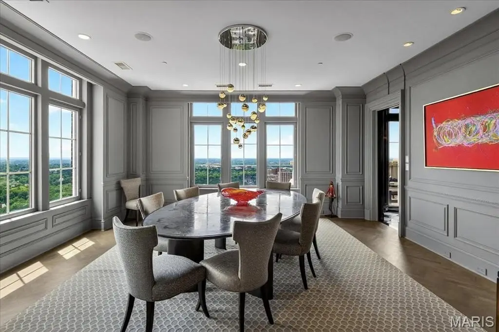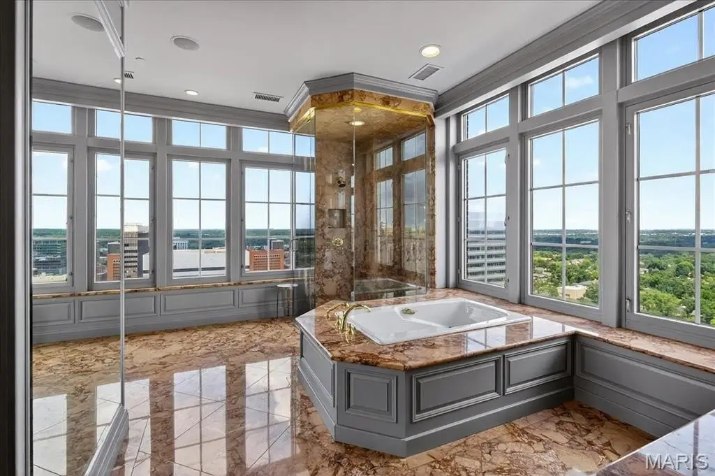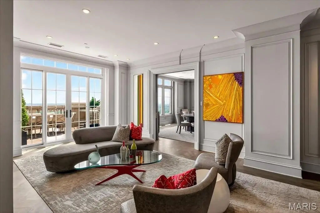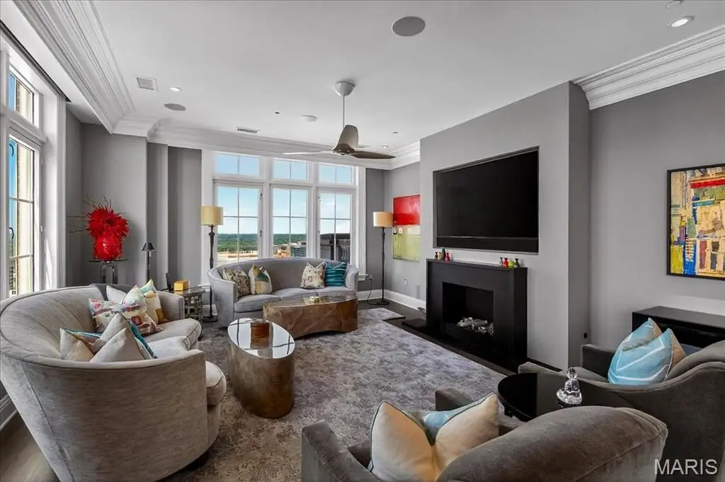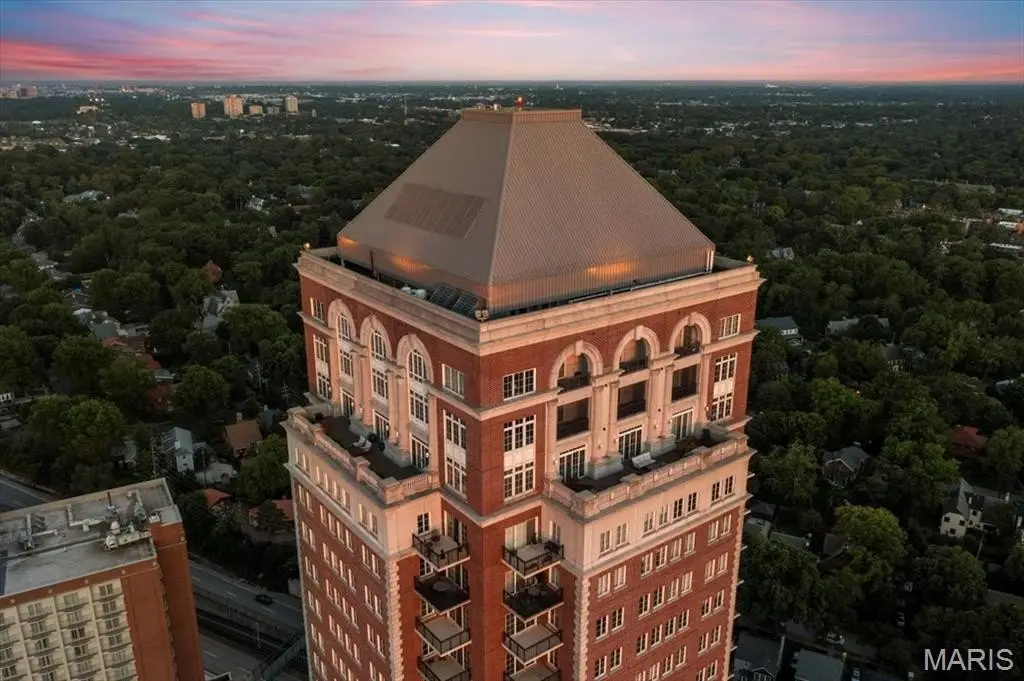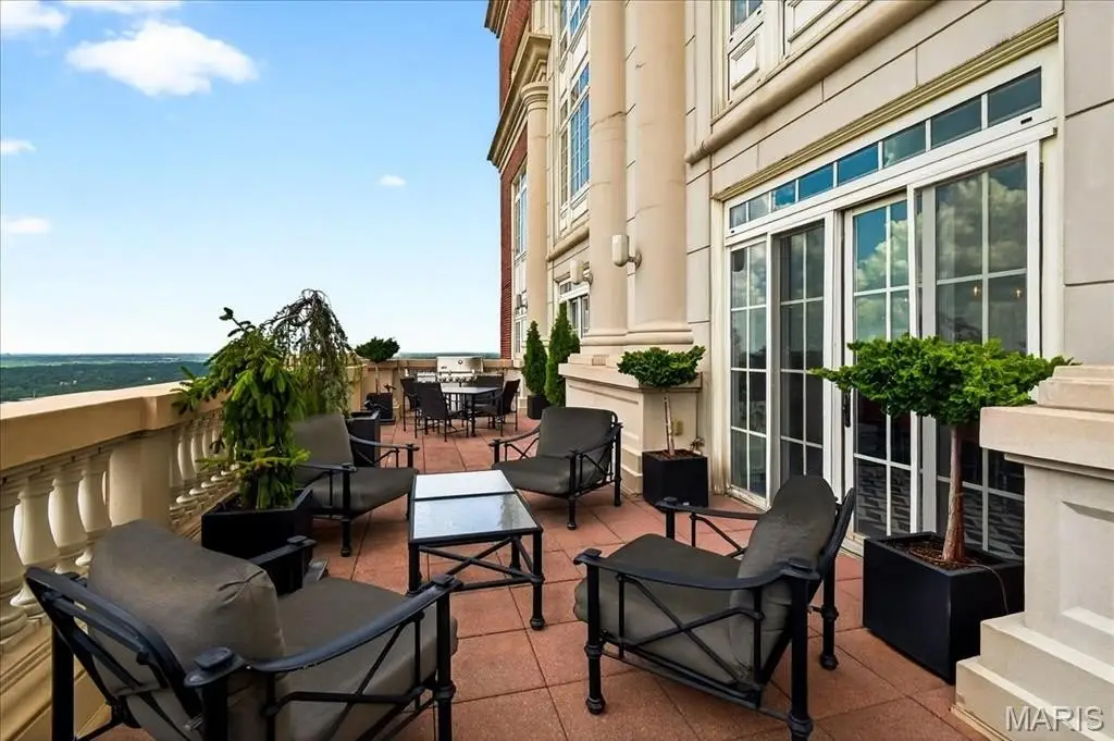 Welcome to the crown jewel of luxury living: this full-floor penthouse features 2800 square feet of outdoor living space across four expansive terraces with panoramic views in every direction. From your private elevator foyer, enter a residence of timeless architecture and refined design, showcasing exceptional millwork and custom walnut and ebony inlaid chevron floors. The Venetian-plastered living room serves as the elegant centerpiece, flanked by a formal dining room and a handsomely paneled library. Designed for entertaining and daily living, the kitchen boasts bold black-and-white marble floors, Wolf and Sub-Zero appliances, a large center island, and flows into the breakfast and family rooms. A lacquered Butler’s Pantry and Bar provides added serving space, while the 500-bottle wine room is ideal for collectors and hosts alike. The primary suite offers spectacular northern views, a sitting area, an office, and three oversized walk-in closets. The ensuite bath features dual water closets, a soaking tub, and a walk-in shower, creating a tranquil escape. Two additional bedroom suites provide comfort for family or guests, while a large laundry room with custom cabinetry and a full bath (formerly a fourth bedroom suite) adds flexibility. This extraordinary lifestyle includes 24-hour concierge service, valet parking, pool, fitness center, dog park, and four parking spaces, with Clayton’s finest eateries and boutiques just moments from your doorstep.