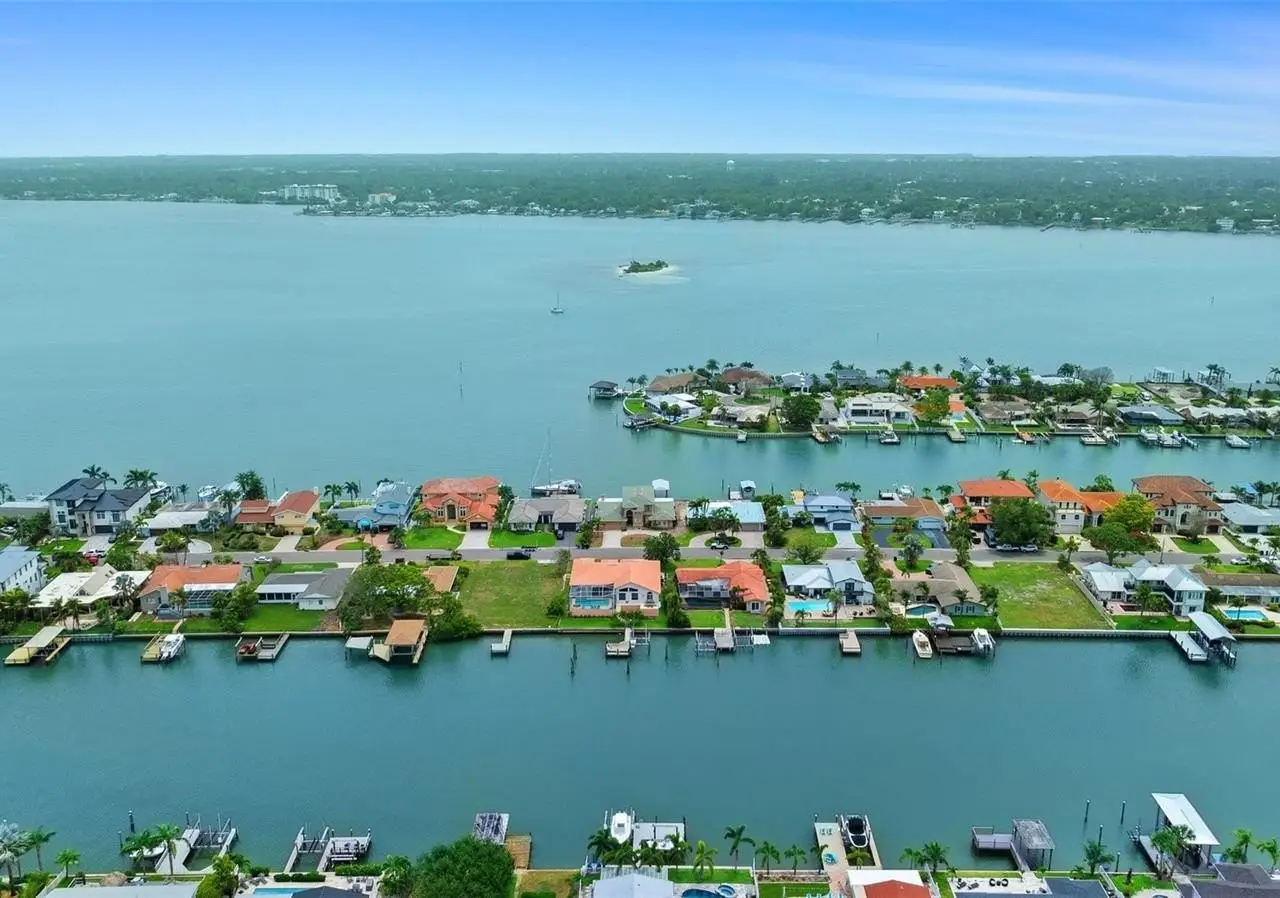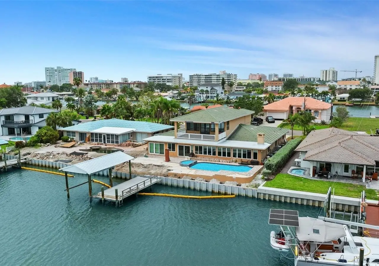 One or more photo(s) has been virtually staged. Create your waterfront dream home on Island Estates! This rare open water property offers breathtaking open Intracoastal views, over 80 feet of prime water frontage—ideal for boating, panoramic views, and maximizing your waterfront lifestyle, a brand-new seawall (2025), and deep-water canal access—bring your boat and enjoy quick Gulf access. The existing 3-bedroom, 3.5-bathroom home with an dem/office and 2-car garage features a private upstairs primary suite with en suite bath and its own balcony overlooking the water. The home was professionally remediated after flooding—dry, structurally sound, and ready to be beautifully renovated or reimagined to suit your style. Enjoy a pool and jacuzzi (virtually staged) overlooking the water. A large covered dock makes for the perfect waterfront setup. Major updates include a new AC (2024), roof (2019), and most windows and doors updated in 2020. Located in a golf cart-friendly island community, just minutes from Clearwater Beach, dining, shopping, and the Clearwater Marine Aquarium. Sold AS-IS—bring your vision to life! Some pictures have been virtually staged.