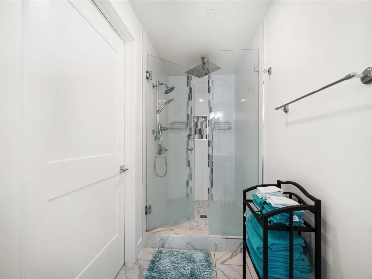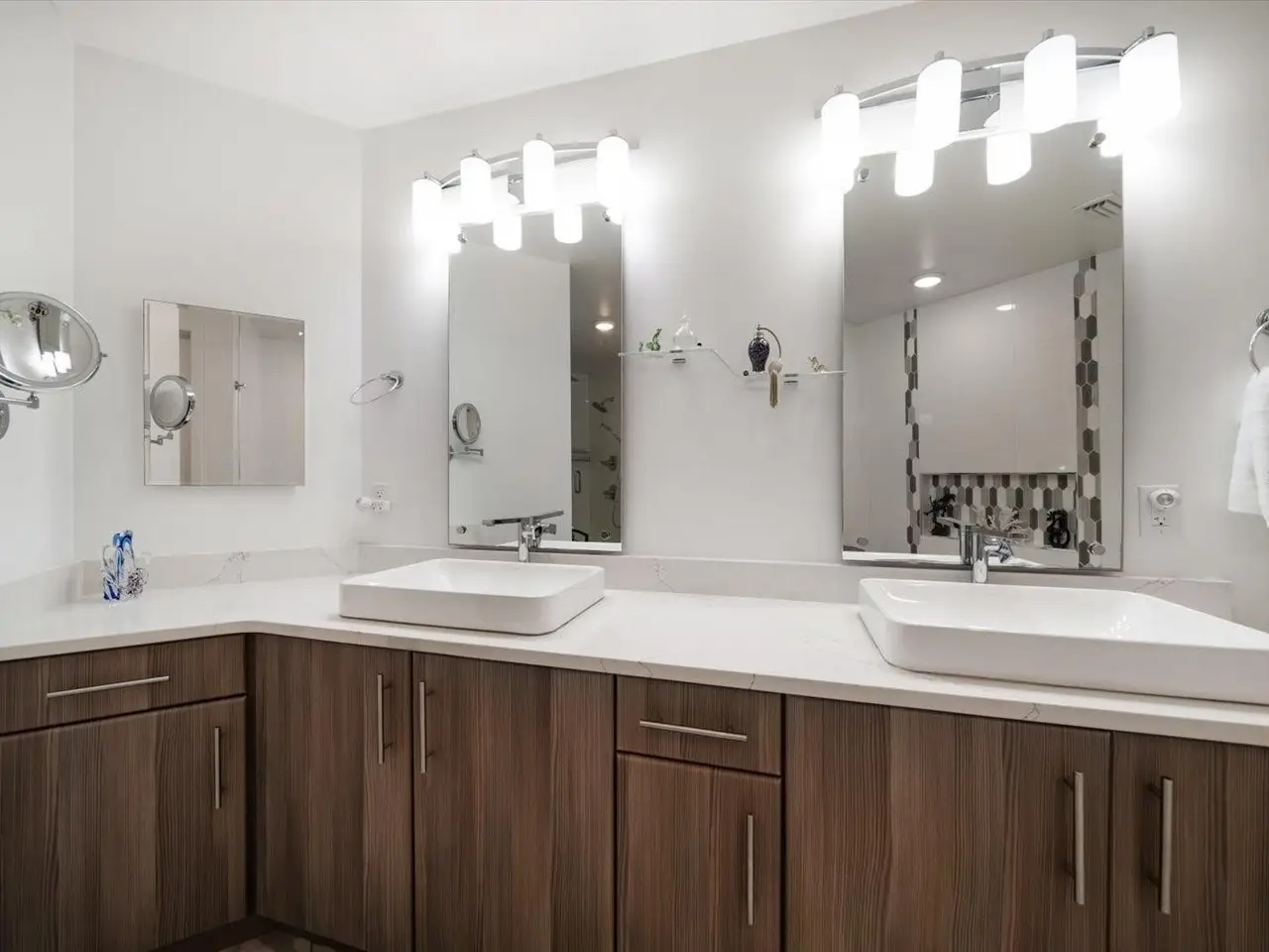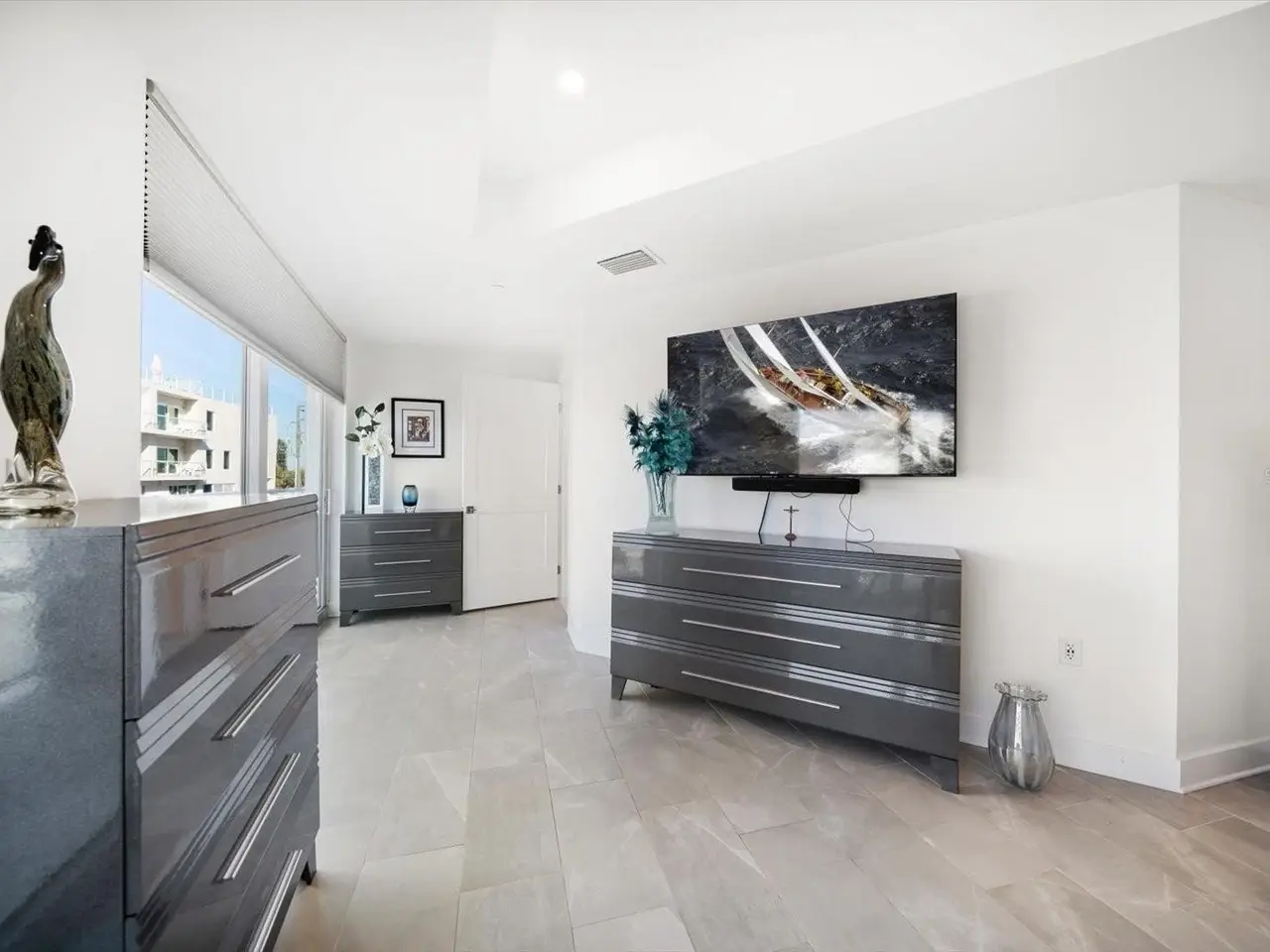 Motorized cellular shades in primary suite