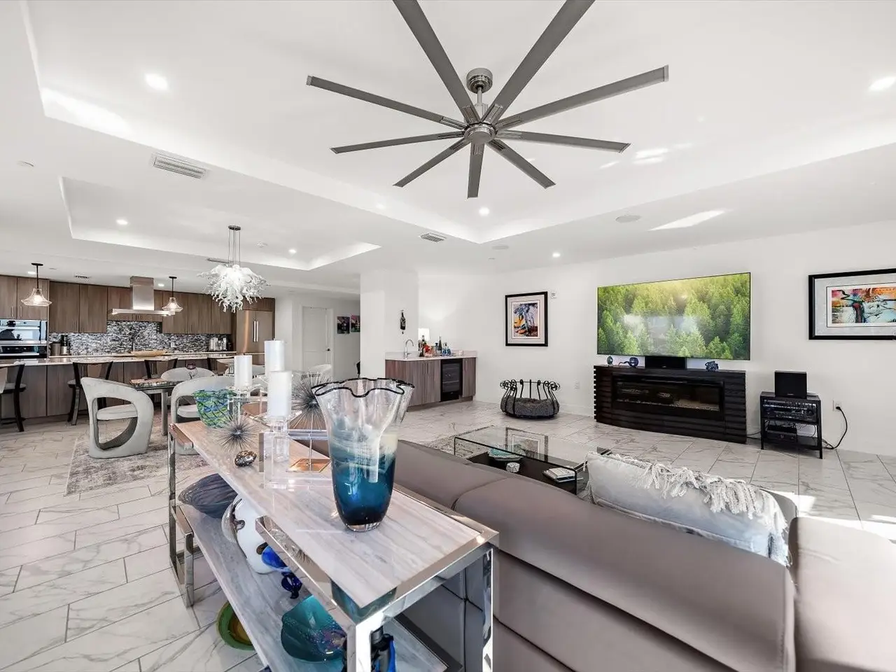 Oversized kitchen island with quartz countertops