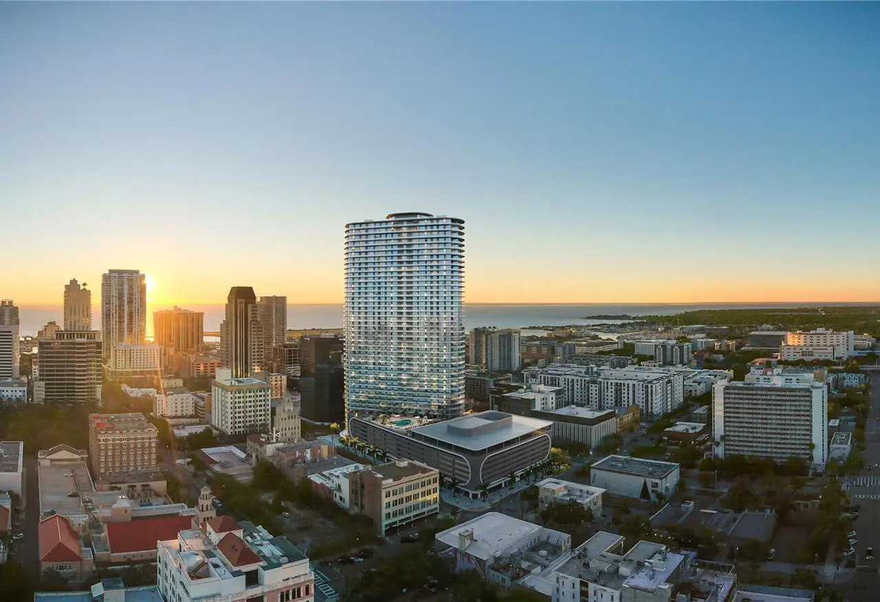 Under Construction. An iconic design by award-winning Arquitectonica with interiors and amenities by NYC-based Celano Design Studio, 400 Central introduces a new standard of luxury living in downtown St. Petersburg. This well-appointed 2-bedroom, 2.5-bath residence features 10' ceilings and floor-to-ceiling glass that floods the space with natural light. A full-length terrace offers seamless indoor-outdoor living with sweeping views from the living/dining area and both bedrooms. The gourmet kitchen is equipped with Italian cabinetry, quartz countertops, under-cabinet lighting, and premium JennAir appliances including a 36" refrigerator, gas cooktop, wall oven/microwave combo, and dishwasher. The spacious primary suite includes a large walk-in shower with bench, Grohe fixtures, and Whirlpool washer/dryer. Enjoy over 36,000 sq ft of 7th-floor amenities including a heated resort-style pool, state-of-the-art fitness center, theater lounge, private dining room, zen garden, and poolside cabanas. The 45th-floor Sky Lounge and Observatory provides breathtaking 360-degree views of the city, Tampa Bay, and the Gulf of Mexico. 400 Central offers a maintenance-free, lock-and-leave lifestyle in the heart of the city—just steps from dining, shopping, and the waterfront.