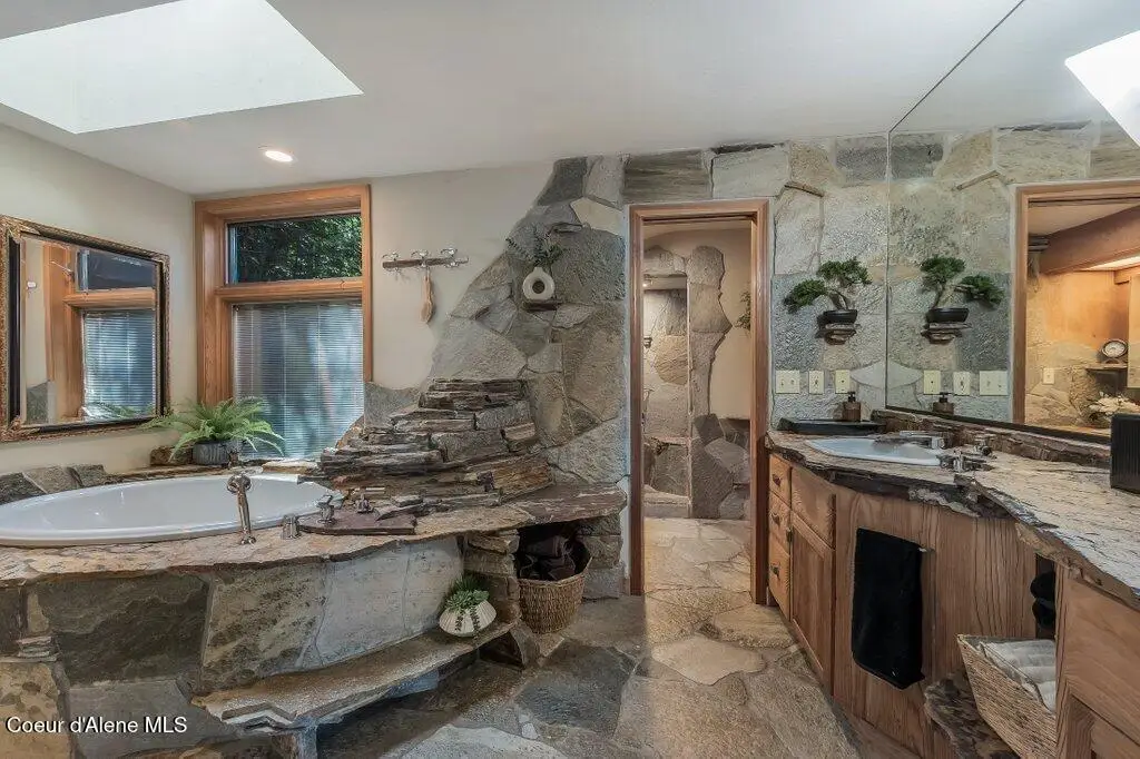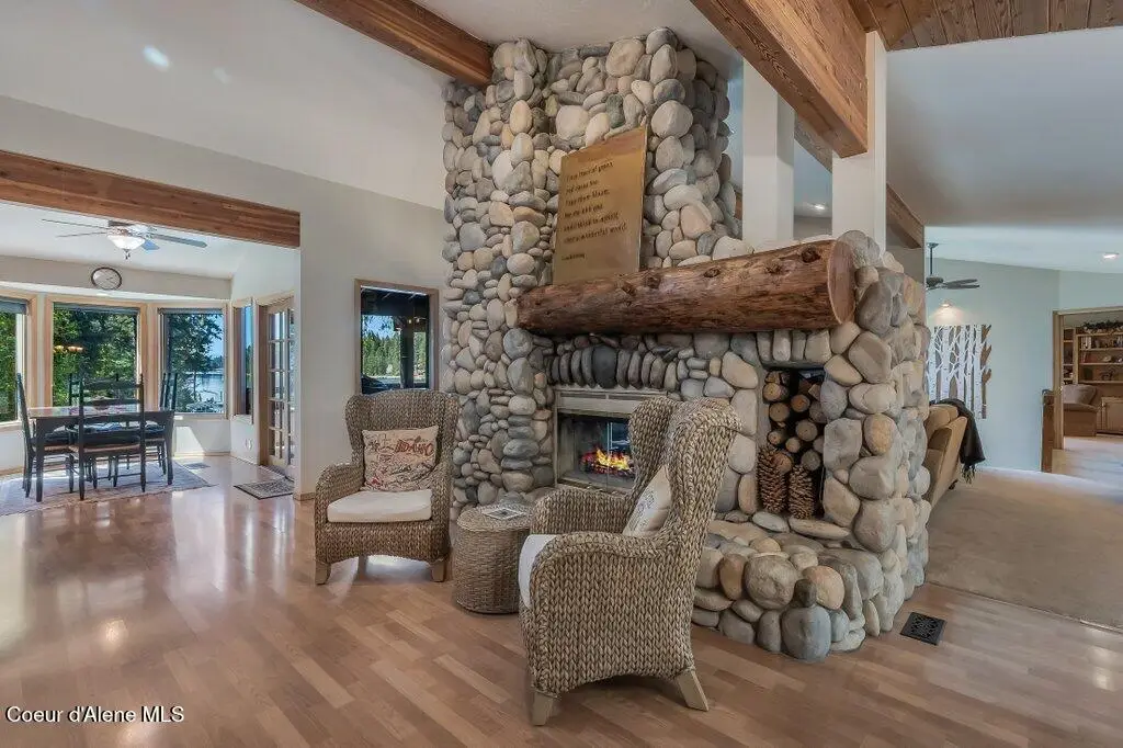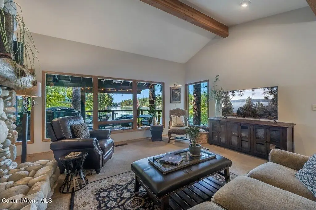 Experience waterfront luxury in this one-of-a-kind 4,449 sq. ft home on the highly desirable south side of the Spokane River. Set in a secluded, private neighborhood on 0.6 acres with 150 ft of prime riverfront, this custom built 3 bed 3.5 bath home offers breathtaking views, exceptional outdoor living and a warm lodge like ambiance with rich wood beams and river rock accents throughout. Inside, you'll find a thoughtfully designed layout featuring an open concept living area, soaring vaulted ceilings and expansive windows that flood the home with natural light. The fully upgraded kitchen boasts ample space for entertaining family and friends. The Master bedroom offers comfort & privacy with a spa inspired bathroom & large oversized custom closet. Large office with river views. Step outside to your own private riverfront Oasis complete with a large swim grotto style area, a private dock with boat lift & multiple outdoor living spaces for dining, relaxing & taking in the tranquil views