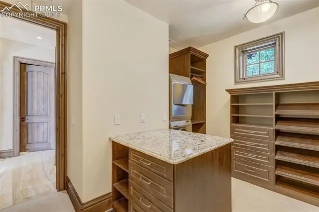 Luxurious primary suite with fireplace, 2 closets, and spa-like bath