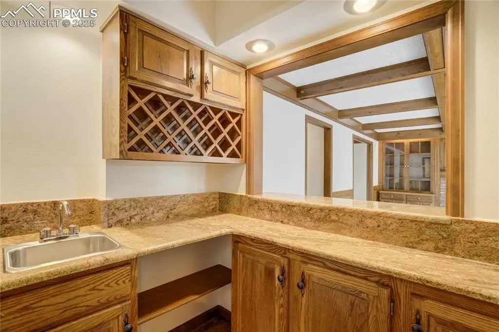 Set in the Broadmoor Bluffs neighborhood near D-12 schools, this home combines mountain & city views w/ a private, nearly half-acre lot close to parks, trails, shopping & military bases. A covered entry opens to solid oak hardwd flrs & a formal living rm framed by a bay window, crown molding, & views of the landscape. From here, the layout flows into the great rm where craftsmanship stands out, beamed ceiling, wainscoting paneling, built-ins, FP, & a wall of windows w/ walk-out access. An integrated bar w/ sink, granite counters & storage enhances the space while keeping everything tucked neatly away. The adj gourmet kitchen offers an eating nook surrounded by windows & deck access, plus hardwd flr, center island, granite countertops, updated lighting, tile backsplash, SS appliances incl range-top & wall oven, pantry, & built-in work area. A formal dining room connects easily, designed w/ crown molding & chair rail. Completing the main lvl is a half bath & a laundry room w/ sink, cabinets & window. Upstairs, the primary suite features a tray ceiling, sitting area w/ wd-burning FP, & large windows. The adj 5-pc bath has vaulted ceilings, soaking tub, glass shower & tile flooring, plus a massive walk-in closet w/ custom shelving & bonus room. Three additional bedrooms share the upper level each spacious w/ large closets & new carpet throughout. One bedroom captures mountain views, while all share easy access to a hall bath w/ tiled surround. The finished bsmnt expands the living space w/ a rec room anchored by a FP at one end & open space at the other, plus a bedroom & bath nearby. storage room w/ built-in shelving. Outdoors, a composite deck w/ wrought-iron railing overlooks the xeriscaped backyard, complete w/ fenced garden space & privacy from mature trees. The lot feels secluded while still connected to every convenience. Add highlights incl central A/C, HE furnace, metal tile roof, brick & stucco ext, oversized 2-car garage w/ 220V, & quality finishes throughout.