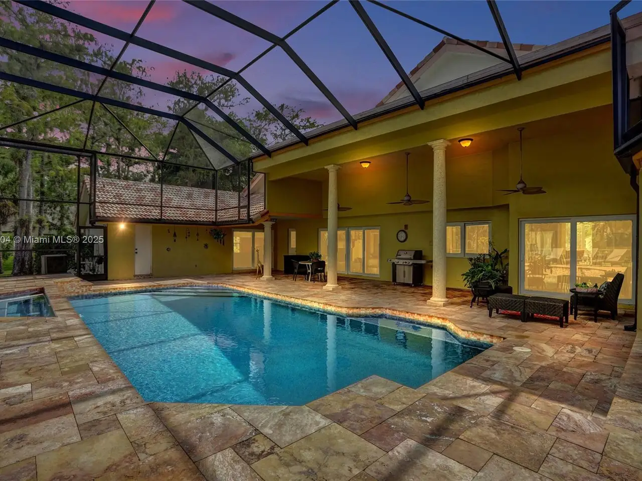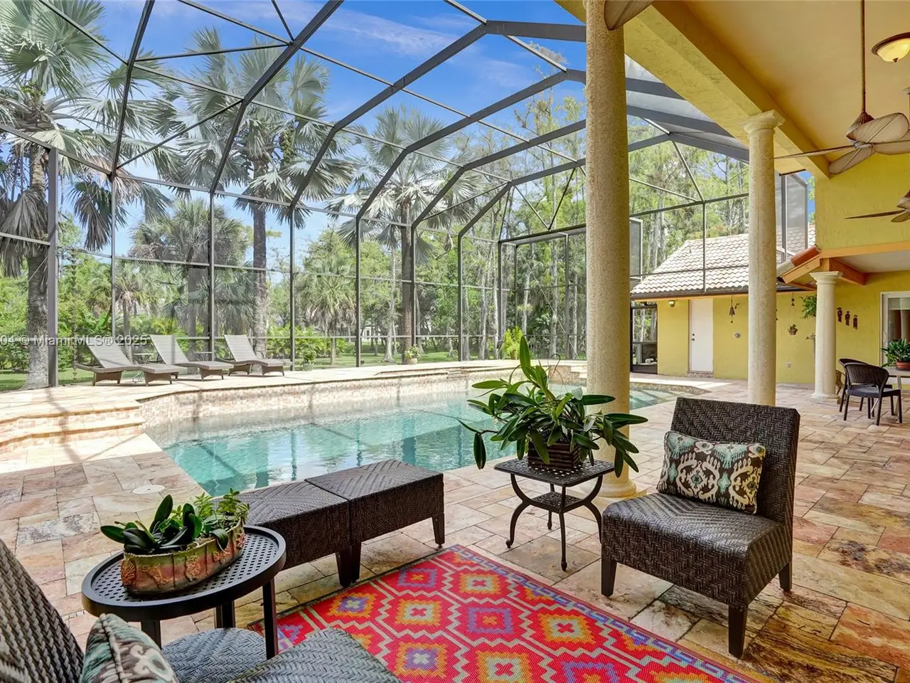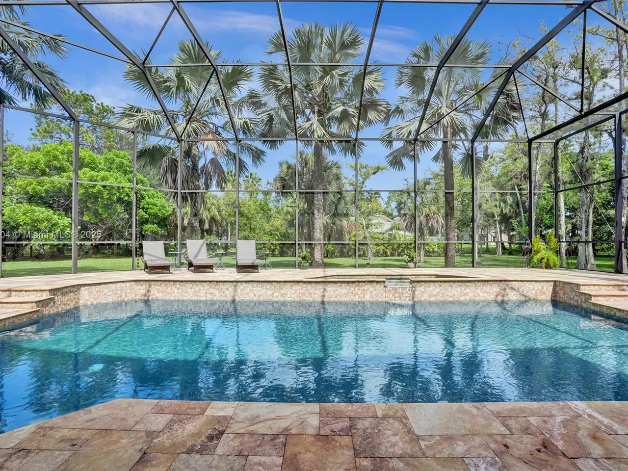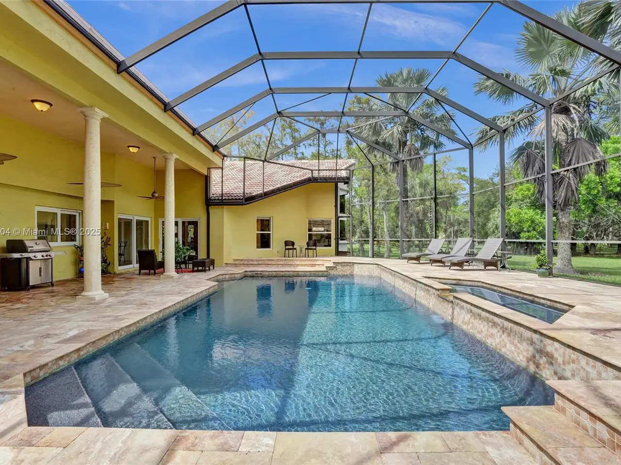 Wow! Great buy on this custom built true six bedroom home with over 4,300 square feet of living area on a wooded 1.02 acre cul-de-sac lot! Impact windows and sliding glass doors! Spectacular 24-inch diagonal marble flooring! Custom "in-law" suite includes gallery, separate additional primary luxury bedroom and bath, and en suite guest bedroom and bath! Huge dome screened remodeled heated waterfall jacuzzi and pool with marble deck! Three new air conditioners in 2019, 2023, and 2025!