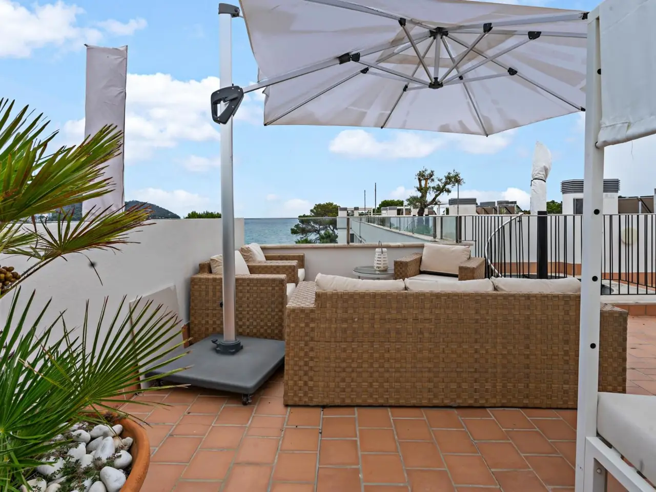 Fantastic penthouse apartment with a huge roof terrace on the seafront in Port Vell near Costa de los Pinos. This stunning penthouse is located directly on the sandy beach and just minutes from the renowned Costa de los Pinos Golf Club. Numerous restaurants and the beautiful Costa de los Pinos beach are also nearby. The apartment is located on the second floor of the luxurious "Costa Beach" residential complex, which boasts a large communal pool and beautiful green areas perfect for relaxation. The penthouse offers two beautiful bedrooms, two bathrooms, and a spacious, open-plan living-dining area with a modern kitchen and a practical utility room. The living room opens onto a large balcony with an outdoor dining area – the perfect place to enjoy meals overlooking the pool, the sea, and the garden. A staircase from the balcony leads to a spacious roof terrace of approximately 77m², ideal for outdoor activities with family and friends – including spectacular, unobstructed sea views and stunning surroundings. All materials and fittings used are of high quality. The bedrooms have air conditioning with heating and cooling functions. The basement offers a large underground parking space and a storage room. This is a unique opportunity to acquire a dream apartment right on the beach – perfect for the warm summer months or year-round living in Mallorca. Contact us to arrange a viewing!