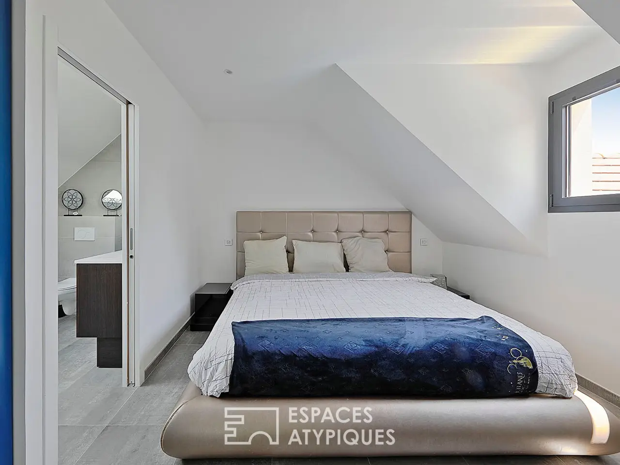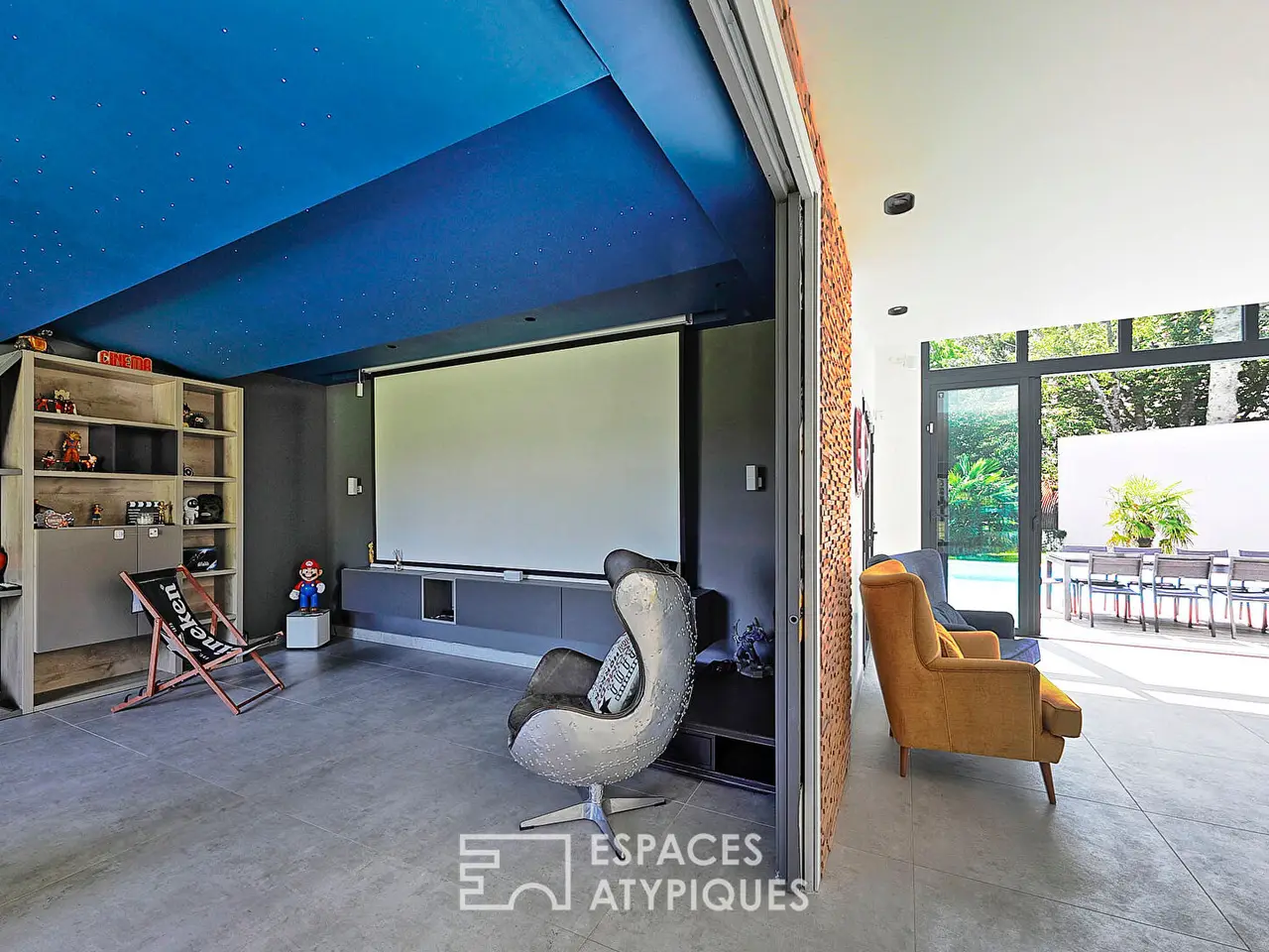 Maison d'architecte avec piscine et jardin paysagerIn a hamlet halfway between Crecy-la-Chapelle and La Ferte-sous-Jouarre in a preserved and green environment, this contemporary architect-designed house from 2018 develops a living space of 442sqm in total on two levels, on a landscaped plot of almost 2800sqm. Designed to combine volume, light and high-end comfort, it has five suites, a heated salt-water swimming pool, a jacuzzi, a 50sqm garage with a fast-charging electric terminal, and an unobstructed view of the countryside. From the entrance, the clean lines, the chosen materials, the brightness and the generosity of the volumes set the tone. The ground floor houses a master suite with a double dressing room and shower room, an office space, a dining room, a separate fitted kitchen with a scullery and pantry, bathrooms, and a living room bathed in light through a bay window opening onto the terrace and the swimming pool. A bar area and a home cinema with multiple screens enhance the conviviality of the place. Upstairs, the glass-floored landing leads to three suites with a dressing room and shower room, a fourth suite with a spa bathroom, a mezzanine living room and a gym/games room. The carefully designed interior layout allows for smooth and functional circulation. The outdoor spaces offer a real relaxing break: a 5×11 m heated swimming pool, a 5-seater jacuzzi, a continuous terrace, a fitted summer kitchen, a shower room and bathrooms for exiting the pool or spa, as well as a landscaped garden structured around various species, olive trees, palm trees, cherry trees and colorful hedges. The equipped well provides watering and supplies the sanitary facilities. One hour from Paris, this property benefits from a bucolic setting while remaining close to amenities, schools and transport links. Solar panels, underfloor heating by insert, reversible heat pumps, double aluminum glazing, home automation and optimal energy performance: a rare property, with an atypical character, ideal for a large family and with strong rental potential, currently operated as an Airbnb. ENERGY CLASS: A / CLIMATE CLASS: A Amount of annual energy expenditure for standard use established from energy prices indexed for the years 2021, 2022, 2023 (subscription included) between EUR965 and EUR1305 per year. Contact: Elvire de la MARTINIERE - 06 03 05 05 96 RSAC: 800 930 232 MEAUXREF. SM1158Additional information* 11 rooms* 5 bedrooms* Outdoor space : 2748 SQM* Parking : 5 parking spaces* Property tax : 3 797 €Energy Performance CertificatePrimary energy consumptiona : 41 kWh/m2.yearHigh performance housing*41kWh/m2.year1*kg CO2/m2.yearA*B*C*D*E*F*GExtremely poor housing performance* Of which greenhouse gas emissionsa : 1 kg CO2/m2.yearLow CO2 emissions*1kg CO2/m2.yearA*B*C*D*E*F*GVery high CO2 emissionsEstimated average annual energy costs for standard use, indexed to specific years 2021, 2022, 2023 : between 965 € and 1305 € Subscription IncludedAgency feesThe fees include VAT and are payable by the vendorMediatorMediation Franchise-Consommateurswww.mediation-franchise.com29 Boulevard de Courcelles 75008 ParisInformation on the risks to which this property is exposed is available on the Geohazards website : www.georisques.gouv.fr