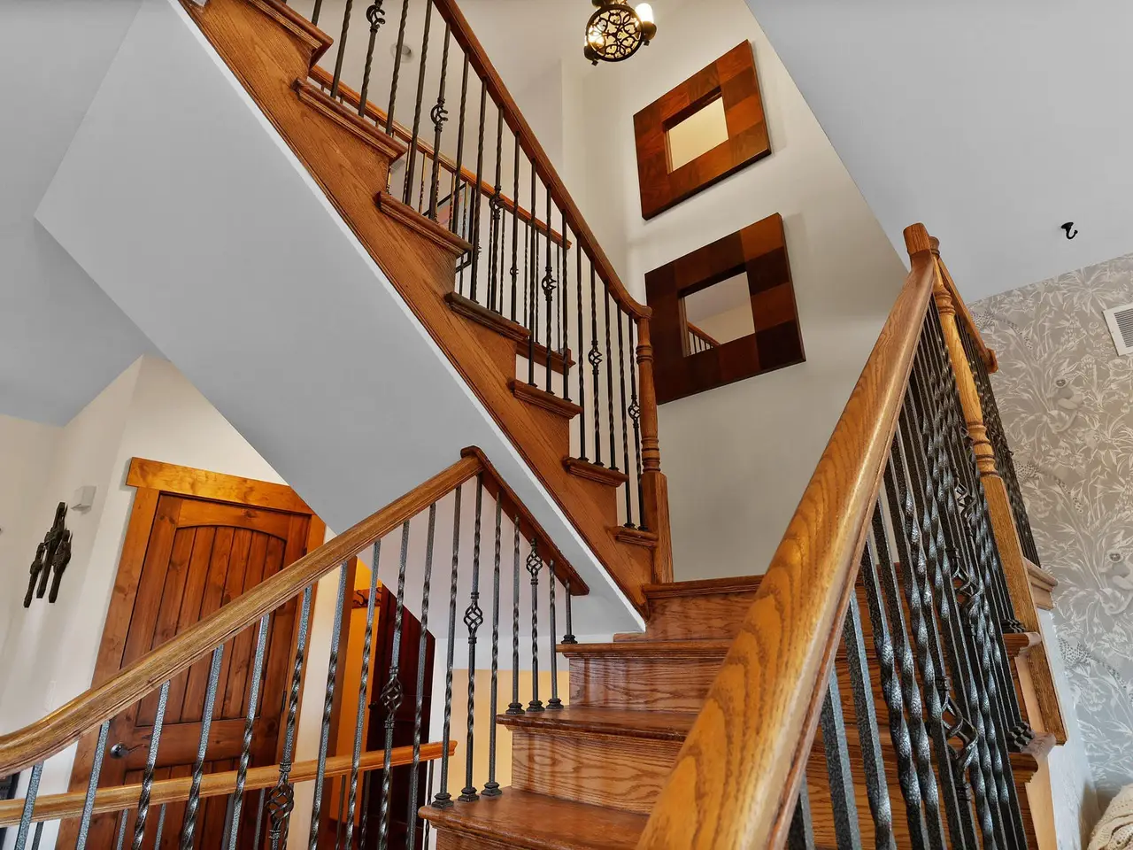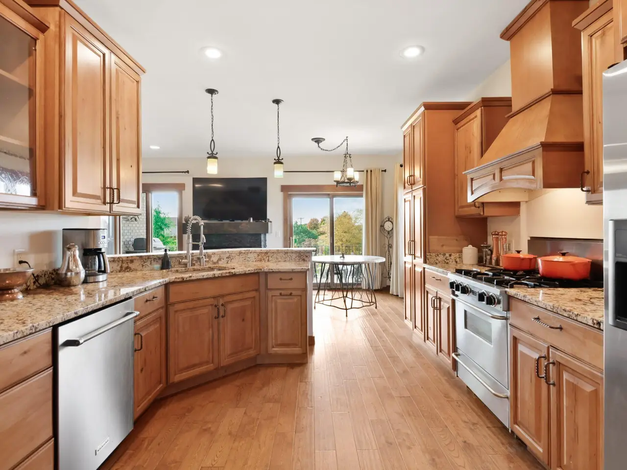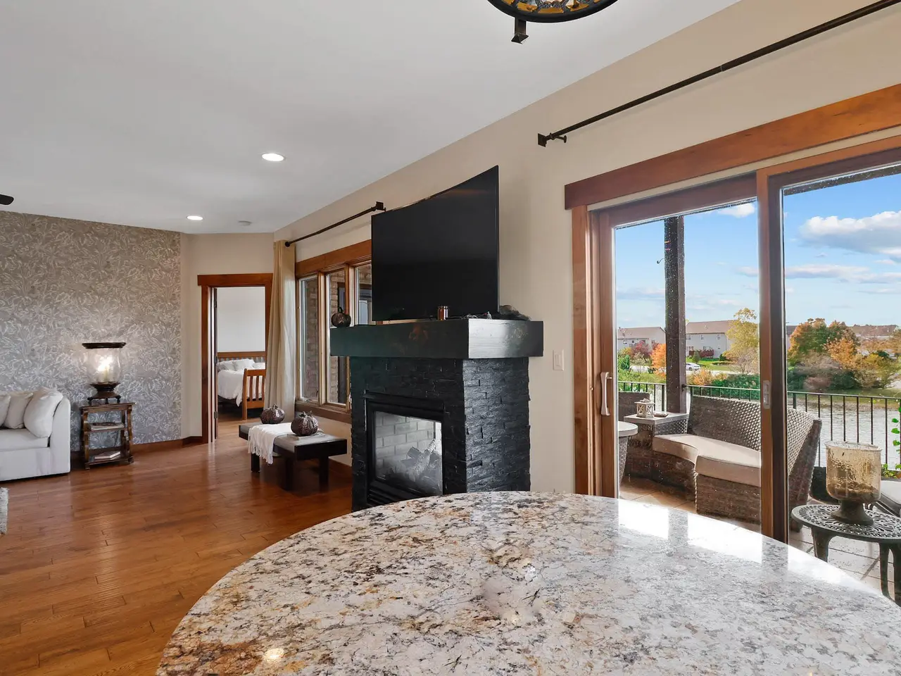 Gorgeous brick and stone home with a finished walkout is nestled into a hill with water views from every window. A seamless blend of old world charm and modern appointments create a warm and inviting retreat. 5 custom baths, 4 beds, 4 fireplaces including the masonry outdoor fireplace, 3 outdoor spaces with 2 tiled, covered balconies & a large paver patio, kitchens located on the main and walkout level perfect for entertaining or related living plus a dock with premium MoistureShield Decking for taking advantage of swimming, boating & fishing on Doubletree Lake. Handscraped oak hardwood flows throughout the main level including the entry, dining with coffered ceilings, kitchen with character maple cabinetry & Delicatus granite counters, breakfast room & living rooms featuring an indoor/outdoor fireplace open to the 22' x 10' balcony. The upper level owner's suite is a true escape with a double sided FP, balcony, two 20'x 6' WICs & a spectacular bath lined in antiqued marble with 2 floating vanities, 2 person tub, walk-in shower & linen closet. Main level primary with ensuite hosting a whirlpool tub & tile shower, large WIC & balcony access. Main floor 2nd bed & upper level 4th bed/bonus room are both adjacent to their own stunning baths. The walkout is perfect for entertaining with acid stained concrete floors & a kitchen featuring built-in full size fridge & freezer units, convection microwave, oven & warming drawer, gas cooktop plus a freestanding island with integrated bench seating. A convenient basement bath features a beautiful shower with high definition granite look walls perfect for a rinse after a day on the lake. The family room with gas FP & coffered ceilings, gym and storage area complete the basement. Back & side sliders access the expansive patio. Whether you'll be enjoying the gorgeous water views year round or using this for your lakefront getaway, the quality craftsmanship and premium finishes make you feel like you're living on holiday every day.