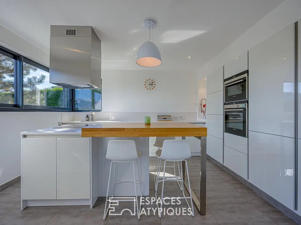 Nestled on the heights of Cuvat, this contemporary house of over 160 sqm Carrez law combines modern comfort, architectural elegance, and an exceptional panorama with an exceptional view.Built on a wooded plot of approximately 800 sqm and fully fenced, this property seduces with its architecture combining traditional construction and a wooden frame.Every detail has been designed to offer a unique living environment.From the entrance, the tone is set: generous volumes, integrated storage, and omnipresent light.The ground floor is organized around a vast living room enhanced by large bay windows extending the space outside with an unobstructed view present on all sides.The living room, the dining room, and the open kitchen, fully fitted and equipped, harmonize seamlessly.A separate laundry room completes this level, designed to combine aesthetics and practicality on a daily basis.Upstairs, a large hallway leads to the sleeping area, which consists of four bright bedrooms, one of which has a separate dressing room.Two elegant bathrooms, both equipped with walk-in showers, complete this level designed to comfortably accommodate an entire family.An additional room offers the possibility of creating an office or a games room, depending on the desires and projects of each individual.Outside, a large terrace offers a natural extension and constitutes a privileged space to enjoy convivial moments facing a magnificent unobstructed view.A wooded garden, a true cocoon of greenery, stands out as a haven of tranquility throughout the seasons.Several parking spaces as well as a garage complete the assets of this property.A successful combination of aesthetics, functionality and openness to nature, this contemporary house represents a rare opportunity in an area sought after for its calm, its quality of life and its exceptional panoramas.Energy class: C / Climate class: AEstimated annual energy expenditure: between EUR2,080 and EUR2,860 (reference year 2021, 2022, 2023)Information on the risks to which this property is exposed is available on the Georisques website: www.georisques.gouv.fr.REF. 2045EAAdditional information* 5 rooms* 4 bedrooms* 2 shower rooms* Floor : 2* Outdoor space : 840 SQM* Parking : 3 parking spaces* Property tax : 1 280 €Energy Performance CertificatePrimary energy consumptionc : 164 kWh/m2.yearHigh performance housing*A*B*164kWh/m2.yearC*D*E*F*GExtremely poor housing performanceEstimated average annual energy costs for standard use, indexed to specific years 2021, 2022, 2023 : between 2080 € and 2860 € Subscription IncludedAgency feesThe fees include VAT and are payable by the vendorMediatorMediation Franchise-Consommateurswww.mediation-franchise.com29 Boulevard de Courcelles 75008 ParisInformation on the risks to which this property is exposed is available on the Geohazards website : www.georisques.gouv.fr