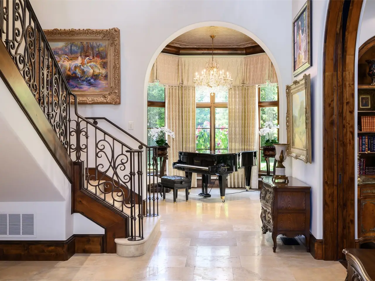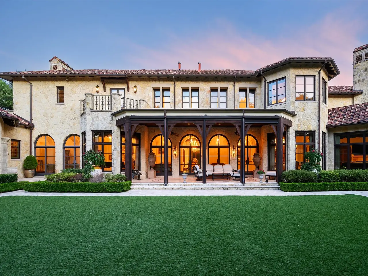 Inspired by the grand villas of the Tuscan countryside, this commanding, completely gated estate at 5335 Meaders Lane rests on a lot and a half. Its expansive presence stretching nearly a block along one of Preston Hollows most admired neighborhoods in Mayflower Estates. Designed by noted architect Elby Martin and built by Bob Thompson, one of Dallas’ most respected high-end builders, this residence captures the soul of a Tuscan mansion with modern livability. From the Italian-barrel tile roof to stately stone exteriors, every detail feels authentic. Lush grounds unfold over 1.1 acres, enhanced by moonlit mature trees, two courtyards, including a private meditation garden, and four hand-crafted fountains. Multiple verandas, terraces, and six balconies - all with beautiful sweeping views - create effortless indoor-outdoor living. A resort-style pool with cascading spouts, a just-completed sport court, and a fully appointed cabana with kitchen, fireplace, and dome ceiling set the stage for year-round entertaining. The property also offers a 1,159 square foot attached guest or au pair house with its own private exterior staircase and convenient parking pads. Inside, artistry and craftsmanship abound: a 24-foot ceiling entry with custom Solara iron stair, a 70-ft groin-vaulted gallery with hand-painted Italian frescoes, wine cellar and tasting room, billiard and game rooms, and a media room with motorized recliners. Clerestory windows frame sweeping estate views, underscoring the home’s connection to its surroundings. With geothermal HVAC, a recently installed whole-house generator, and thoughtful design, this is an extraordinary Tuscan-inspired retreat - expansive in scale, commanding in presence, and unrivaled in its Dallas setting.