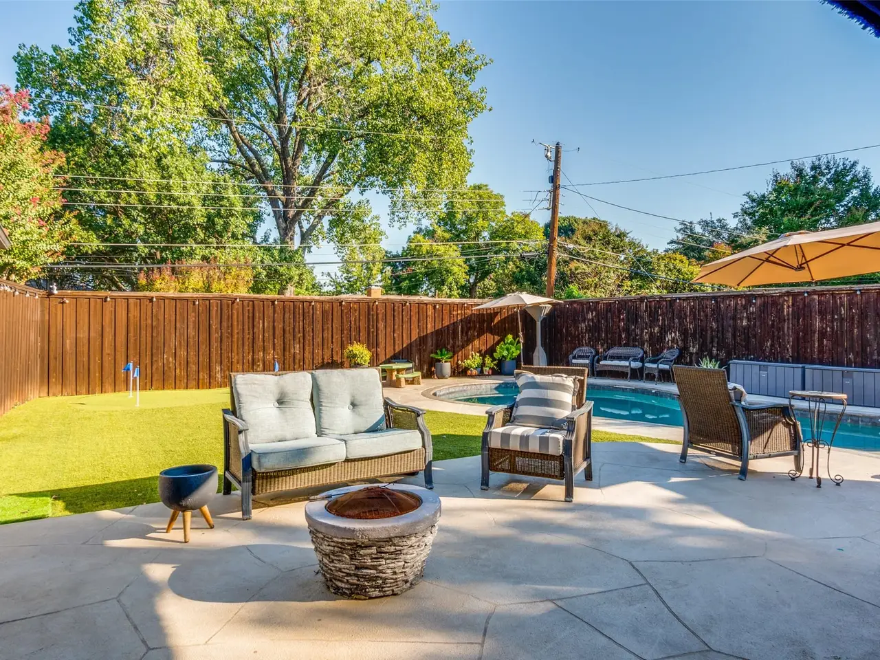 Welcome to 6121 Chesley Ln, a beautifully updated ranch-style home nestled in one of Dallas' most sought-after neighborhoods. This charming single-story residence perfectly blends timeless curb appeal with modern luxury. Step inside to find a completely remodeled chef's kitchen, featuring sleek gray cabinetry, designer lighting, a massive island with seating, and a commercial-grade gas range. The open-concept layout makes this space perfect for both everyday living and entertaining. Outside, your private backyard oasis awaits. Relax under the shade of large umbrellas, take a dip in the resort-style pool and spa, or practice your short game on the custom putting green all surrounded by lush landscaping and a privacy fence. With mature trees in the front yard, a classic red tile roof, and meticulous landscaping, this home delivers both style and comfort in equal measure. Key Features: four Bedrooms three Bathrooms Designer kitchen with high-end appliances and finishes Open-concept living and dining areas Resort-style backyard with pool, spa, and putting green Oversized lot with mature trees and lush landscaping Prime location with easy access to White Rock Lake, top schools, shopping, and dining