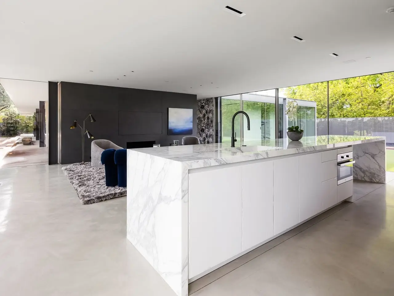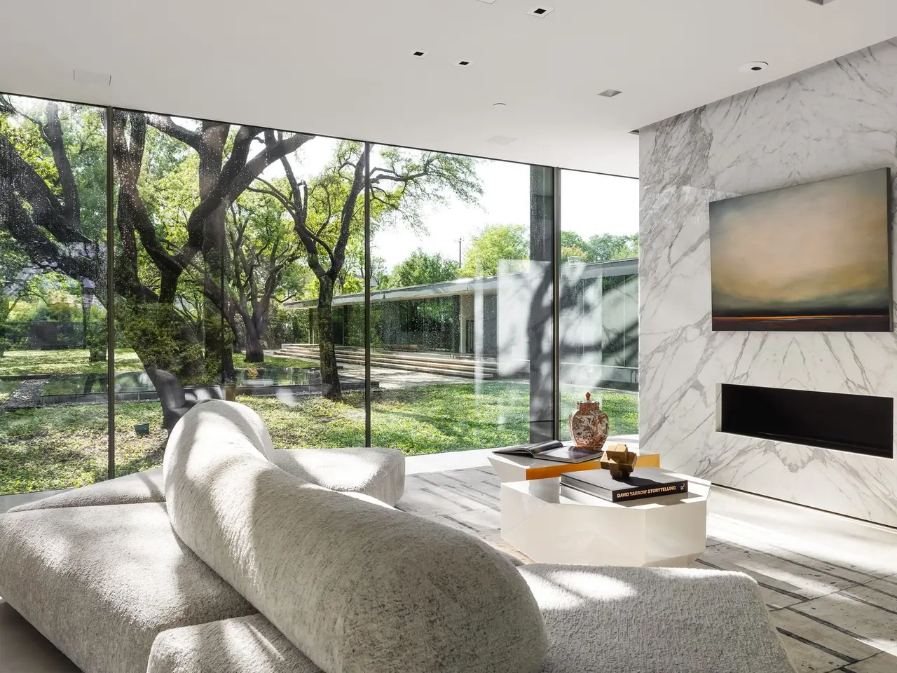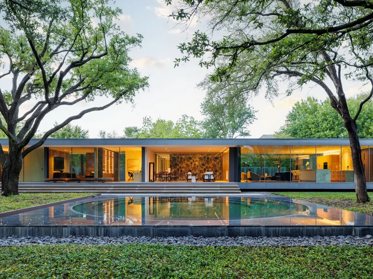 Inspired by the famous Farnsworth house, this modern masterpiece was constructed with 60 tons of steel, over 40 slabs of Calacatta marble, & cantilevers over a 5 ft-deep basement with 10,000 SF under the roof. Encased by 9 ft floor to ceiling glass windows, the home floats over the natural, minimalistic landscape intended to feel like art in park, designed by internationally-recognized Hocker Design Group. Custom acoustic ceilings keep sound from bouncing off the glass & concrete. Striking pool made of absolute black granite in concentric rings features a waterfall edge, creating the aesthetic of a floating square water-feature in the middle of the backyard oasis.