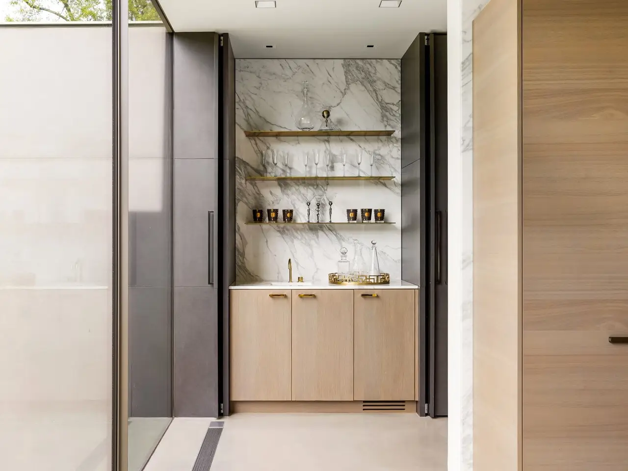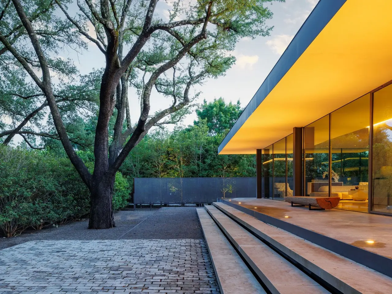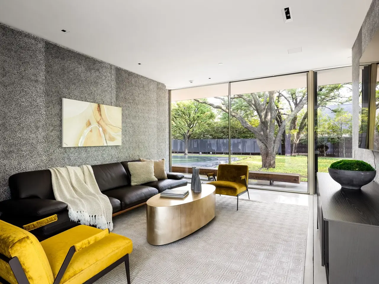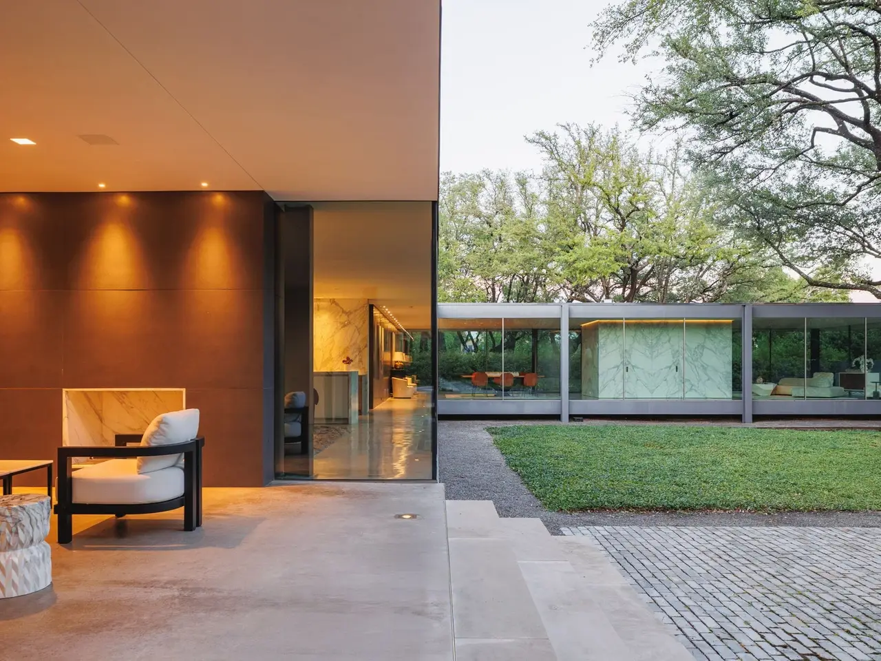 Inspired by the famous Farnsworth house, this modern masterpiece was constructed with 60 tons of steel, over 40 slabs of Calacatta marble, & cantilevers over a 5 ft-deep basement with 10,000 SF under the roof. Encased by 9 ft floor to ceiling glass windows, the home floats over the natural, minimalistic landscape intended to feel like art in park, designed by internationally-recognized Hocker Design Group. Custom acoustic ceilings keep sound from bouncing off the glass & concrete. Striking pool made of absolute black granite in concentric rings features a waterfall edge, creating the aesthetic of a floating square water-feature in the middle of the backyard oasis.