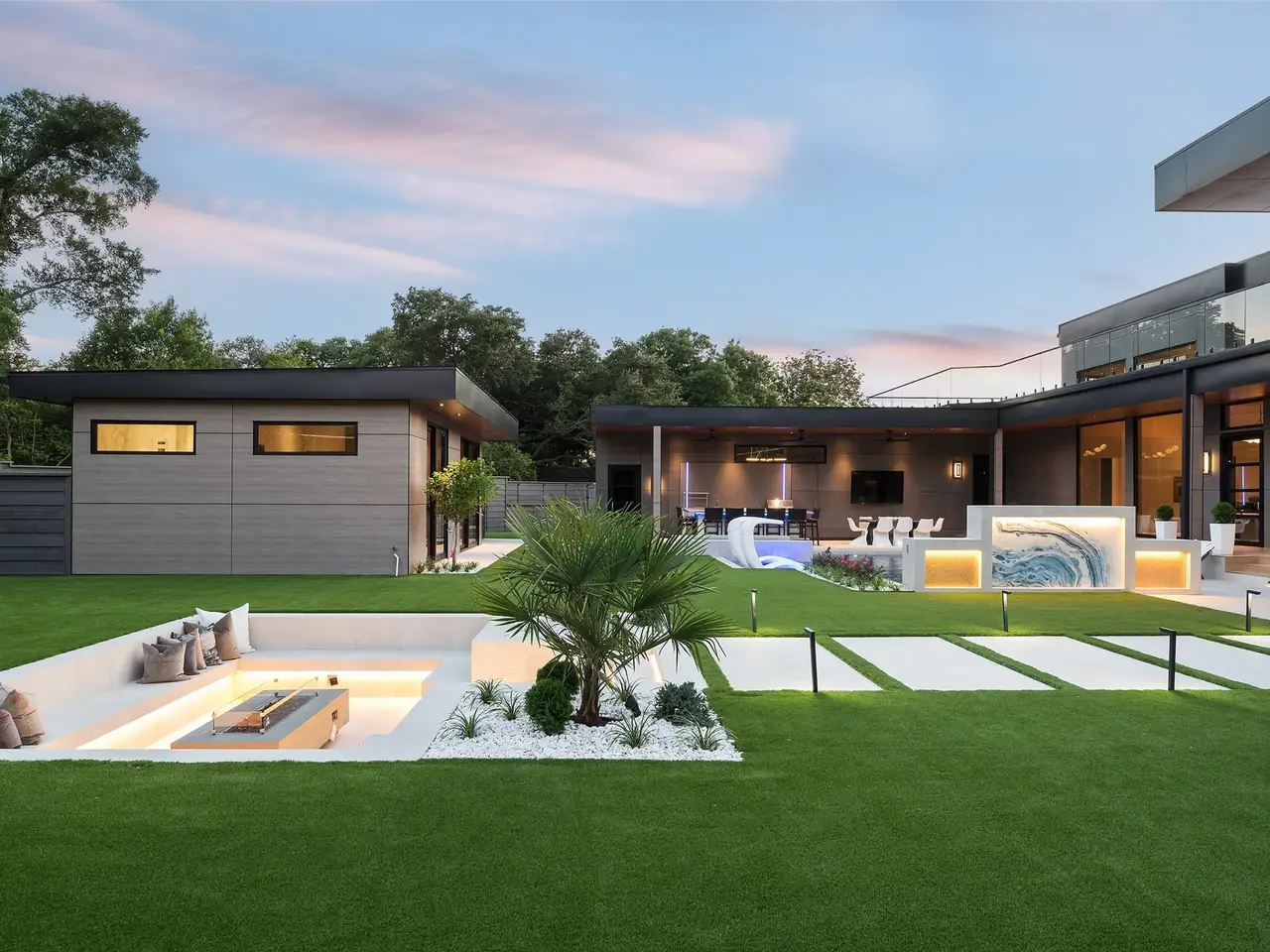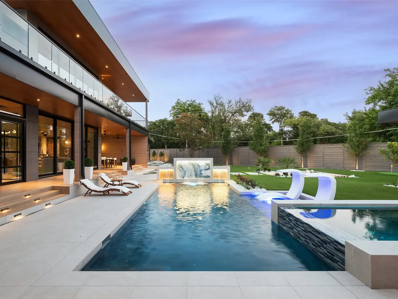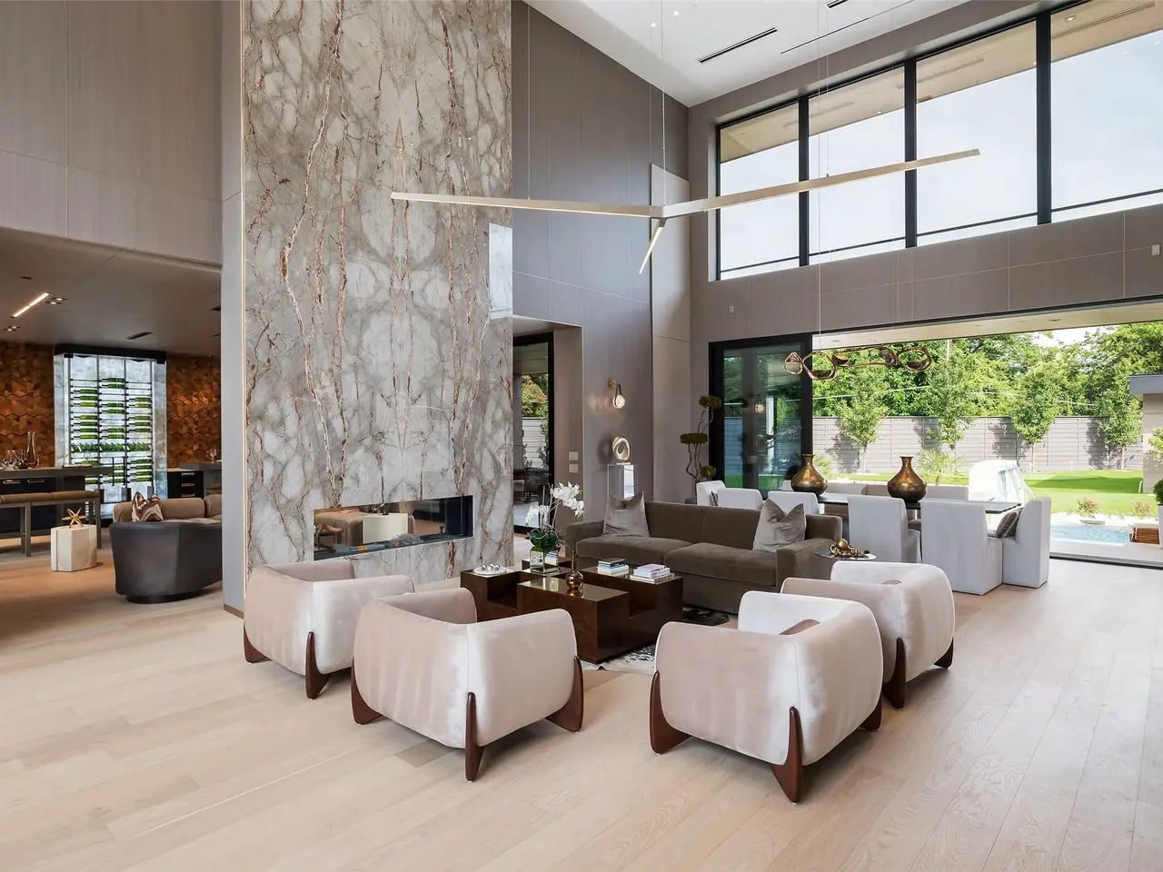 Nestled on an expansive .82-acre cul-de-sac lot in prestigious Preston Hollow, this newly constructed architectural marvel exudes unparalleled sophistication with 8500 SF in main house and a 600 SF casita. The marble slab cladding & circular driveway offers the WOW factor upon arriving at this masterpiece. Step inside & be greeted by soaring 20 ceilings and walls of glass that flood the home with natural light, creating an atmosphere of luminous refinement. The flawless first-floor design seamlessly integrates form and function, with formal living and dining areas adorned with a double-sided marble fireplace, luxurious wall paneling, & magnetic LED lighting. The stylish club room features high-top tables, a sleek bar, & a climate-controlled wine cellar. Sliding glass walls artfully separate the expansive gourmet kitchen, a culinary showpiece appointed with stone countertops, double islands, sleek Florense cabinetry, Thermador appliances, & designer lighting. A spacious pantry & separate back kitchen ensure flawless functionality. Just beyond, a media room invites guests to indulge in cinematic experiences or relax in casual luxury. The primary suite is a private sanctuary with a spa-like bathroom clad in porcelain onyx and marble, a dramatic black bathtub, impeccably appointed closets and built-in coffee bar. A secondary upstairs suite, an additional laundry room, and a stunning flamed Azure marble staircase with glass railing and walnut treads further elevate the home. Outdoor living is a symphony of luxury, boasting a heated pool with a mesmerizing Alex Turco water feature, a sunken firepit, an outdoor kitchen, and a turfed yard adorned with cherry trees and landscape lighting. A private casita with a kitchenette, full bath, and sauna offers impeccable guest accommodations or wellness retreat. Completing this modern marvel is a 4-car garage enhanced with designer lighting and bespoke wall coverings. This is the pinnacle of modern luxury living in Preston Hollow.