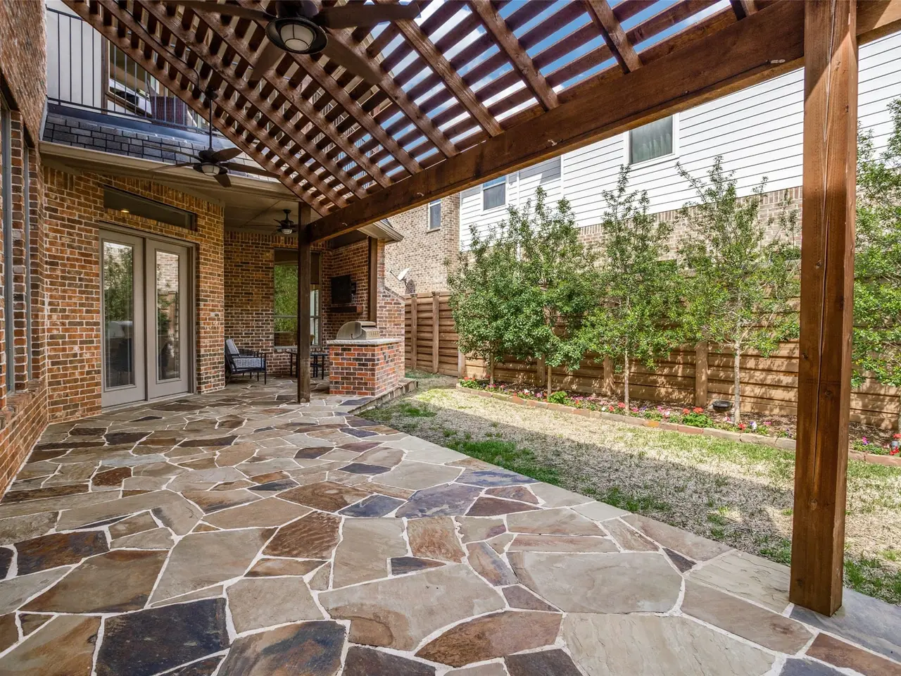 Outdoor grill and fireplace in low-maintenance living area