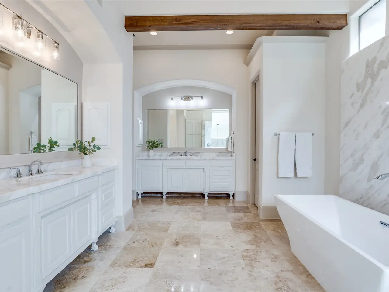 Spa-like bath with double shower and freestanding tub