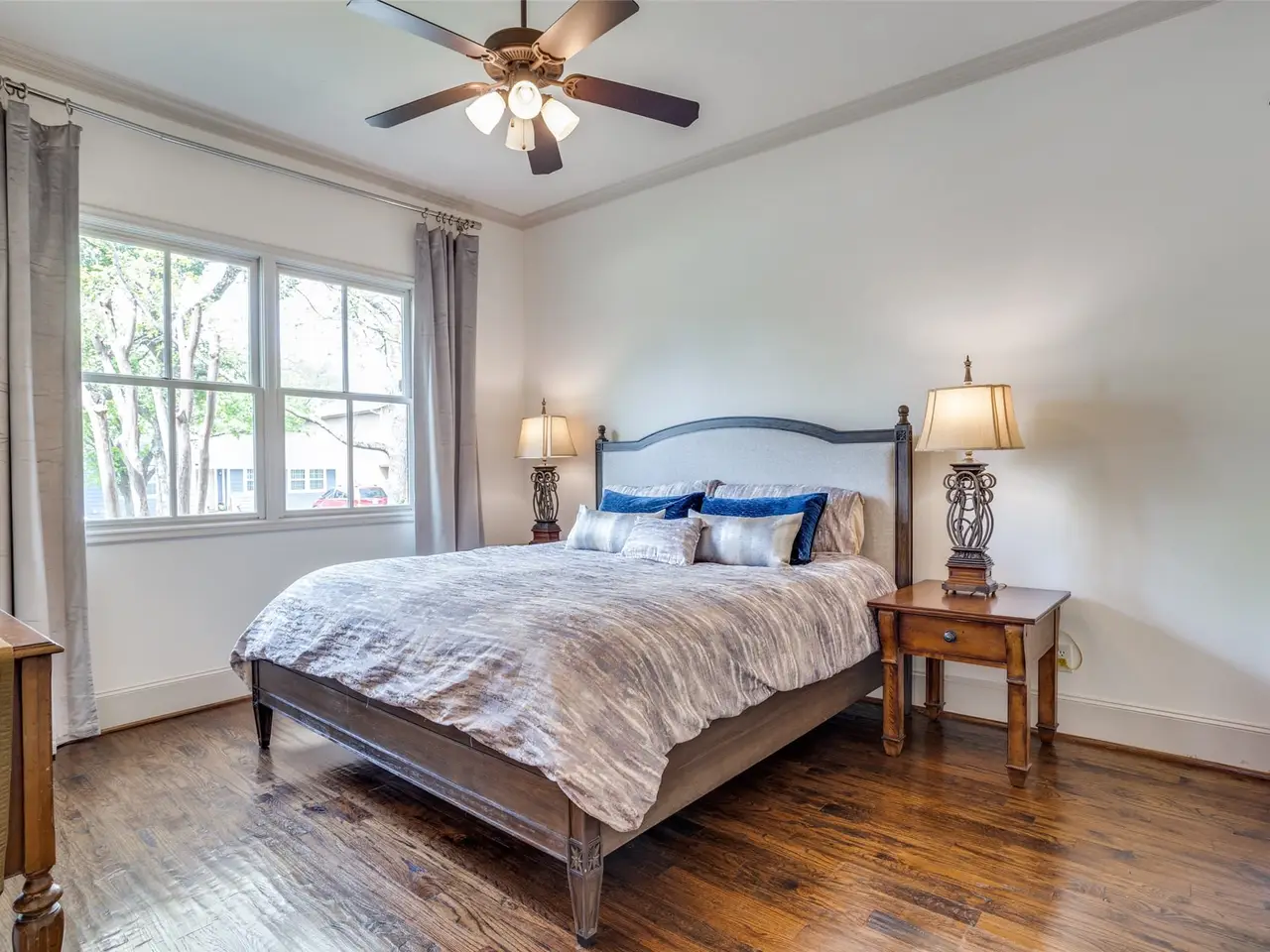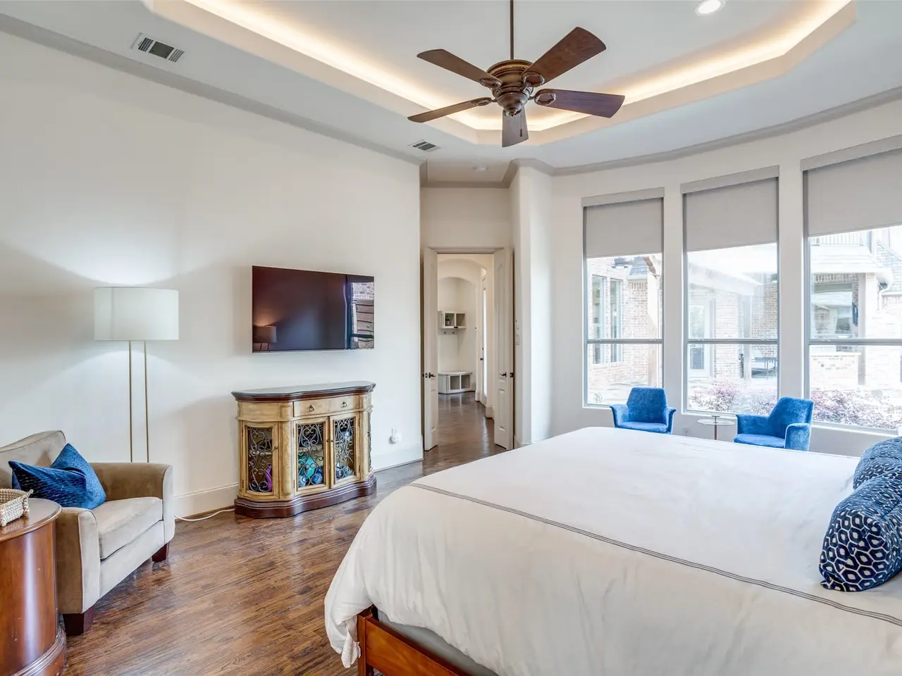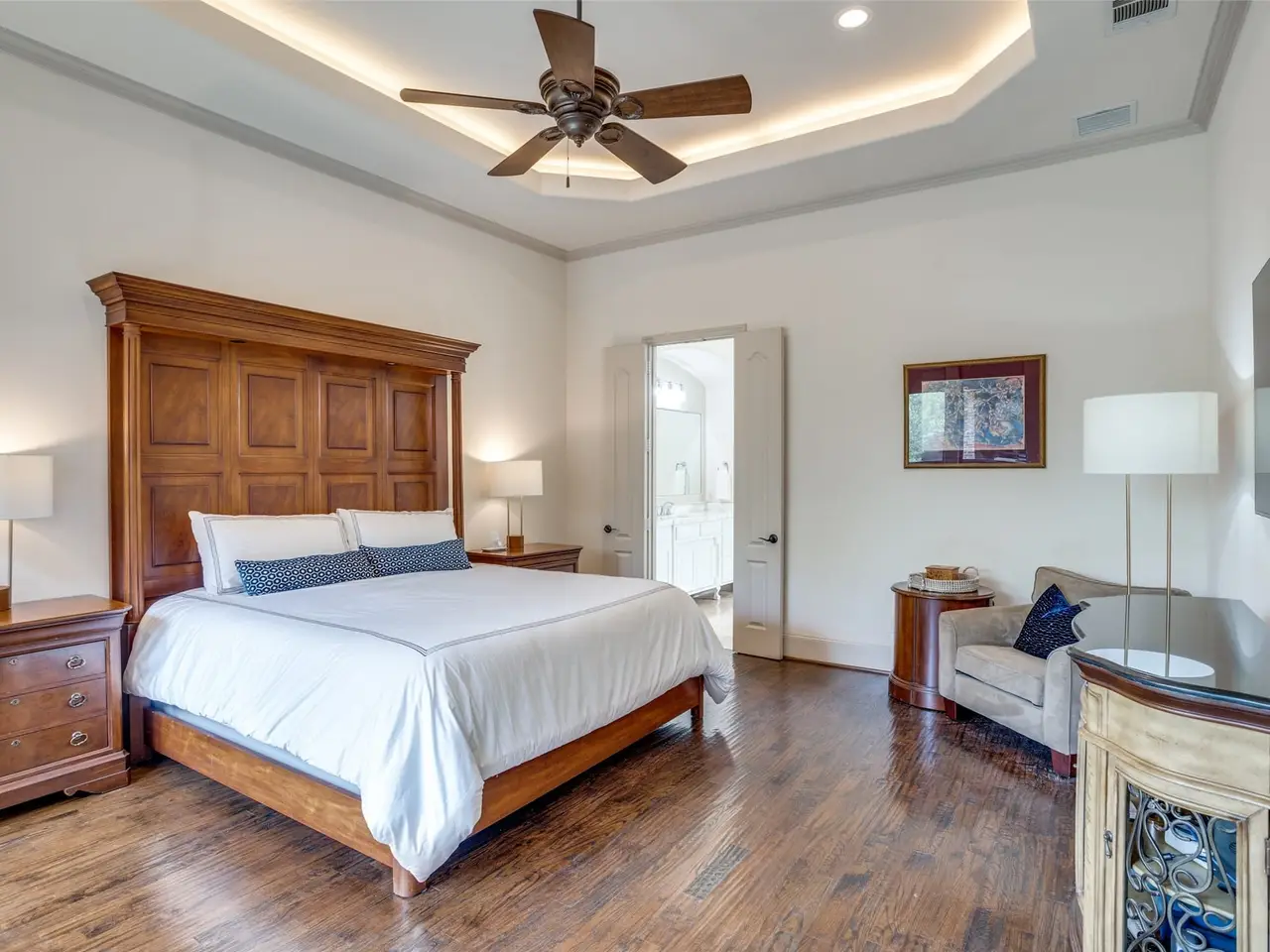 Nestled on a quiet, stately corner lot the exceptional craftsmanship and thoughtful floor plan make this home a standout. The light-filled great room showcases a floor-to-ceiling gas fireplace and spacious secondary dining area, flowing seamlessly into the chefs dream kitchen, updated with Sub-Zero and Wolf M Series appliances, built-in coffee system, wine bar, expansive quartzite surfaces, a butlers pantry, and extensive custom cabinetry. The first-floor primary suite is a private retreat with cathedral ceilings, a spa-like bath featuring a double shower, freestanding soaking tub, and striking book-matched marble. A secondary bedroom with its own bath and cedar closet is also located on the first floor; making it ideal for guests or multigenerational living. Upstairs offers two generously sized bedrooms, each with ensuite baths, a spacious game room with wet bar, a dedicated media room, and a large covered balcony; perfect for evening entertaining or quiet relaxation. A low-maintenance outdoor living area with built in grill, mosquito misting system, and a fireplace are added bonuses.