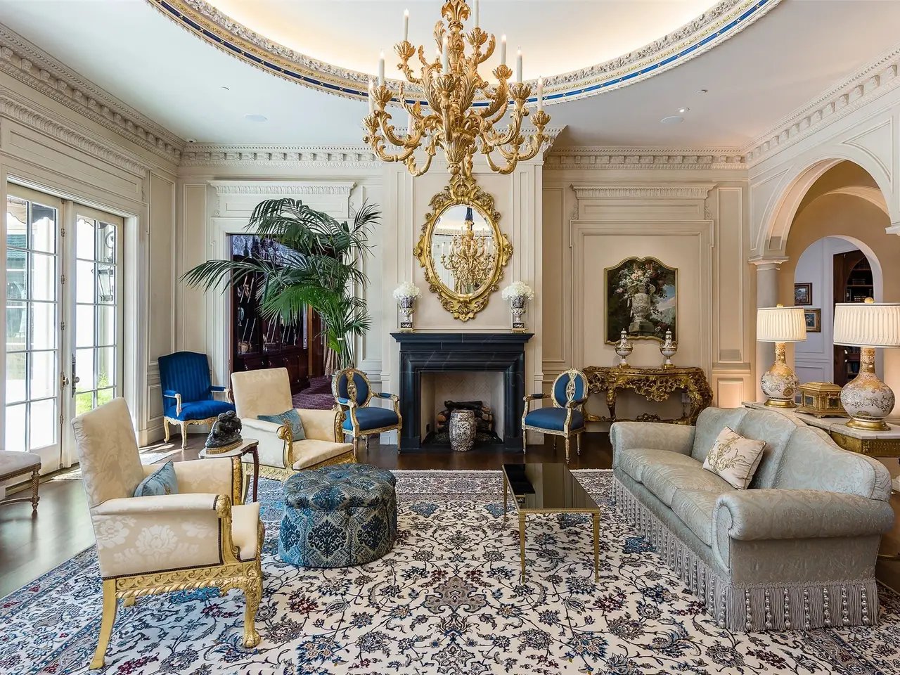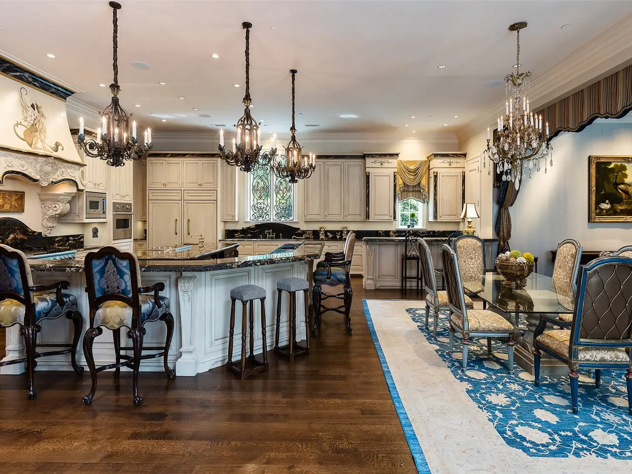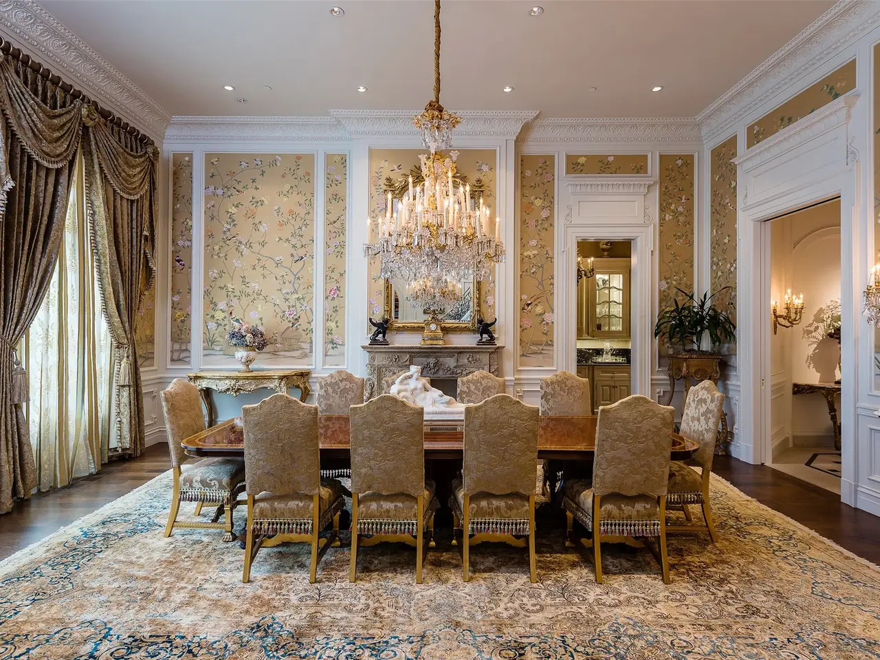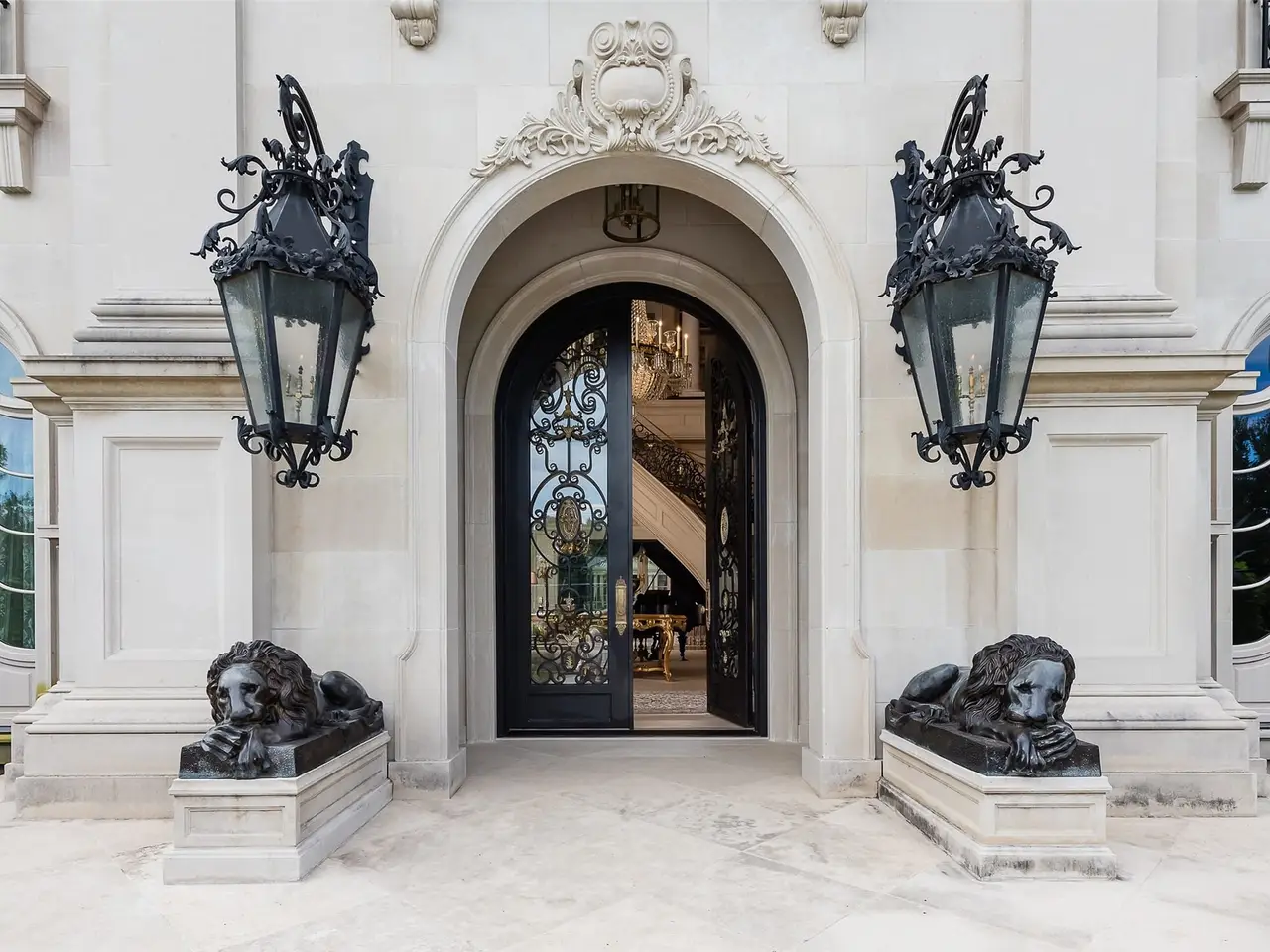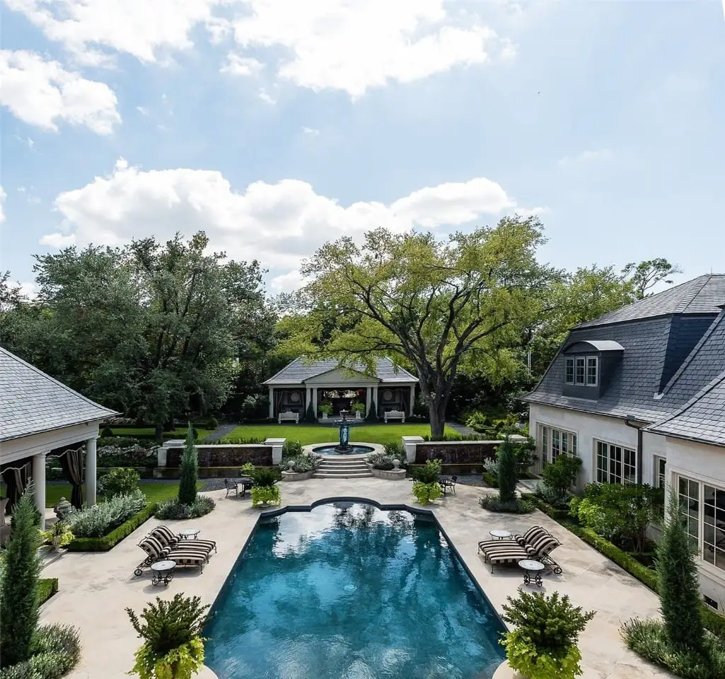 Tucked behind iron gates, this remarkable estate sits on over two acres in the heart of Old Preston Hollow. The custom 6-bedroom, 7.3-bath residence, completed in 2014, blends luxurious materials, textiles, and finishes. Spanning nearly 20,000 square feet, the French Renaissance-inspired home offers complete privacy and tranquility. A two-story domed entry features a stunning floating staircase, with marble floors in the Grand Foyer and rich mahogany moldings in the Library, Formal Study, and Media Room creating a dramatic atmosphere. The Grand Dining Room, adorned with de Gournay silk and embroidered wallpaper, offers unparalleled elegance. The gourmet kitchen includes an 8-burner Wolf range, 4 Wolf ovens, induction stovetop, and a center island, complemented by custom cabinetry. An open layout leads to a keeping room, junior dining room, and family room, which opens to a covered outdoor terrace. At the heart of the home, the Grand Hall boasts ornate plaster ceilings, two black marble fireplaces, and stunning marble medallions. The Media Room is a sports enthusiast's dream, with 5 televisions, a 120' drop-down screen, and a full wet bar. The main level Master Suite includes a private sitting room and opens to a terrace with a fireplace, pool, waterfall, and cabana. His-and-hers master baths feature marble floors, separate dressing areas, including a second story additional master showroom couture closet, and a large double shower. Upstairs, 5 additional bedrooms with luxurious baths include suites with private balconies overlooking the pool and gardens. Other highlights include a Billiards Room, Game Room, Physiotherapy Room with Steam Room, and Home Gym, all accessible by elevator. For car enthusiasts, the estate offers 3 garages with 4 car lifts, providing space for 10 luxury vehicles. The grounds feature a saltwater pool, cabana, walking paths and gardens, creating a serene resort-like atmosphere.