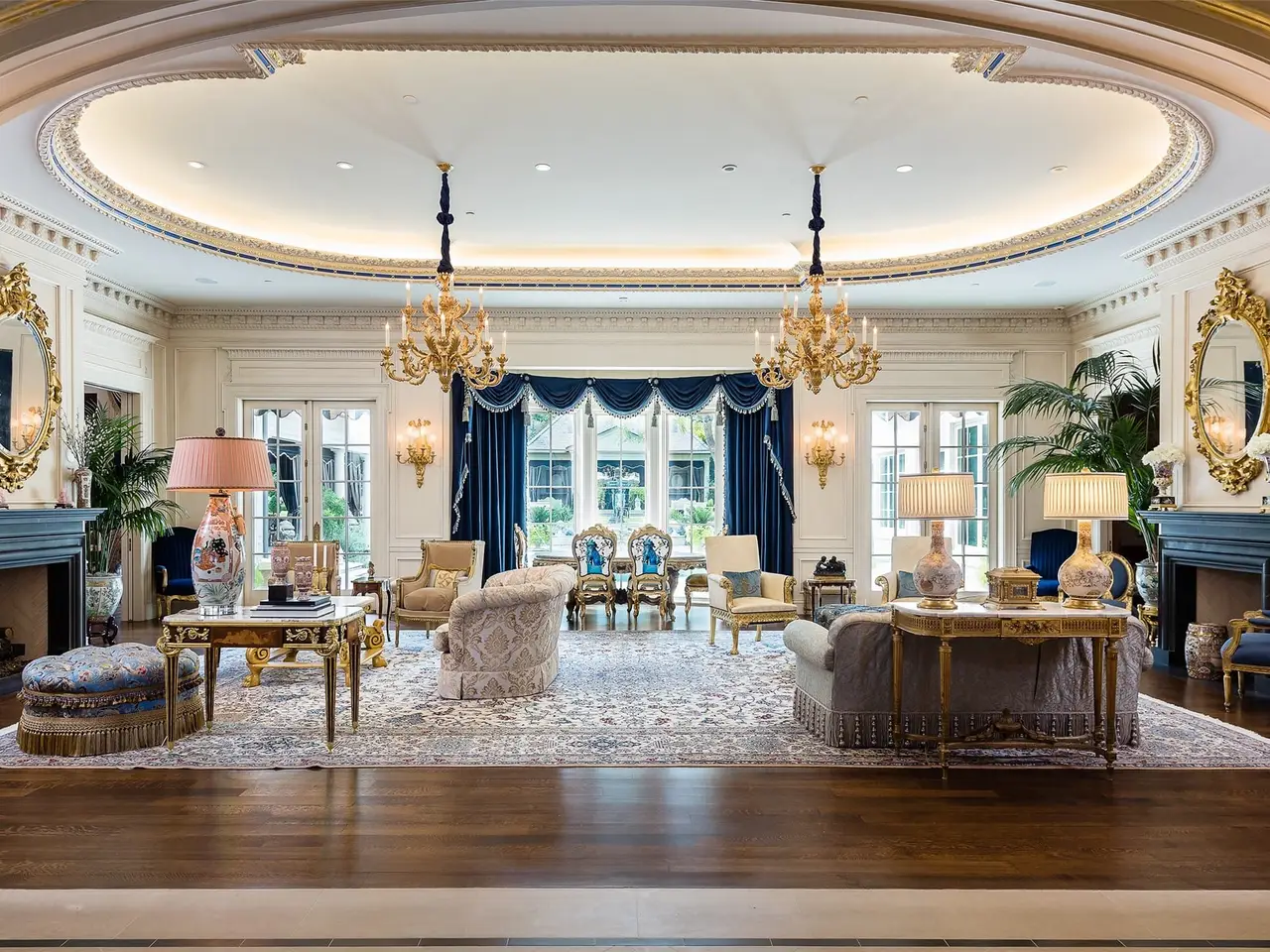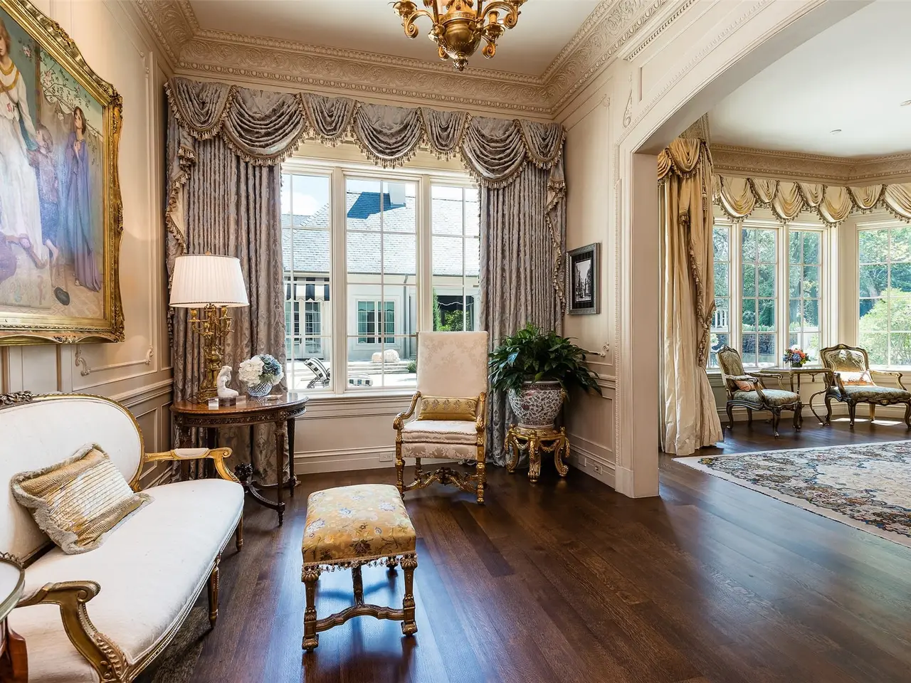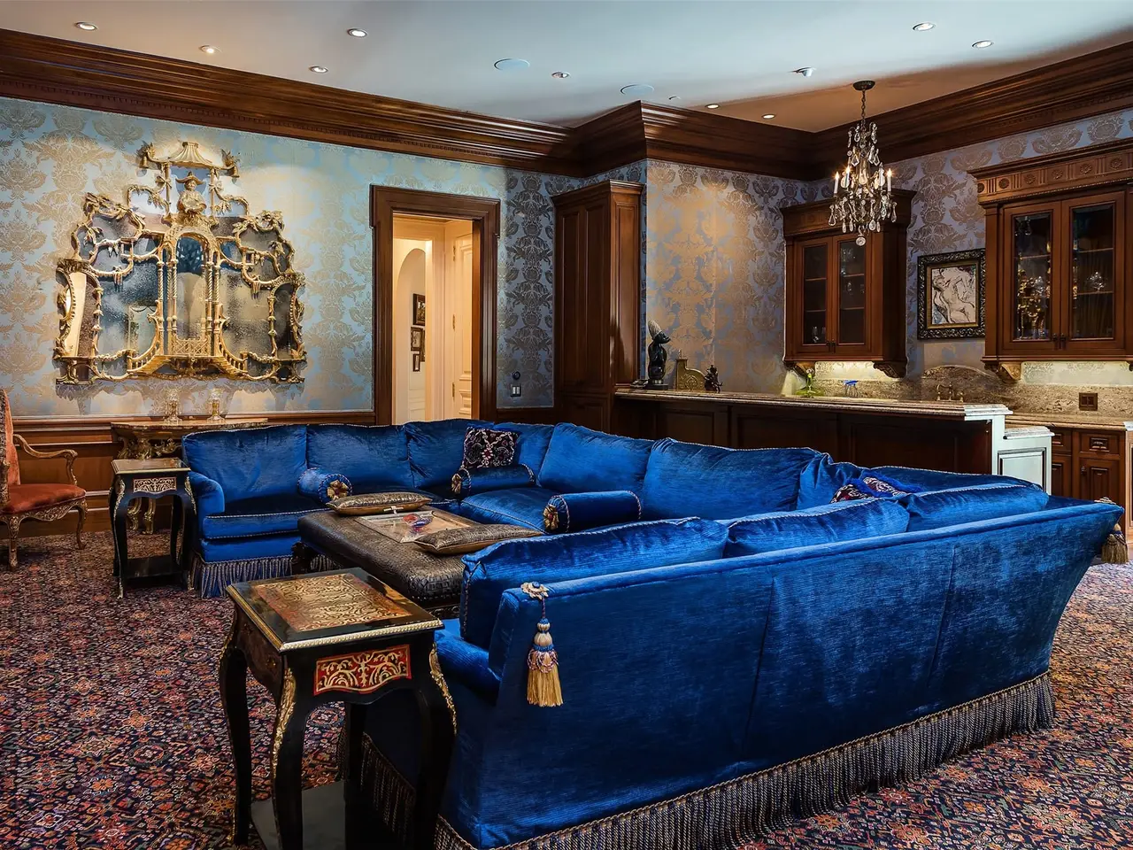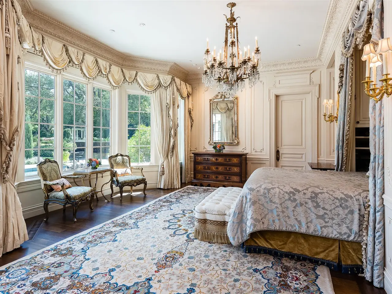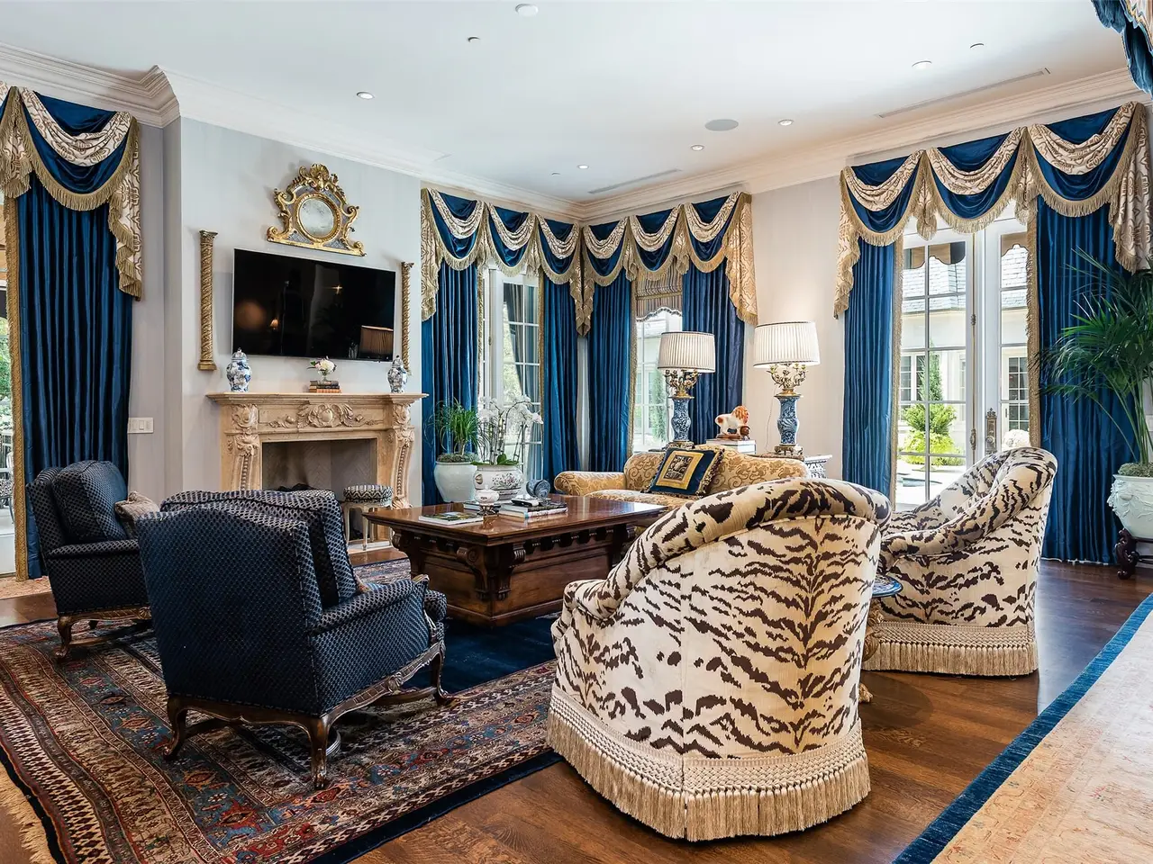 Tucked behind iron gates, this remarkable estate sits on over two acres in the heart of Old Preston Hollow. The custom 6-bedroom, 7.3-bath residence, completed in 2014, blends luxurious materials, textiles, and finishes. Spanning nearly 20,000 square feet, the French Renaissance-inspired home offers complete privacy and tranquility. A two-story domed entry features a stunning floating staircase, with marble floors in the Grand Foyer and rich mahogany moldings in the Library, Formal Study, and Media Room creating a dramatic atmosphere. The Grand Dining Room, adorned with de Gournay silk and embroidered wallpaper, offers unparalleled elegance. The gourmet kitchen includes an 8-burner Wolf range, 4 Wolf ovens, induction stovetop, and a center island, complemented by custom cabinetry. An open layout leads to a keeping room, junior dining room, and family room, which opens to a covered outdoor terrace. At the heart of the home, the Grand Hall boasts ornate plaster ceilings, two black marble fireplaces, and stunning marble medallions. The Media Room is a sports enthusiast's dream, with 5 televisions, a 120' drop-down screen, and a full wet bar. The main level Master Suite includes a private sitting room and opens to a terrace with a fireplace, pool, waterfall, and cabana. His-and-hers master baths feature marble floors, separate dressing areas, including a second story additional master showroom couture closet, and a large double shower. Upstairs, 5 additional bedrooms with luxurious baths include suites with private balconies overlooking the pool and gardens. Other highlights include a Billiards Room, Game Room, Physiotherapy Room with Steam Room, and Home Gym, all accessible by elevator. For car enthusiasts, the estate offers 3 garages with 4 car lifts, providing space for 10 luxury vehicles. The grounds feature a saltwater pool, cabana, walking paths and gardens, creating a serene resort-like atmosphere.