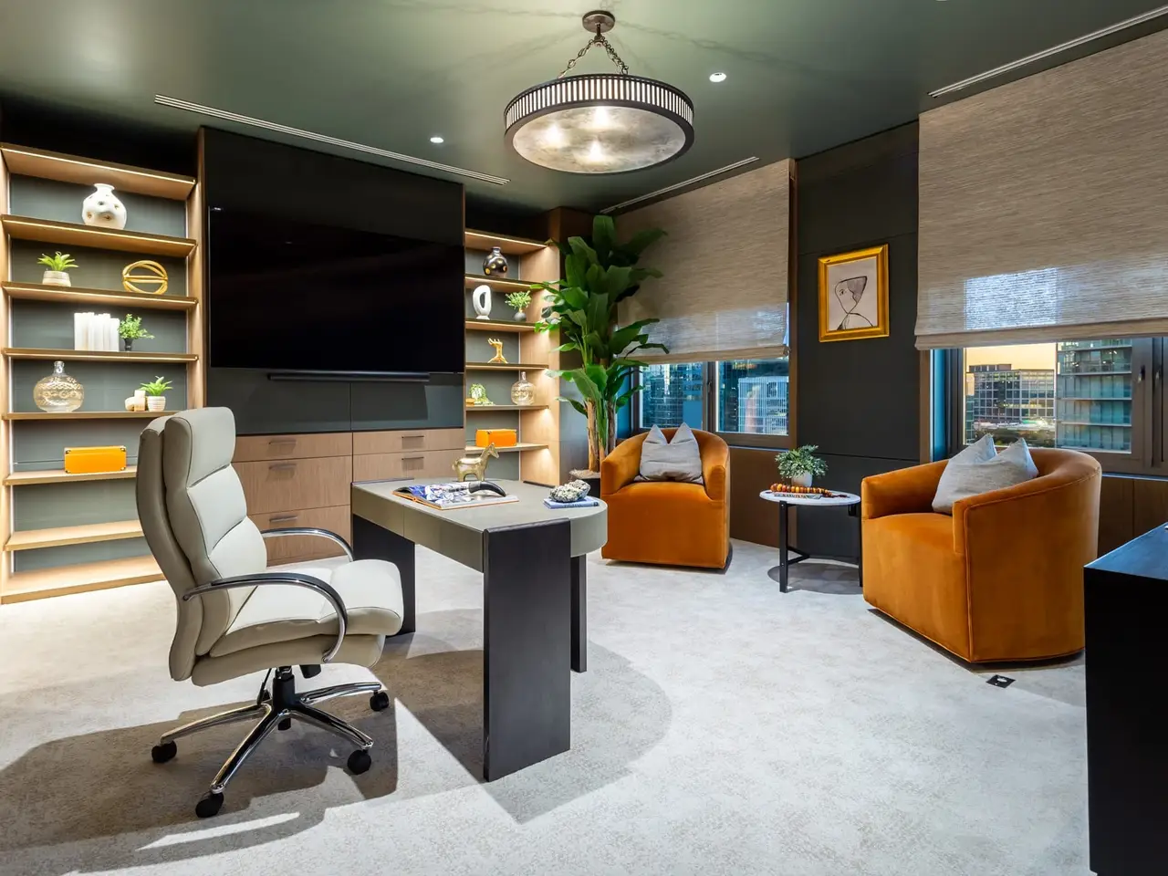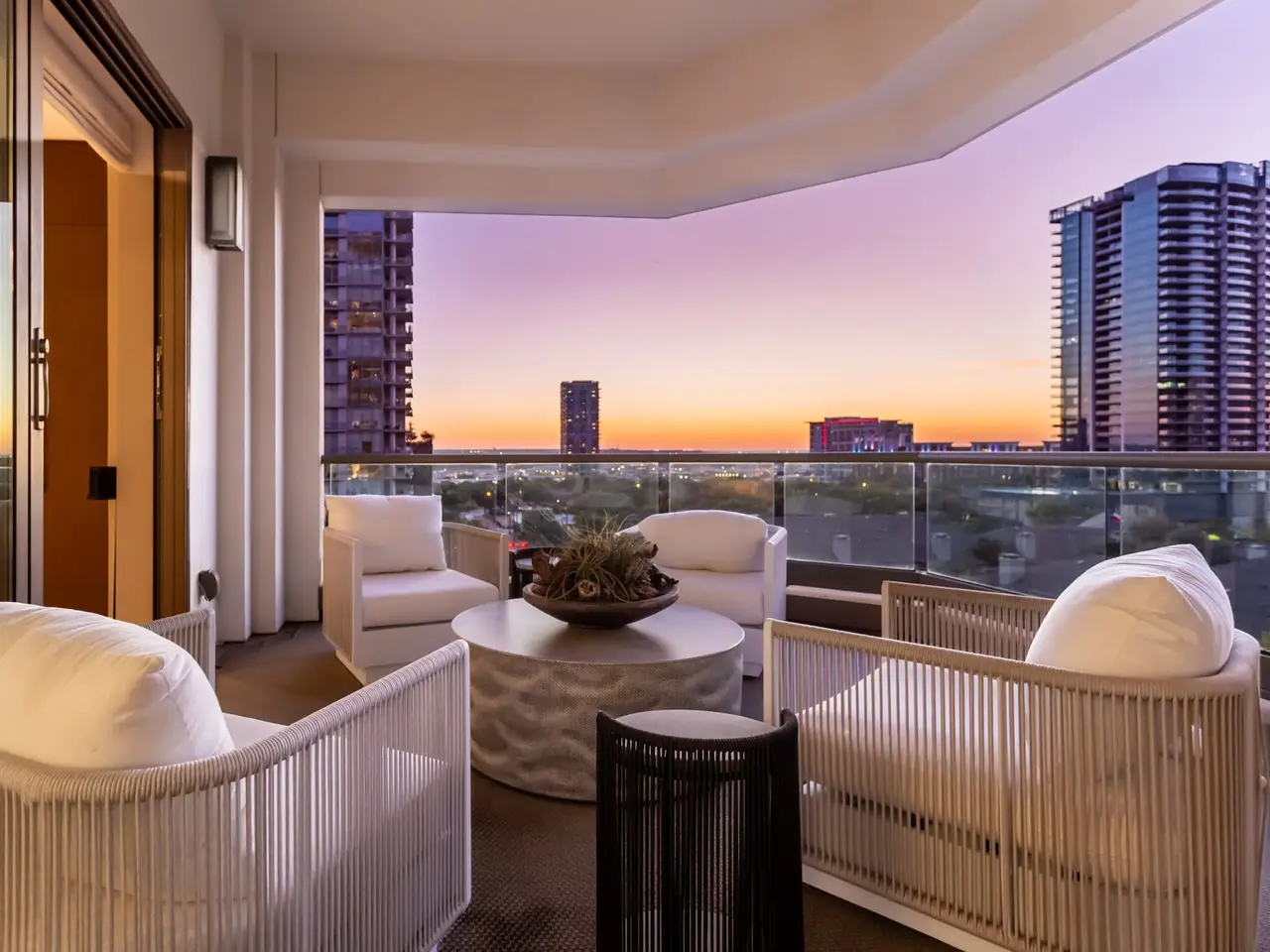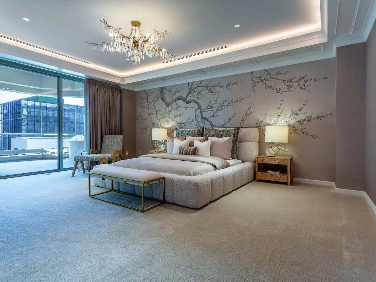 Hand-painted embroidered wallpaper in Primary Suite Spacious balconies with skyline views