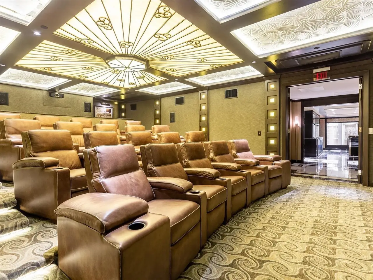 Private elevator vestibule with inlaid marble floor & double starburst wood doors Media/game room with leather walls & built-ins
