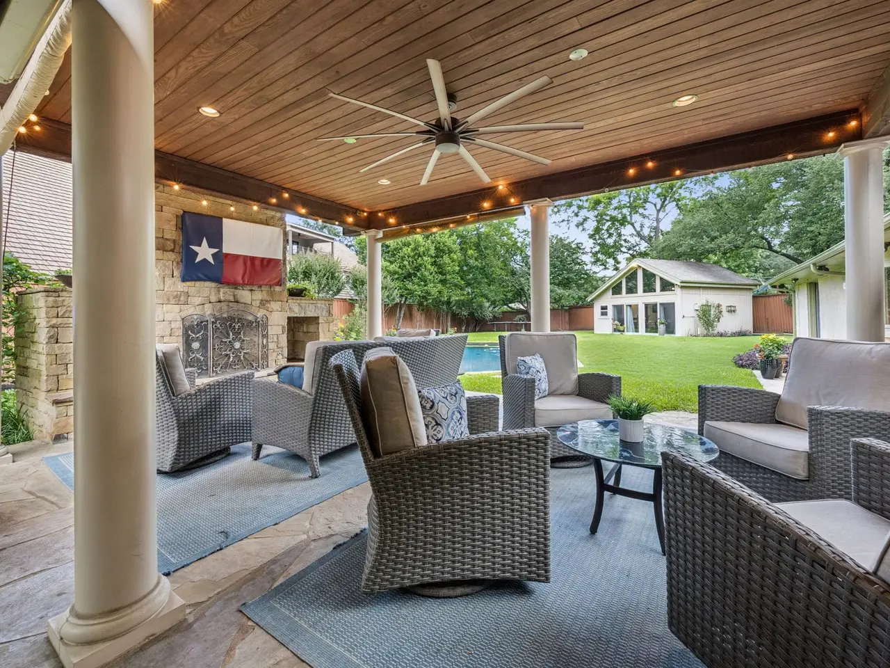 Discover timeless elegance and everyday comfort in this beautifully updated single-story ranch home, ideally situated on nearly half an acre in a quiet cul-de-sac in the heart of Preston Hollow's Windsor Park neighborhood. The open-concept layout features a spacious island kitchen and breakfast nook that flow seamlessly into a vaulted living room with wood beam accents and a gas log fireplace. A private office and formal dining room offer flexible spaces for work or entertaining, while a thoughtful split floor plan provides exceptional privacy. The expansive primary suite includes dual walk-in closets and additional wardrobe storage, with two guest bedrooms nearby. A separate guest suite and a private game room, easily used as a fifth bedroom, adds versatility. Practical highlights include an oversized mudroom, abundant storage, and a oversized two-car garage. The lush backyard retreat is perfect for relaxing or entertaining, with a sparkling pool, covered patio with fireplace, and a full guest house complete with kitchen, bathroom, and Murphy bed.