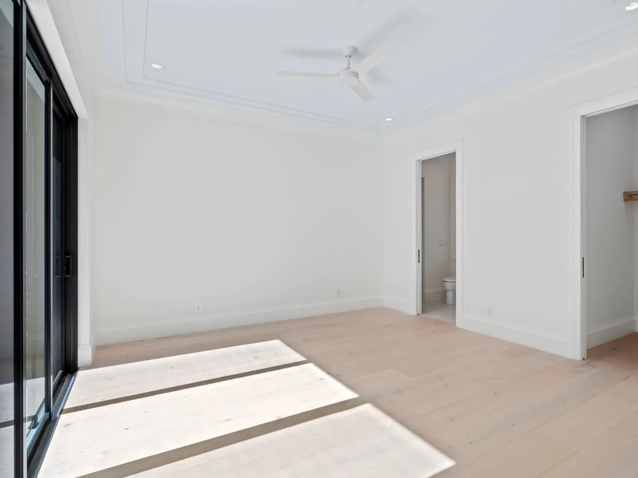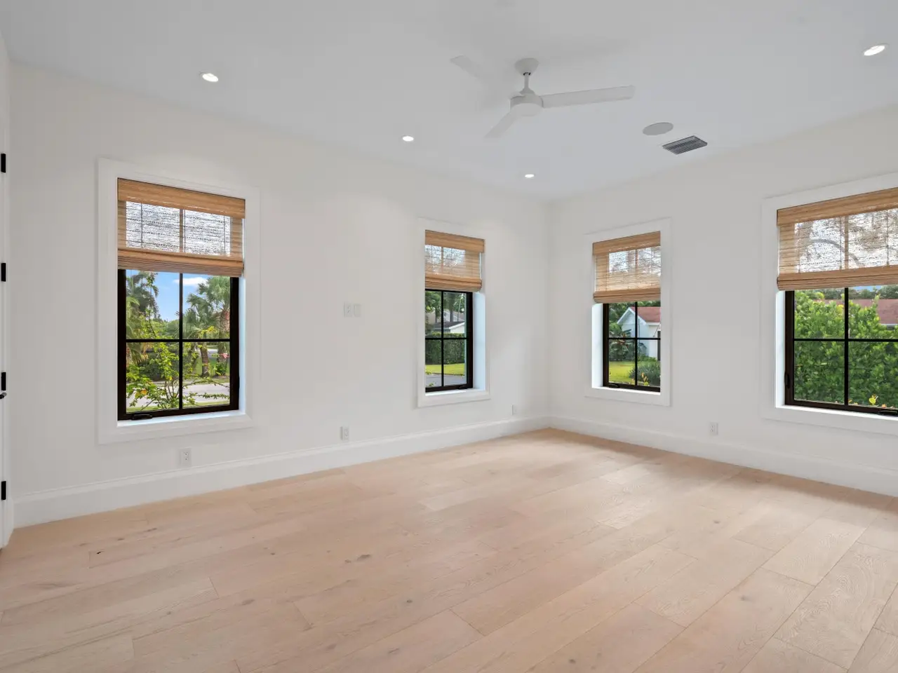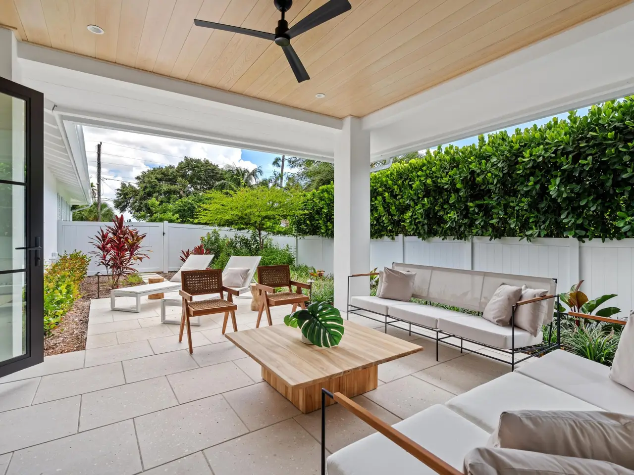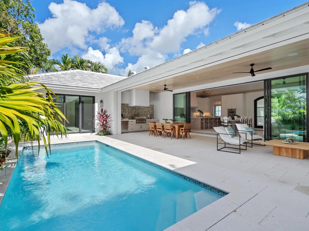 On a prime corner lot in Delray Beach's coveted Lake Ida enclave, this chic 2025-built contemporary residence offers an open floorplan great room, topped by a beamed vaulted ceiling, accessing the pool loggia and summer kitchen; four bedrooms with the primary bedroom opening to a private covered patio, a pocket office; and a cook-island kitchen with two-tone cabinetry, quartz counters and Thermador appliances.