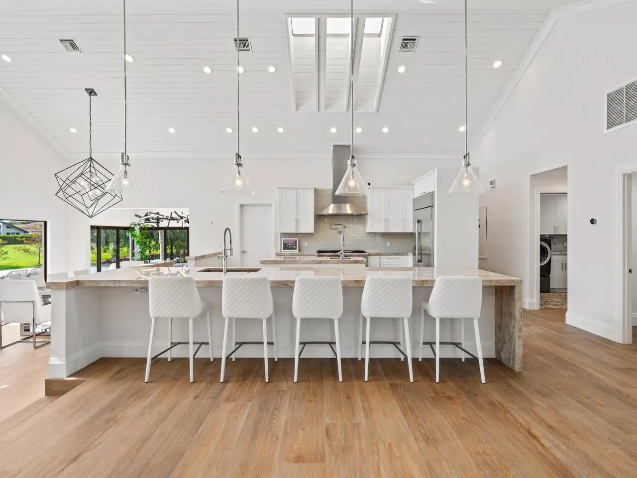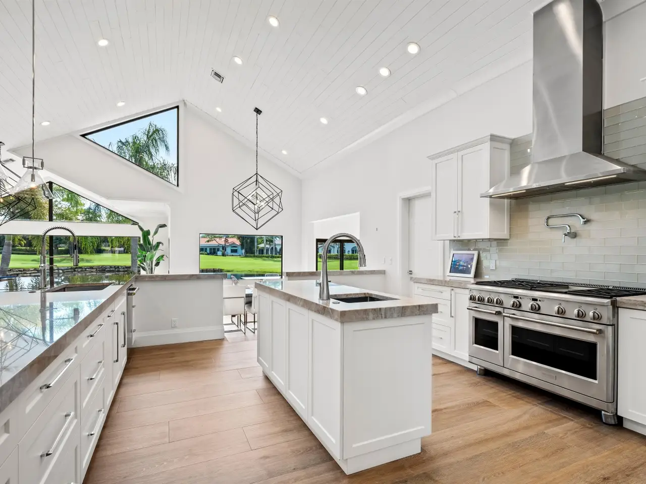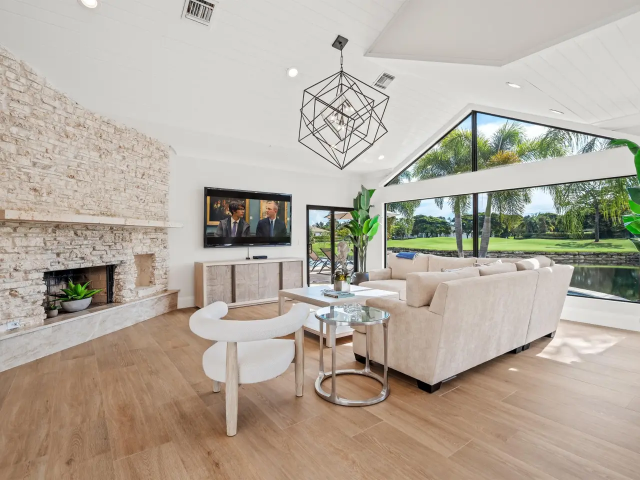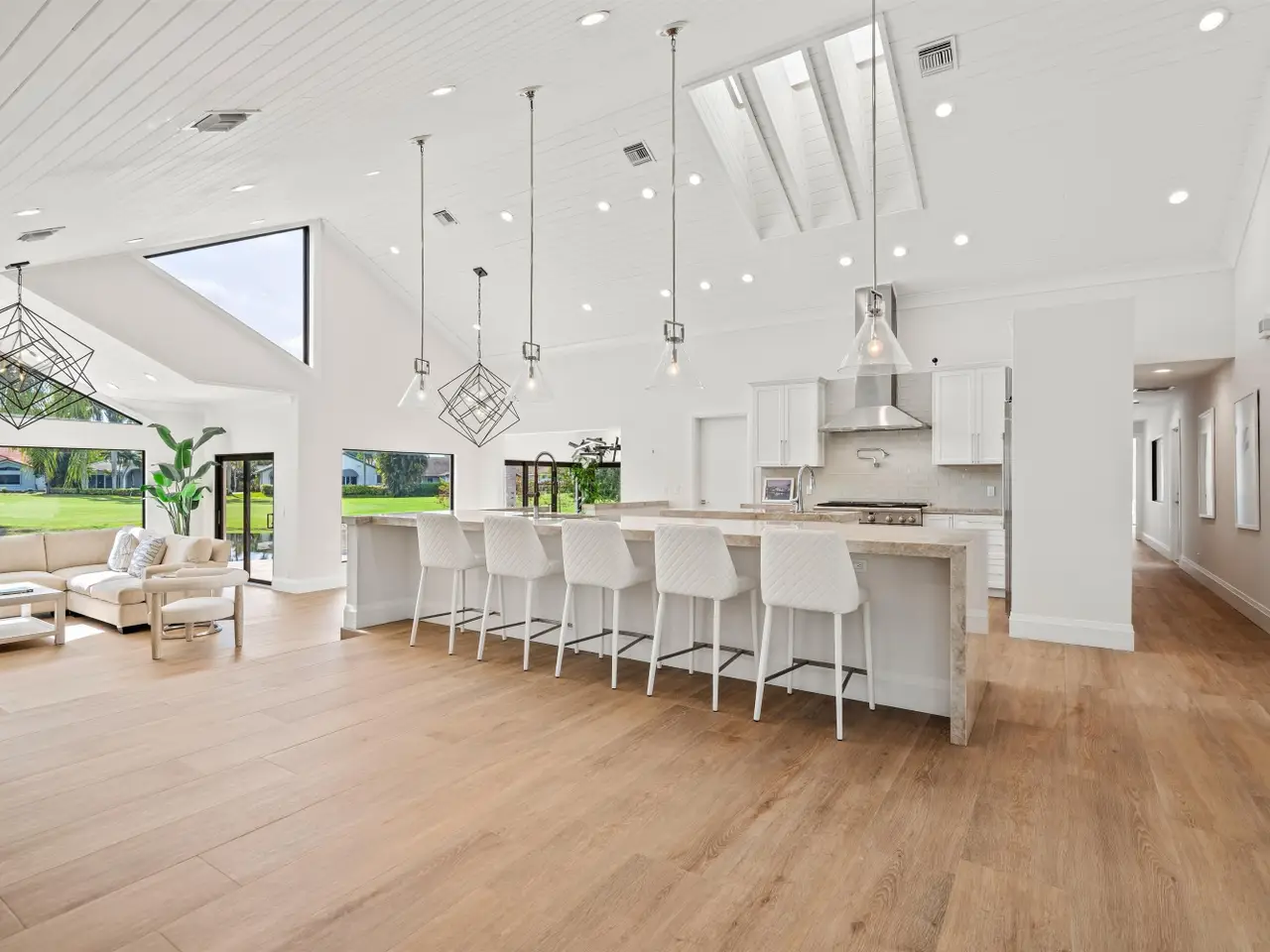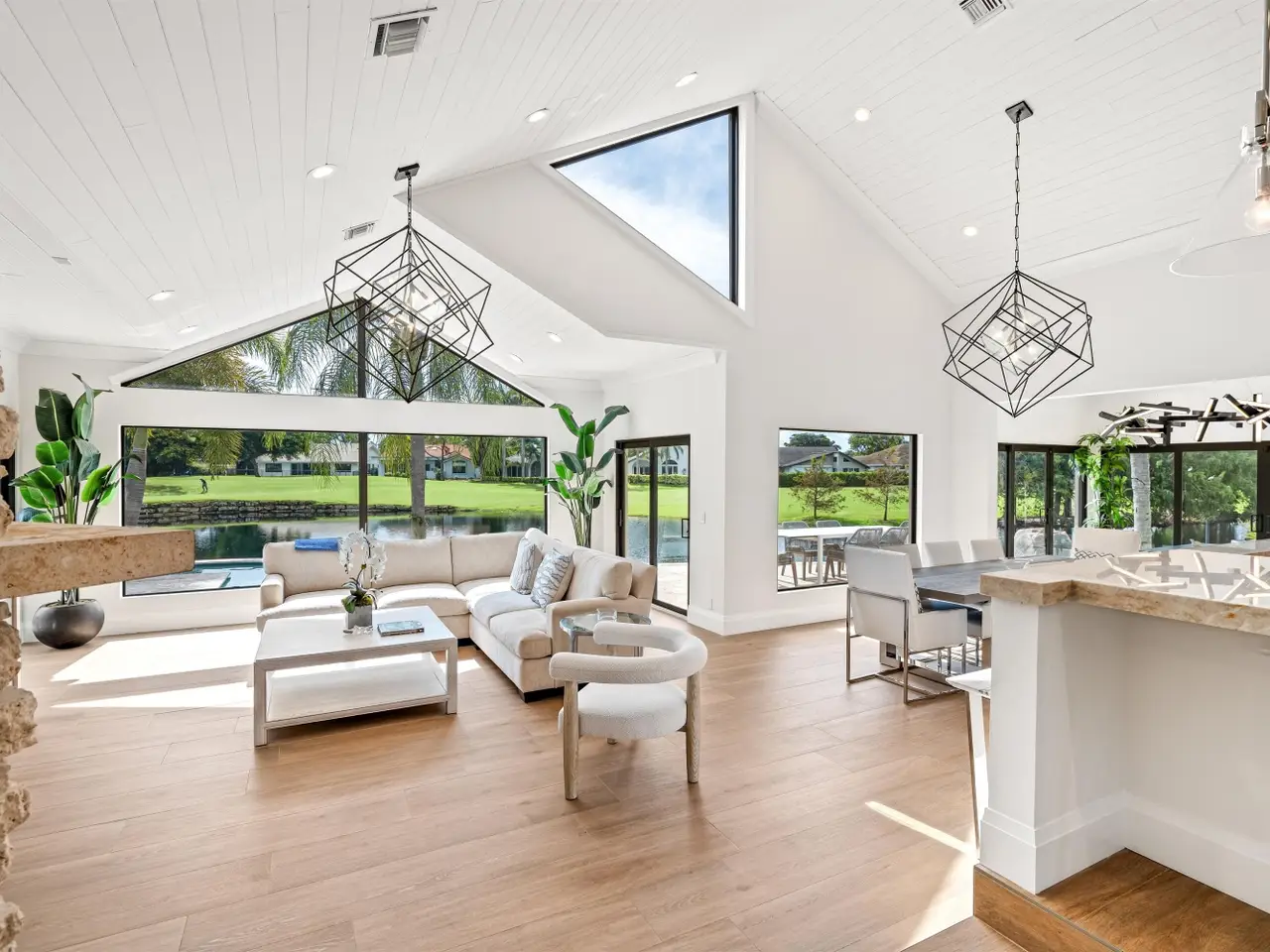 Enveloped within the beauty of its natural setting and defined by luxury, this completely remodeled East Coast style residence captures tranquil panoramic lake and fairway views as well as beautifully manicured fairway vistas from every room. With four bedrooms and spanning 4,714+/- total square feet, details throughout include dramatic tongue-and-groove vaulted ceilings punctuated by skylights, wide-plank washed-oak imported porcelain flooring, and window-walls of impact glass throughout. From the double-door entry, an inviting lounge, with a built-in bar topped by quartzite and featuring a refrigerated wine tower, introduces the dramatic open-floorplan living area of this spectacular residence. The chic great room features tongue and grooved wood vaulted ceiling, a wood-burning