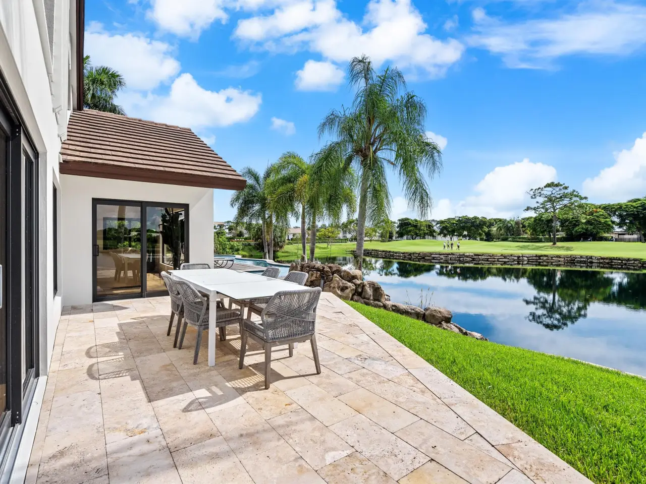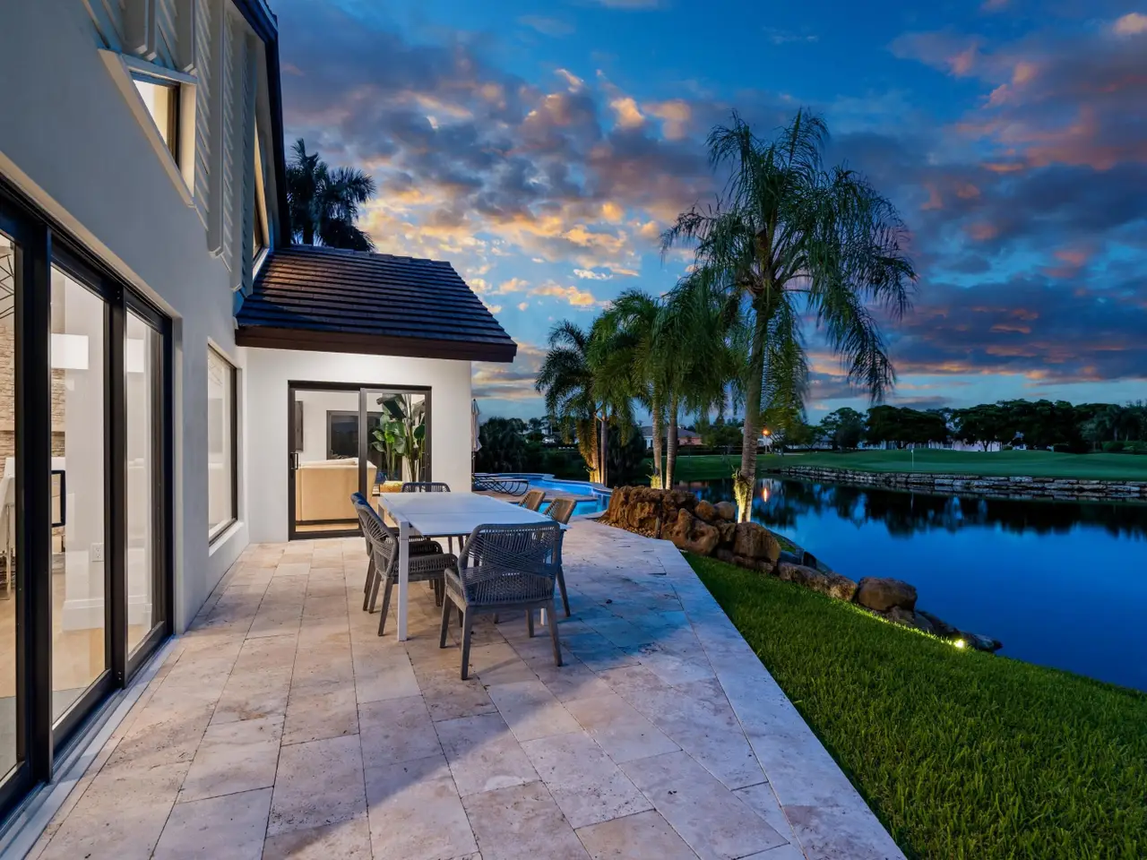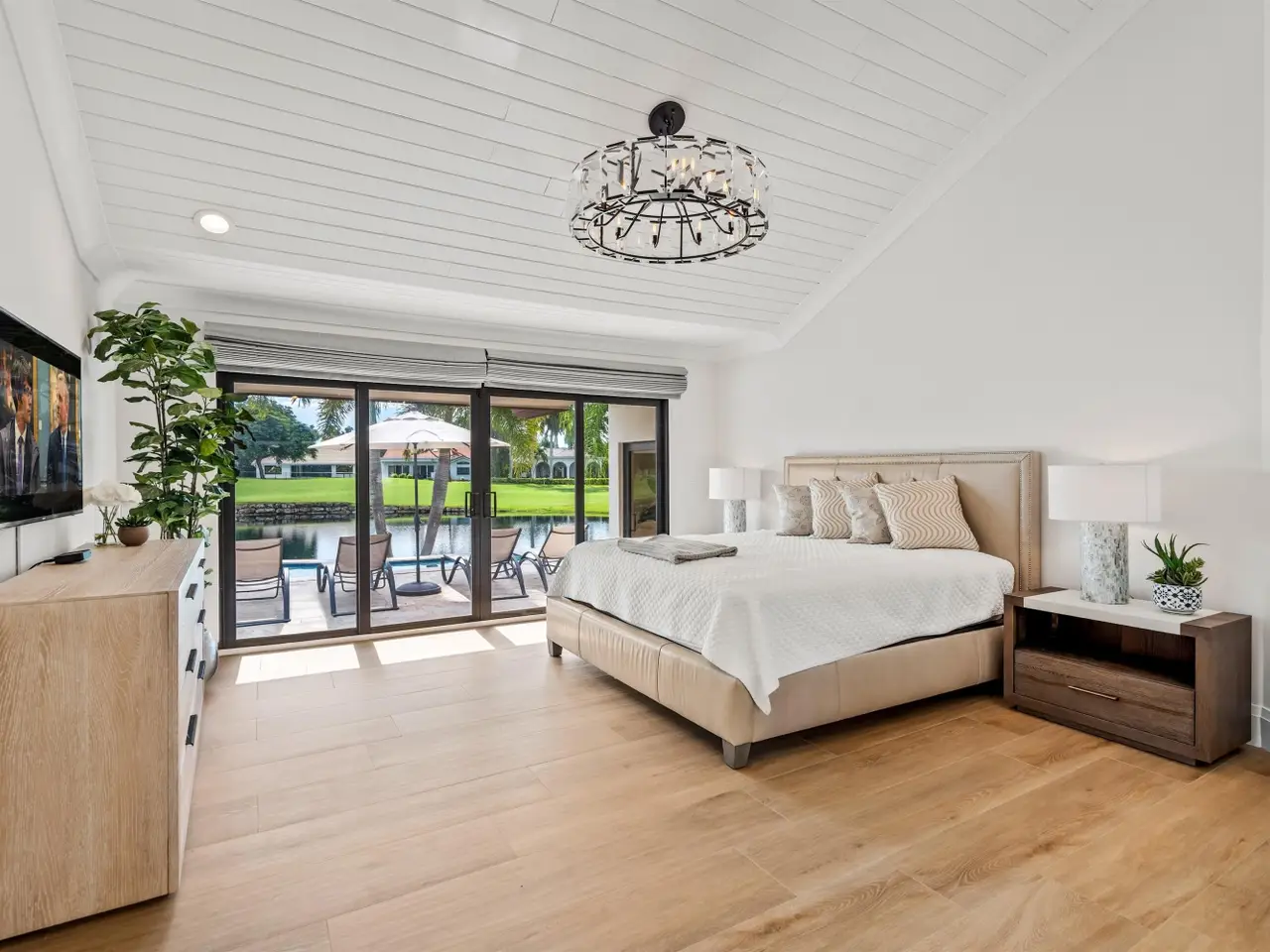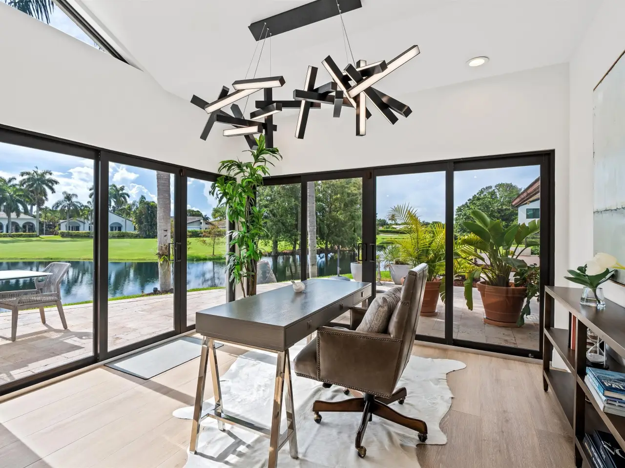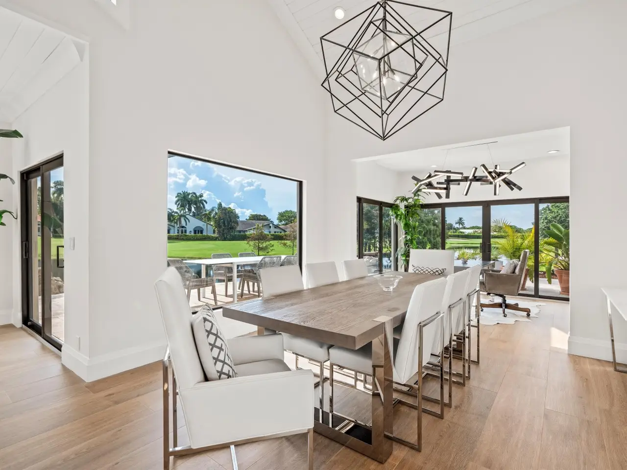 Enveloped within the beauty of its natural setting and defined by luxury, this completely remodeled East Coast style residence captures tranquil panoramic lake and fairway views as well as beautifully manicured fairway vistas from every room. With four bedrooms and spanning 4,714+/- total square feet, details throughout include dramatic tongue-and-groove vaulted ceilings punctuated by skylights, wide-plank washed-oak imported porcelain flooring, and window-walls of impact glass throughout. From the double-door entry, an inviting lounge, with a built-in bar topped by quartzite and featuring a refrigerated wine tower, introduces the dramatic open-floorplan living area of this spectacular residence. The chic great room features tongue and grooved wood vaulted ceiling, a wood-burning