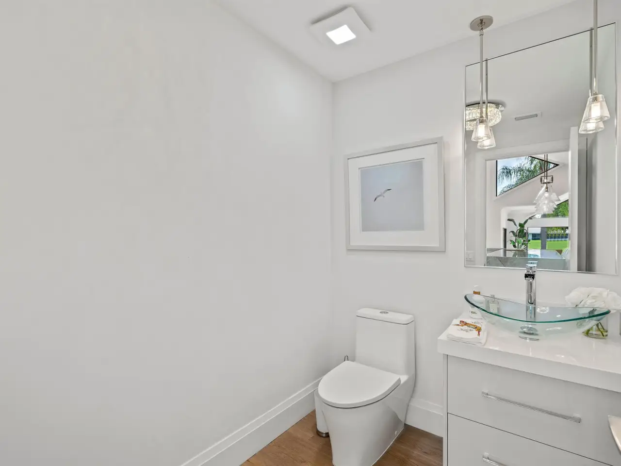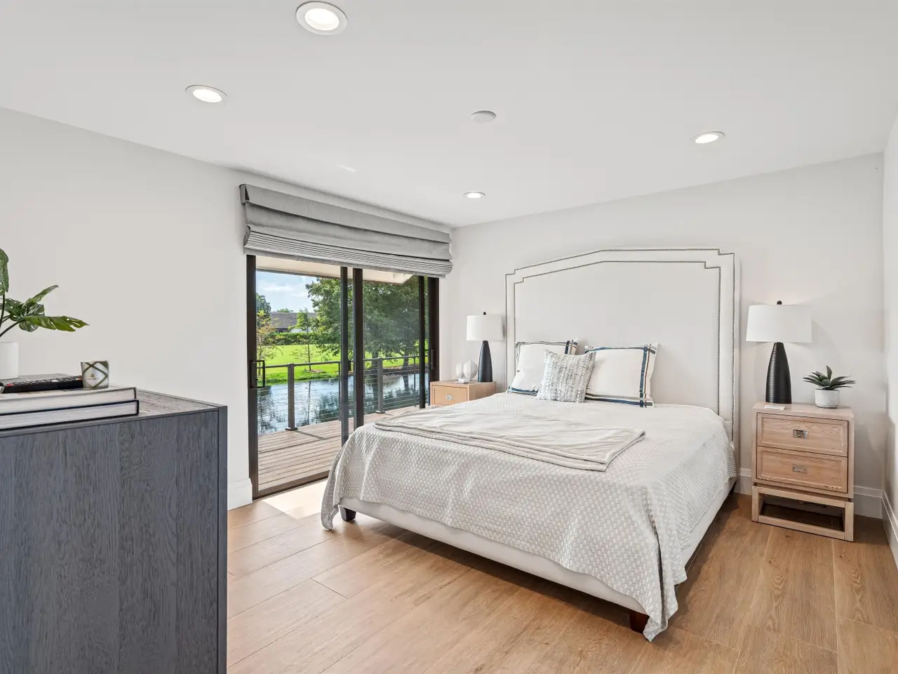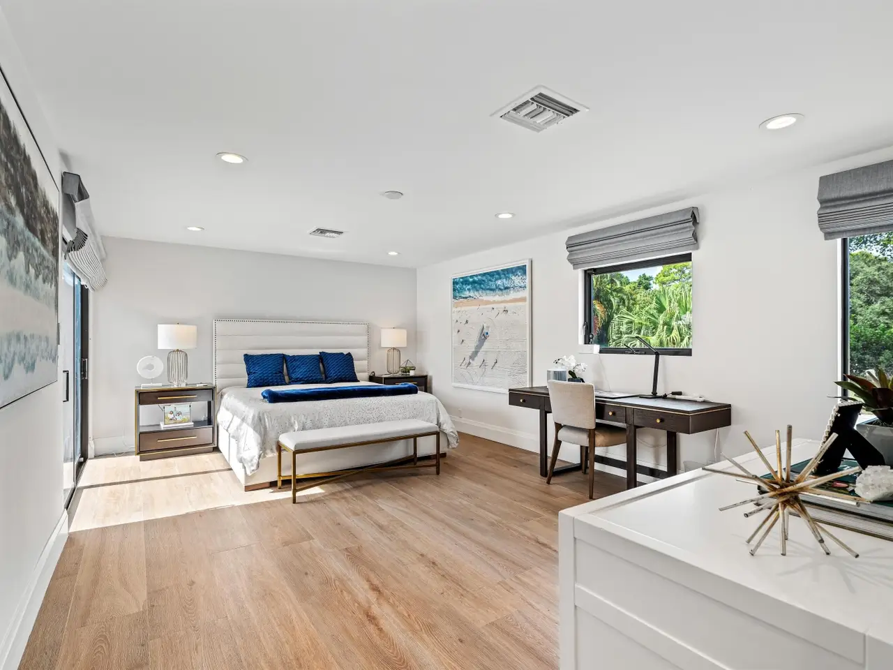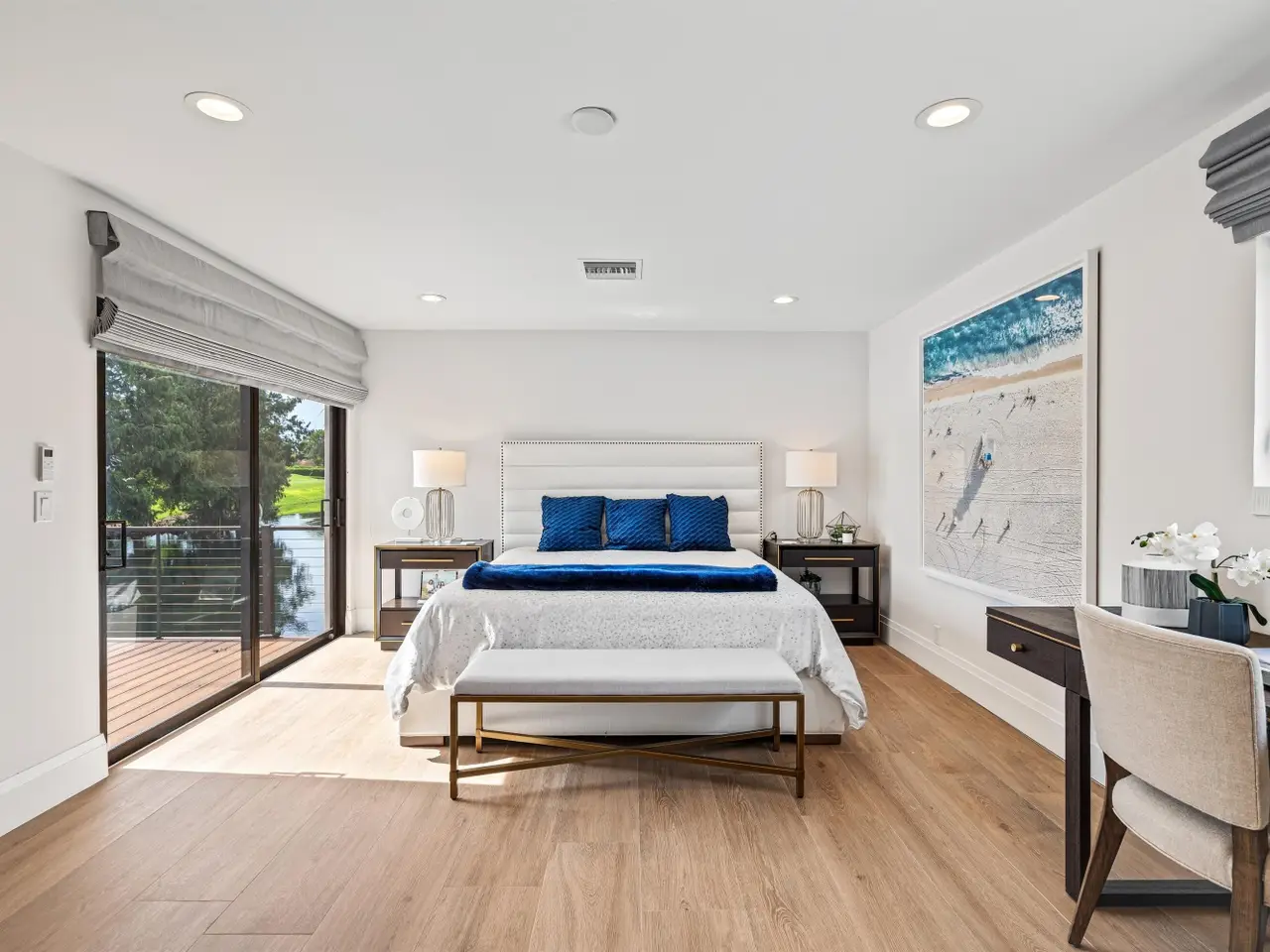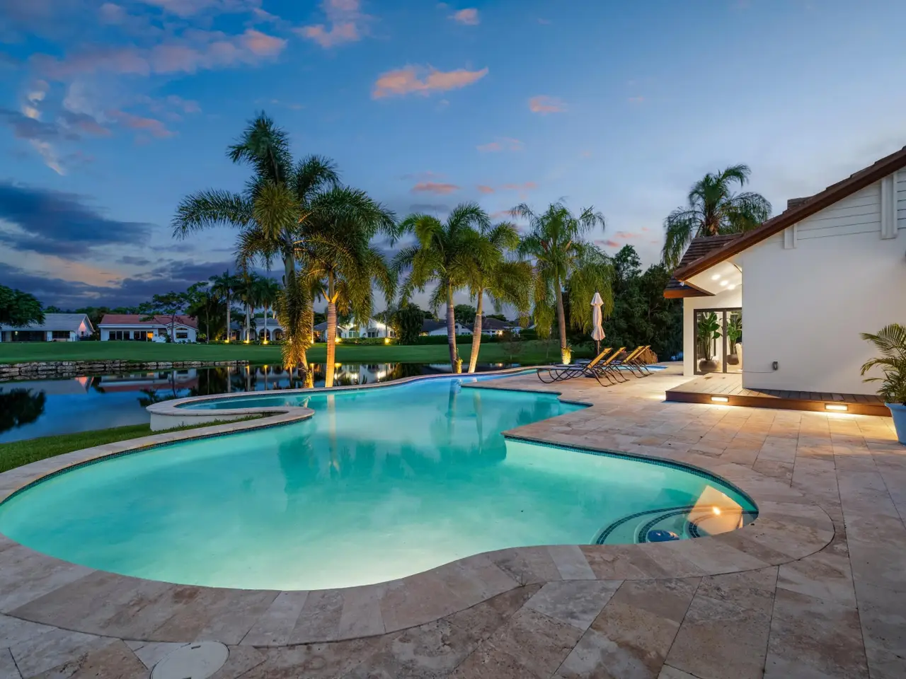 Enveloped within the beauty of its natural setting and defined by luxury, this completely remodeled East Coast style residence captures tranquil panoramic lake and fairway views as well as beautifully manicured fairway vistas from every room. With four bedrooms and spanning 4,714+/- total square feet, details throughout include dramatic tongue-and-groove vaulted ceilings punctuated by skylights, wide-plank washed-oak imported porcelain flooring, and window-walls of impact glass throughout. From the double-door entry, an inviting lounge, with a built-in bar topped by quartzite and featuring a refrigerated wine tower, introduces the dramatic open-floorplan living area of this spectacular residence. The chic great room features tongue and grooved wood vaulted ceiling, a wood-burning