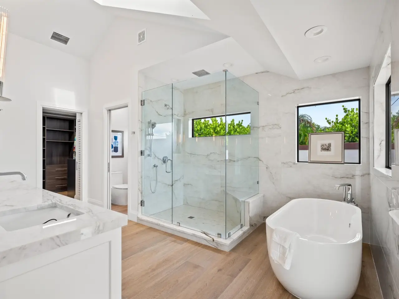 Dramatic tongue-and-groove vaulted ceilings with skylights