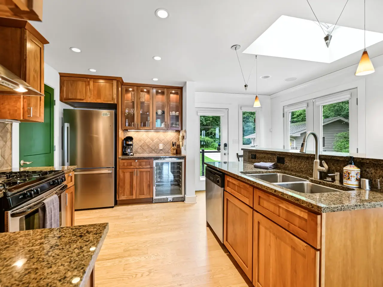 Imagine beginning your day with the breathtaking views of Eagle Lake, presenting a remarkable lakeside living experience. You can enjoy the final days of summer on your 87-foot flat lot, which offers stunning water views from a spacious, modern deck and a newly constructed pier with an expanded platform. Inside, you will find an inviting layout with a kitchen that features a large island, granite countertops, a tiled backsplash, stainless steel appliances, and attractive hardwood flooring. Enjoy the abundance of natural light from the numerous windows and new patio doors that showcase the beautiful lake perspectives from every angle. Two primary bedroom suites, situated on different levels, provide a wonderful sense of privacy for residents. The upstairs suite boasts a private balcony, a gas fireplace, and vaulted ceilings that enhance your appreciation of the peaceful lake views.
