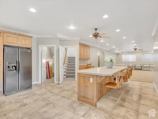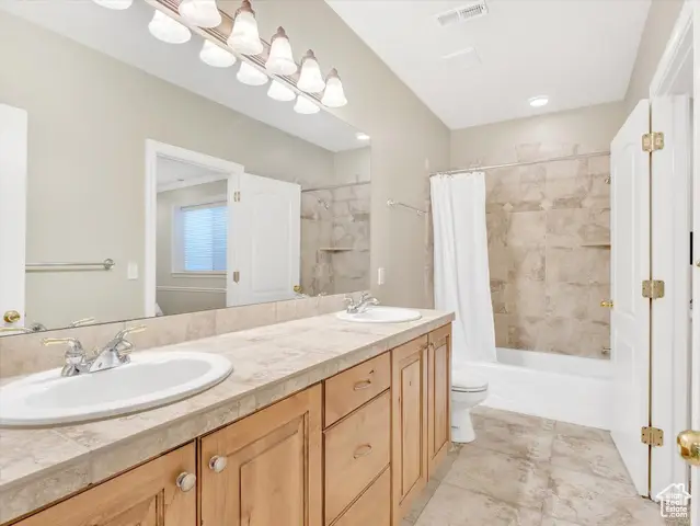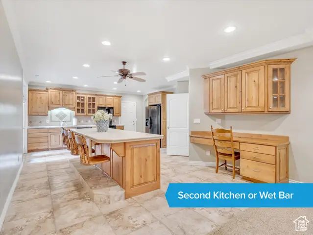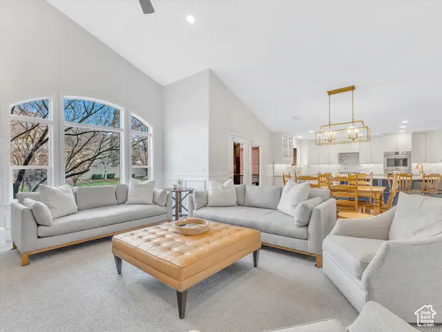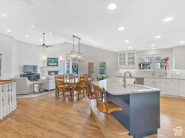 Don't miss this spectacular luxury residence! Situated on a stunning .46-acre estate in one of Draper's most sought-after neighborhoods, this exceptional property offers sweeping mountain views and a central location that strikes the perfect balance between Salt Lake City and Utah Valley. With easy access to top-rated schools, including Corner Canyon High School, as well as premier shopping, dining, and world-class ski resorts, this estate is ideally positioned to enjoy the best of both worlds. Residents will appreciate the proximity to Draper's renowned parks and trail system, with Willow Creek Trail access from the neighborhood leading to Draper City Park. Upon entering, you are greeted by an inviting foyer featuring a striking brushed gold chandelier and a shiplap-lined ceiling, which sets the tone for the home's sophisticated design. Adjacent to the foyer, the elegant living room offers a serene space to unwind, highlighted by a beautifully coved shiplap-lined ceiling. The main floor is enhanced with quality upgrades, including rich hardwood floors, vaulted ceilings, picture frame wainscoting accents, crown molding, new designer light fixtures, and a convenient central vacuum system. The well-appointed gourmet kitchen is a true centerpiece, with custom white cabinetry, quartz countertops, and a matching quartz backsplash. Equipped with a gas range, stainless steel appliances, a double oven, and a spacious center island with counter seating and a prep sink, it's both functional and stylish. The adjoining dining area offers a charming space for meals, with a walk-out door leading to the covered deck and professionally landscaped yard. The great room is designed for relaxation, featuring a cozy gas fireplace with a custom mantel and a striking shiplap hearth. On the main floor, you'll also find three thoughtfully designed bedrooms, two full bathrooms, a large laundry room with a sink, and a mudroom area. The grand primary suite is a true retreat, boasting a tray ceiling, a bay window, intricate molding, and an expansive walk-in closet. The spa-like primary bathroom offers a jetted tub, a separate shower, a double vanity with sleek quartz countertops, and a private commode room. The finished daylight basement, with 9-foot ceilings, is a versatile space that could easily function as an accessory dwelling unit (ADU). It includes a fully equipped kitchen, two bedrooms, a large recreation room, a full bathroom, and an additional three-quarter bathroom. The basement also features a second fireplace with a stone hearth, as well as a walk-out door to the yard and a private basement entrance connecting to the garage. An added bonus is the charming play nook for children. The property's outdoor spaces are equally impressive, with lush landscaping, raised stone flower beds, mature trees, and landscape lighting that create a serene and picturesque environment. Enjoy mountain views from the beautifully landscaped yard, which also includes a gazebo with lights, a large patio area, and a storage shed. The fully fenced yard has ample space for outdoor activities, with potential room for a pool and a pickleball court. The oversized three-car garage is thoughtfully designed with extra depth, providing plenty of storage space while still offering room for vehicles. This residence provides a truly exceptional living experience in one of Draper's premier neighborhoods.